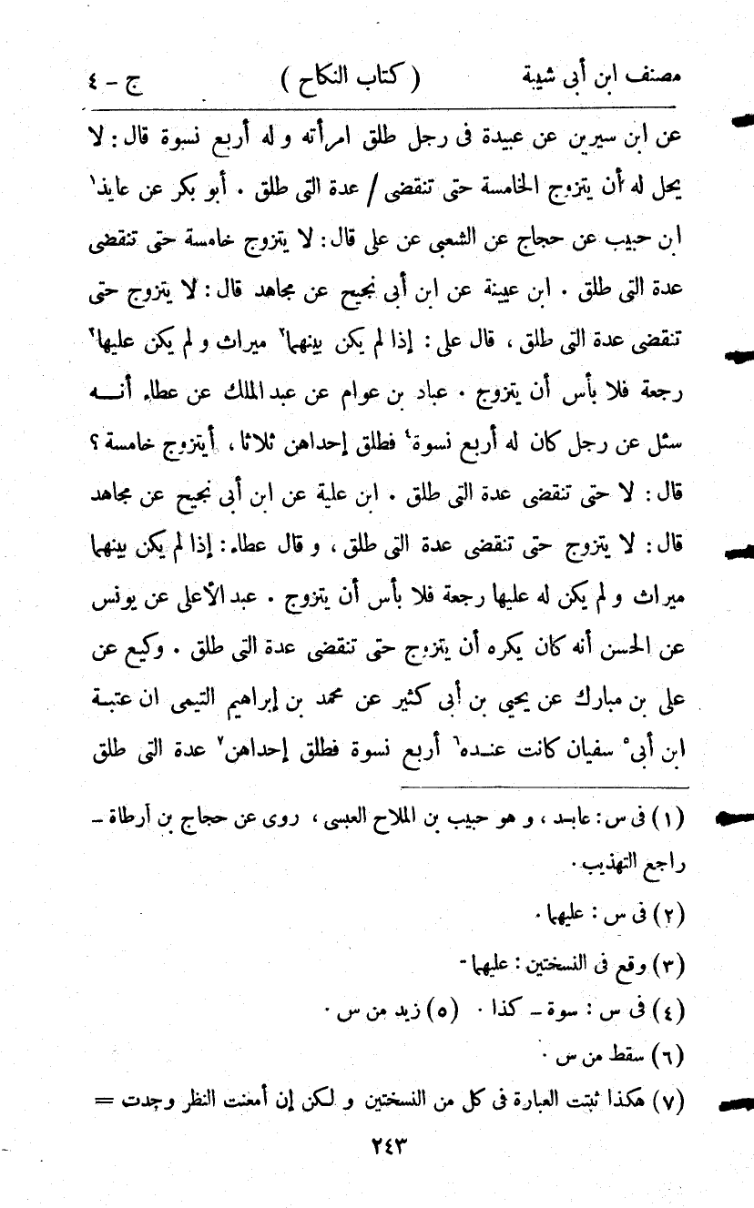 17011- حَدَّثَنَا عَبَّادُ بْنُ عَوَّامٍ , عَنْ عَبْدِ الْمَلِكِ , عَنْ عَطَاءٍ أَنَّهُ سُئِلَ عَنْ رَجُلٍ كَانَ لَهُ أَرْبَعُ نِسْوَةٍ فَطَلَّقَ إحْدَاهُنَّ ثَلاَثًا ، أَيَتَزَوَّجُ خَامِسَةً ؟ قَالَ : لاَ حَتَّى تَنْقَضِيَ عِدَّةُ الَّتِي طَلَّقَ.