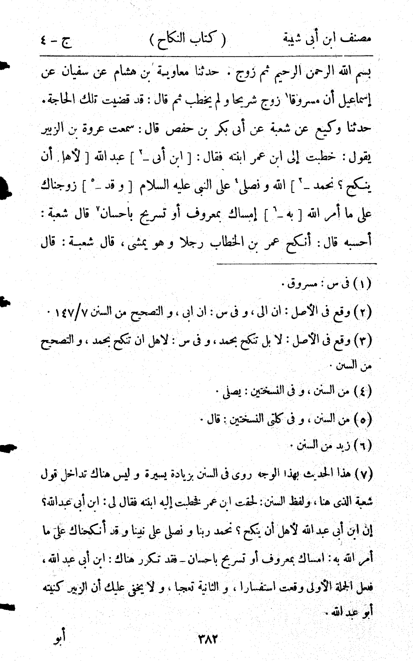17802- حَدَّثَنَا وَكِيعٌ , عَنْ شُعْبَةَ , عَنْ أَبِي بَكْرٍ بْنِ حَفْصٍ ، قَالَ : سَمِعْتُ عُرْوَةَ بْنَ الزُّبَيْرِ يَقُولُ : خَطَبْت إلَى ابْنِ عُمَرَ ابْنَتَهُ , فَقَالَ : إِنَّ ابْنَ أَبِي عَبْدِ اللهِ لأَهْلٌ أَنْ يُنْكَحَ ؟ نَحْمَدُ اللَّهَ وَنُصَلِّي عَلَى النَّبِيِّ صلى الله عليه وسلم , وَقَدْ زَوَّجْنَاك عَلَى مَا أَمَرَ اللَّهُ : {إمْسَاكٌ بِمَعْرُوفٍ ، أَوْ تَسْرِيحٌ بِإِحْسَانٍ} قَالَ : شُعْبَةُ : أَحْسَبُهُ قَالَ : أَنْكَحَ عُمَرُ بْنُ الْخَطَّابِ رَجُلاً وَهُوَ يَمْشِي ، قَالَ : شُعْبَةُ : قَالَ أَبُو بَكْرِ بْنُ حَفْصٍ : لاَ أَدْرِي الَّذِي قَالَ : أَحْسَبُهُ عُرْوَةُ بْنُ الزُّبَيْرِ أَوِ ابْنُ عُمَرَ.