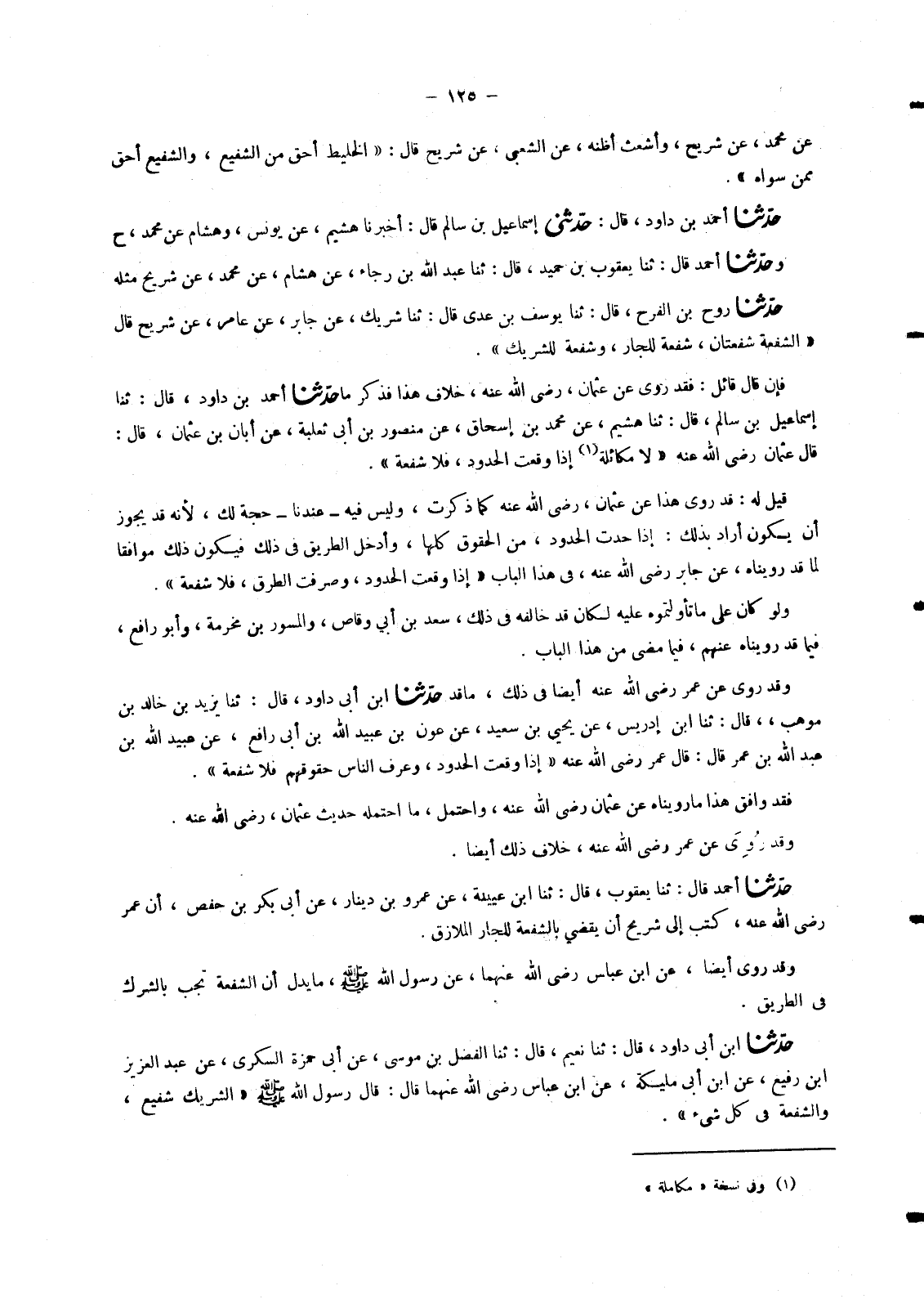 6011 - مَا حَدَّثَنَا أَحْمَدُ بْنُ دَاوُدَ قَالَ: ثنا إِسْمَاعِيلُ بْنُ سَالِمٍ قَالَ: ثنا هُشَيْمٌ عَنْ مُحَمَّدِ بْنِ إِسْحَاقَ عَنْ مَنْصُورِ بْنِ أَبِي ثَعْلَبَةَ عَنْ أَبَانَ بْنِ عُثْمَانَ قَالَ: قَالَ عُثْمَانُ رَضِيَ اللهُ عَنْهُ §لَا مُكَاءَلَةَ إِذَا وَقَعَتِ الْحُدُودُ فَلَا شُفْعَةَ قِيلَ لَهُ: قَدْ رُوِيَ هَذَا عَنْ عُثْمَانَ رَضِيَ اللهُ عَنْهُ كَمَا ذَكَرْتَ وَلَيْسَ فِيهِ عِنْدَنَا حُجَّةٌ لَكَ لِأَنَّهُ قَدْ يَجُوزُ أَنْ يَكُونَ أَرَادَ بِذَلِكَ: إِذَا حُدَّتِ الْحُدُودُ مِنَ الْحُقُوقِ كُلِّهَا وَأُدْخِلَ الطَّرِيقُ فِي ذَلِكَ فَيَكُونُ ذَلِكَ مُوَافِقًا لِمَا قَدْ رَوَيْنَاهُ عَنْ جَابِرٍ رَضِيَ اللهُ عَنْهُ فِي هَذَا الْبَابِ إِذَا وَقَعَتِ الْحُدُودُ وَصُرِفَتِ الطُّرُقُ فَلَا شُفْعَةَ. وَلَوْ كَانَ عَلَى مَا تَأَوَّلْتُمُوهُ عَلَيْهِ لَكَانَ قَدْ خَالَفَهُ فِي ذَلِكَ سَعْدُ بْنُ أَبِي وَقَّاصٍ وَالْمِسْوَرُ بْنُ مَخْرَمَةَ وَأَبُو رَافِعٍ فِيمَا قَدْ رَوَيْنَاهُ عَنْهُمْ فِيمَا مَضَى مِنْ هَذَا الْبَابِ. وَقَدْ رُوِيَ عَنْ عُمَرَ رَضِيَ اللهُ عَنْهُ أَيْضًا فِي ذَلِكَ