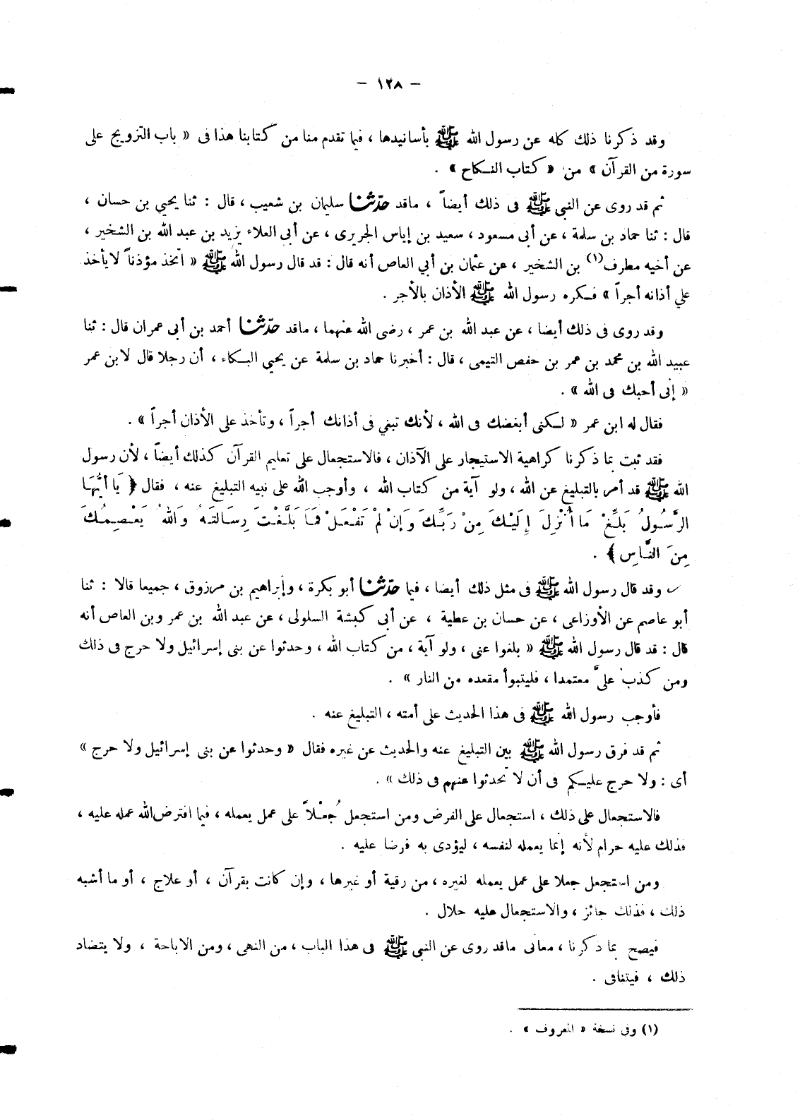6021 - حَدَّثَنَا أَبُو بَكْرَةَ وَإِبْرَاهِيمُ بْنُ مَرْزُوقٍ جَمِيعًا قَالَا: ثنا أَبُو عَاصِمٍ عَنِ الْأَوْزَاعِيِّ عَنْ حَسَّانَ بْنِ عَطِيَّةَ عَنْ أَبِي كَبْشَةَ السَّلُولِيِّ عَنْ عَبْدِ اللهِ بْنِ عَمْرِو بْنِ الْعَاصِ أَنَّهُ قَالَ: قَدْ قَالَ رَسُولُ اللهِ صَلَّى اللَّهُ عَلَيْهِ وَسَلَّمَ: «§بَلِّغُوا عَنِّي وَلَوْ آيَةً مِنْ كِتَابِ اللهِ وَحَدِّثُوا عَنْ بَنِي إِسْرَائِيلَ وَلَا حَرَجَ فِي ذَلِكَ وَمَنْ كَذَبَ عَلَيَّ مُتَعَمِّدًا فَلْيَتَبَوَّأْ مَقْعَدَهُ مِنَ النَّارِ» فَأَوْجَبَ رَسُولُ اللهِ صَلَّى اللَّهُ عَلَيْهِ وَسَلَّمَ فِي هَذَا الْحَدِيثِ عَلَى أُمَّتِهِ التَّبْلِيغَ عَنْهُ. ثُمَّ قَدْ فَرَّقَ رَسُولُ اللهِ صَلَّى اللَّهُ عَلَيْهِ وَسَلَّمَ بَيْنَ التَّبْلِيغِ عَنْهُ وَالْحَدِيثِ عَنْ غَيْرِهِ فَقَالَ وَحَدِّثُوا عَنْ بَنِي إِسْرَائِيلَ وَلَا حَرَجَ أَيْ: وَلَا حَرَجَ عَلَيْكُمْ فِي أَنْ لَا تُحَدِّثُوا عَنْهُمْ فِي ذَلِكَ. فَالِاسْتِجْعَالُ عَلَى ذَلِكَ اسْتِجْعَالٌ عَلَى الْفَرْضِ وَمَنِ اسْتَجْعَلَ جُعْلًا عَلَى عَمَلٍ يَعْمَلُهُ فِيمَا افْتَرَضَ اللهُ عَمَلَهُ عَلَيْهِ فَذَلِكَ عَلَيْهِ حَرَامٌ لِأَنَّهُ إِنَّمَا يَعْمَلُهُ لِنَفْسِهِ لِيُؤَدِّيَ بِهِ فَرْضًا عَلَيْهِ. وَمَنِ اسْتَجْعَلَ جُعْلًا عَلَى عَمَلٍ يَعْمَلُهُ لِغَيْرِهِ مِنْ رُقْيَةٍ أَوْ غَيْرِهَا وَإِنْ كَانَتْ بِقُرْآنٍ أَوْ عِلَاجٍ أَوْ مَا أَشْبَهَ ذَلِكَ فَذَلِكَ جَائِزٌ وَالِاسْتِجْعَالُ عَلَيْهِ حَلَالٌ. فَيَصِحُّ بِمَا ذَكَرْنَا مَعَانِي مَا قَدْ رُوِيَ عَنِ النَّبِيِّ صَلَّى اللَّهُ عَلَيْهِ وَسَلَّمَ فِي هَذَا الْبَابِ مِنَ النَّهْيِ وَمِنَ الْإِبَاحَةِ وَلَا يَتَضَادَّ ذَلِكَ فَيَتَنَافَى. -[129]- وَهَذَا كُلُّهُ قَوْلُ أَبِي حَنِيفَةَ وَأَبِي يُوسُفَ وَمُحَمَّدٍ رَحْمَةُ اللهِ عَلَيْهِمْ