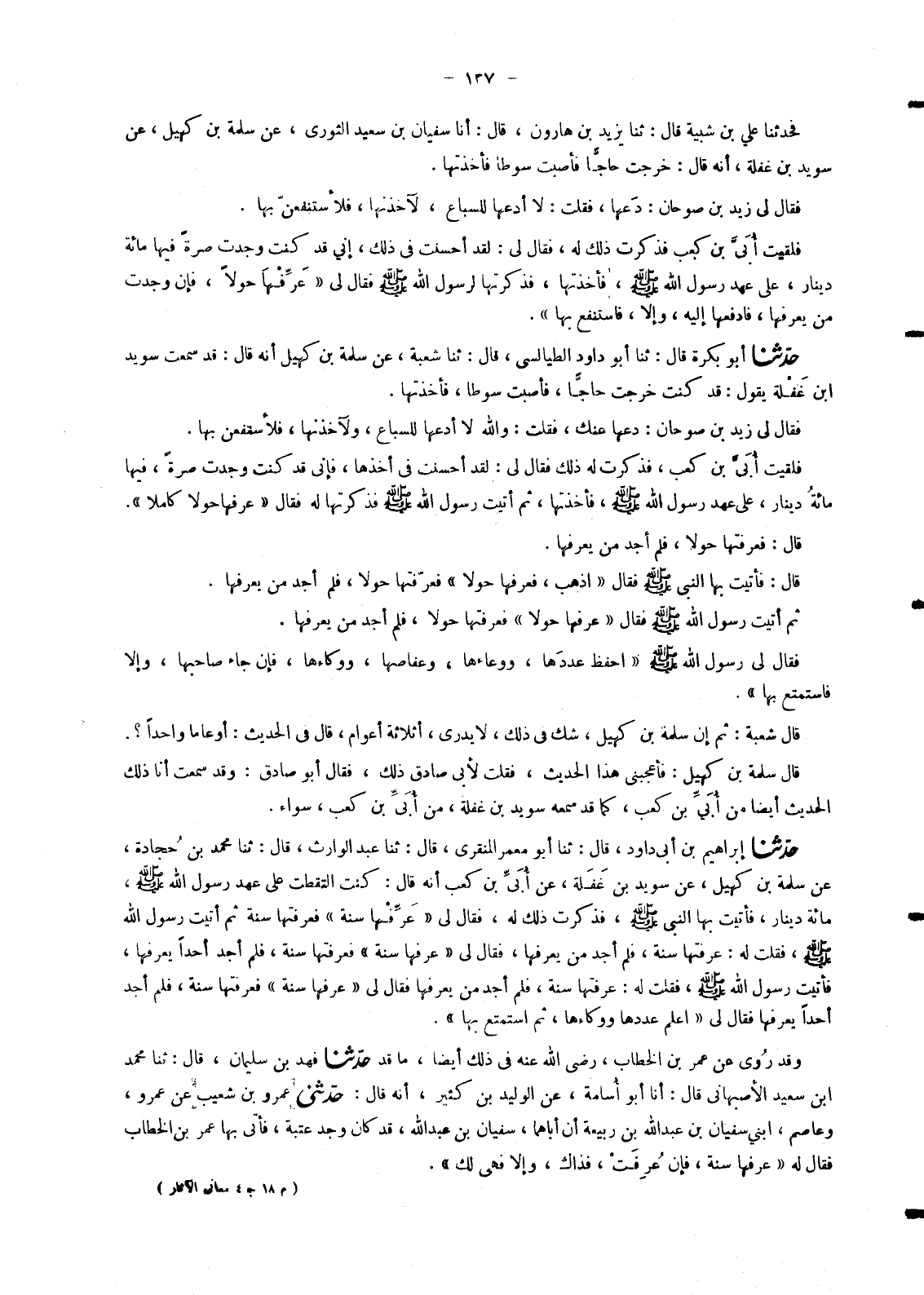 6074 - فَحَدَّثَنَا عَلِيُّ بْنُ شَيْبَةَ قَالَ: ثنا يَزِيدُ بْنُ هَارُونَ قَالَ: أنا سُفْيَانُ بْنُ سَعِيدٍ الثَّوْرِيُّ عَنْ سَلَمَةَ بْنِ كُهَيْلٍ عَنْ سُوَيْدِ بْنِ غَفَلَةَ أَنَّهُ قَالَ: خَرَجْتُ حَاجًّا فَأَصَبْتُ سَوْطًا فَأَخَذْتُهَا. فَقَالَ لِي زَيْدُ بْنُ صُوحَانَ: دَعْهَا فَقُلْتُ: لَا أَدَعُهَا لِلسِّبَاعِ لَآخُذَنَّهَا فَلِأَسْتَنْفِعَنِّ بِهَا. فَلَقِيتُ أُبَيَّ بْنَ كَعْبٍ فَذَكَرْتُ ذَلِكَ لَهُ فَقَالَ لِي: لَقَدْ أَحْسَنْتُ فِي ذَلِكَ إِنِّي قَدْ كُنْتُ وَجَدْتُ صُرَّةً فِيهَا مِائَةُ دِينَارٍ عَلَى عَهْدِ رَسُولِ اللهِ صَلَّى اللَّهُ عَلَيْهِ وَسَلَّمَ فَأَخَذْتُهَا فَذَكَرْتُهَا لِرَسُولِ اللهِ صَلَّى اللَّهُ عَلَيْهِ وَسَلَّمَ فَقَالَ لِي: «§عَرِّفْهَا حَوْلًا فَإِنْ وَجَدْتَ مَنْ يَعْرِفُهَا فَادْفَعْهَا إِلَيْهِ وَإِلَّا فَاسْتَنْفِعْ بِهَا»