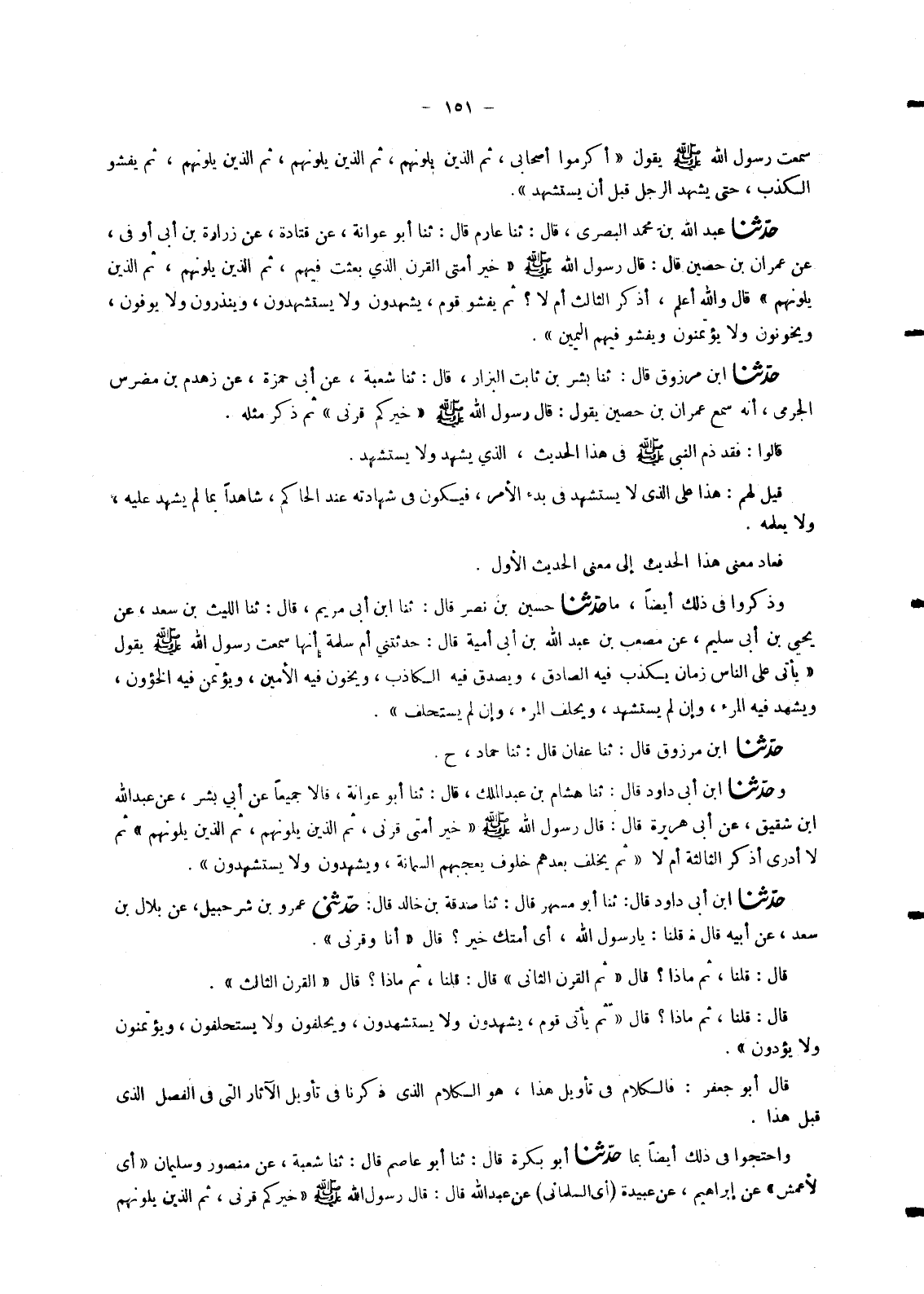 6127 - بِمَا حَدَّثَنَا أَبُو بَكْرَةَ قَالَ: ثنا أَبُو عَاصِمٍ قَالَ: ثنا شُعْبَةُ عَنْ مَنْصُورٍ وَسُلَيْمَانَ أَيِ الْأَعْمَشِ عَنْ إِبْرَاهِيمَ عَنْ عَبِيْدَةَ أَيِ السَّلْمَانِيِّ عَنْ عَبْدِ اللهِ قَالَ: قَالَ رَسُولُ اللهِ صَلَّى اللَّهُ عَلَيْهِ وَسَلَّمَ: «§خَيْرُكُمْ قَرْنِي -[152]- ثُمَّ الَّذِينَ يَلُونَهُمْ ثُمَّ الَّذِينَ يَلُونَهُمْ ثُمَّ يَخْلُفُ قَوْمٌ يَسْبِقُ شَهَادَتُهُمْ أَيْمَانَهُمْ وَأَيْمَانُهُمْ شَهَادَتَهُمْ»