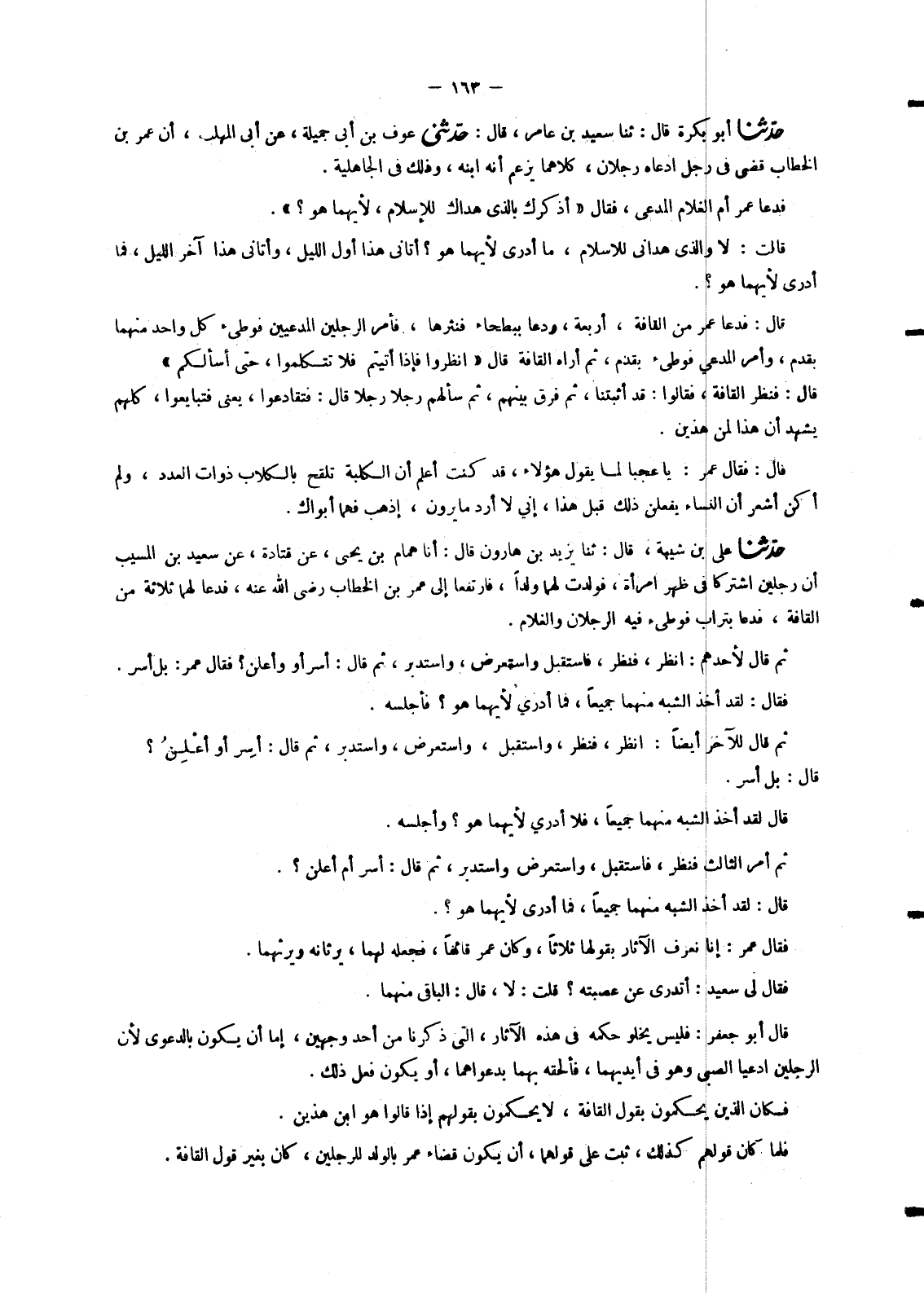 6173 - حَدَّثَنَا عَلِيُّ بْنُ شَيْبَةَ، قَالَ: ثنا يَزِيدُ بْنُ هَارُونَ، قَالَ: أنا هَمَّامُ بْنُ يَحْيَى، عَنْ قَتَادَةَ، عَنْ سَعِيدِ بْنِ الْمُسَيِّبِ، أَنَّ رَجُلَيْنِ، اشْتَرَكَا فِي ظَهْرِ امْرَأَةٍ , فَوَلَدَتْ لَهُمَا وَلَدًا , فَارْتَفَعَا إِلَى عُمَرَ بْنِ الْخَطَّابِ رَضِيَ اللهُ عَنْهُ , فَدَعَا لَهُمَا ثَلَاثَةً مِنَ الْقَافَةِ , فَدَعَا بِتُرَابٍ فَوَطِئَ فِيهِ الرَّجُلَانِ وَالْغُلَامُ. ثُمَّ قَالَ لِأَحَدِهِمْ: «انْظُرْ , فَنَظَرَ» , فَاسْتَقْبَلَ وَاسْتَعْرَضَ , وَاسْتَدْبَرَ , ثُمَّ قَالَ: أُسِرُّ أَوْ أُعْلِنُ؟ فَقَالَ عُمَرُ: «بَلْ أَسِرَّ» . فَقَالَ: لَقَدْ أَخَذَ الشَّبَهَ مِنْهُمَا جَمِيعًا , فَمَا أَدْرِي لِأَيِّهِمَا هُوَ؟ فَأَجْلَسَهُ. ثُمَّ قَالَ لِلْآخَرِ أَيْضًا: " انْظُرْ , فَنَظَرَ , وَاسْتَقْبَلَ , وَاسْتَعْرَضَ , وَاسْتَدْبَرَ , ثُمَّ قَالَ: أُسِرُّ أَوْ أُعْلِنُ؟ قَالَ: «بَلْ أَسِرَّ» . قَالَ لَقَدْ أَخَذَ الشَّبَهَ مِنْهُمَا جَمِيعًا , فَلَا أَدْرِي لِأَيِّهِمَا هُوَ؟ وَأَجْلَسَهُ. ثُمَّ أَمَرَ الثَّالِثَ فَنَظَرَ , فَاسْتَقْبَلَ , وَاسْتَعْرَضَ وَاسْتَدْبَرَ , ثُمَّ قَالَ: أُسِرُّ أَمْ أُعْلِنُ؟ . قَالَ: لَقَدْ أَخَذَ الشَّبَهَ مِنْهُمَا جَمِيعًا , فَمَا أَدْرِي لِأَيِّهِمَا هُوَ؟ . فَقَالَ عُمَرُ: «إِنَّا نَعْرِفُ الْآثَارَ بِقَوْلِهَا ثَلَاثًا» , وَكَانَ عُمَرُ قَالَهَا , §فَجَعَلَهُ لَهُمَا , يَرِثَانِهِ وَيَرِثُهُمَا. فَقَالَ لِي سَعِيدٌ: أَتَدْرِي عَنْ عَصَبَتِهِ؟ قُلْتُ: لَا , قَالَ: الْبَاقِي مِنْهُمَا قَالَ أَبُو جَعْفَرٍ: فَلَيْسَ يَخْلُو حُكْمُهُ فِي هَذِهِ الْآثَارِ الَّتِي ذَكَرْنَا مِنْ أَحَدِ وَجْهَيْنِ: إِمَّا أَنْ يَكُونَ بِالدَّعْوَى لِأَنَّ الرَّجُلَيْنِ ادَّعَيَا الصَّبِيَّ وَهُوَ فِي أَيْدِيهِمَا , فَأَلْحَقَهُ بِهِمَا بِدَعْوَاهُمَا , أَوْ يَكُونَ فَعَلَ ذَلِكَ. فَكَانَ الَّذِينَ يَحْكُمُونَ بِقَوْلِ الْقَافَةِ , لَا يَحْكُمُونَ بِقَوْلِهِمْ إِذَا قَالُوا: هُوَ ابْنُ هَذَيْنِ. فَلَمَّا كَانَ قَوْلُهُمْ كَذَلِكَ , ثَبَتَ عَلَى قَوْلِهِمَا , أَنْ يَكُونَ قَضَاءُ عُمَرَ بِالْوَلَدِ لِلرَّجُلَيْنِ , كَانَ بِغَيْرِ قَوْلِ الْقَافَةِ. -[164]- وَفِي حَدِيثِ سَعِيدِ بْنِ الْمُسَيِّبِ , مَا يَدُلُّ عَلَى ذَلِكَ , وَذَلِكَ أَنَّهُ قَالَ: فَقَالَ الْقَافَةُ لَا نَدْرِي لِأَيِّهِمَا هُوَ؟ فَجَعَلَهُ عُمَرُ بَيْنَهُمَا. وَالْقَافَةُ لَمْ يَقُولُوا: هُوَ ابْنُهُمَا , فَدَلَّ ذَلِكَ أَنَّ عُمَرَ , أَثْبَتَ نَسَبَهُ مِنَ الرَّجُلَيْنِ بِدَعْوَاهُمَا , وَلِمَا لَهُمَا عَلَيْهِ مِنَ الْيَدِ , لَا بِقَوْلِ الْقَافَةِ. فَإِنْ قَالَ قَائِلٌ: فَإِذَا كَانَ ذَلِكَ كَمَا ذَكَرْتَهُ , فَمَا كَانَ احْتِيَاجُ عُمَرَ إِلَى الْقَافَةِ , حَتَّى دَعَاهُمْ؟ . قِيلَ لَهُ: يَحْتَمِلُ ذَلِكَ عِنْدَنَا , وَاللهُ أَعْلَمُ , أَنْ يَكُونَ عُمَرُ رَضِيَ اللهُ عَنْهُ وَقَعَ بِقَلْبِهِ أَنَّ حَمْلًا لَا يَكُونُ مِنْ رَجُلَيْنِ , فَيَسْتَحِيلُ إِلْحَاقُ الْوَلَدِ بِمَنْ يَعْلَمُ أَنَّهُ لَمْ يَلِدْهُ , فَدَعَا الْقَافَةَ , لِيَعْلَمَ مِنْهُمْ , هَلْ يَكُونُ وَلَدٌ يُحْمَلُ بِهِ مِنْ نُطْفَتَيْ رَجُلَيْنِ أَمْ لَا؟ وَقَدْ بَيَّنَ ذَلِكَ مَا ذَكَرْنَا , فِي حَدِيثِ أَبِي الْمُهَلَّبِ. فَلَمَّا أَخْبَرَهُ الْقَافَةُ بِأَنَّ ذَلِكَ قَدْ يَكُونُ , وَأَنَّهُ غَيْرُ مُسْتَحِيلٍ , رَجَعَ إِلَى الدَّعْوَى الَّتِي كَانَتْ مِنَ الرَّجُلَيْنِ , فَحَكَمَ بِهَا , فَجَعَلَ الْوَلَدَ ابْنَهُمَا جَمِيعًا , يَرِثُهُمَا وَيَرِثَانِهِ , فَذَلِكَ حُكْمٌ بِالدَّعْوَى , لَا بِقَوْلِ الْقَافَةِ. وَقَدْ رُوِيَ عَنْ عَلِيِّ بْنِ أَبِي طَالِبٍ رَضِيَ اللهُ عَنْهُ فِي ذَلِكَ أَيْضًا