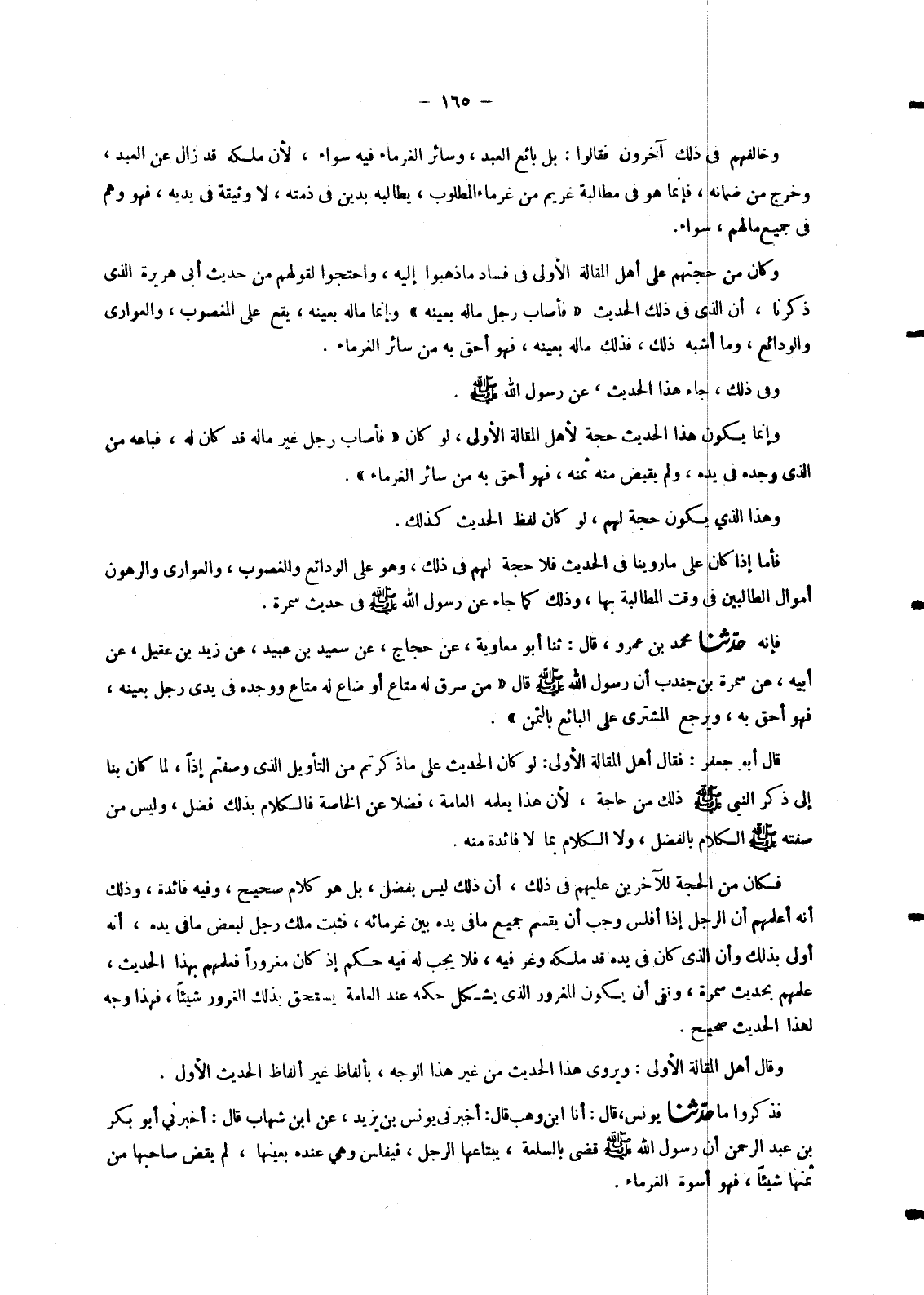6178 - فَإِنَّهُ حَدَّثَنَا مُحَمَّدُ بْنُ عَمْرٍو , قَالَ: ثنا أَبُو مُعَاوِيَةَ , عَنْ حَجَّاجٍ , عَنْ سَعِيدِ بْنِ عُبَيْدِ بْنِ زَيْدِ بْنِ عُقْبَةَ , عَنْ أَبِيهِ , عَنْ سَمُرَةَ بْنِ جُنْدَبٍ أَنَّ رَسُولَ اللهِ صَلَّى اللَّهُ عَلَيْهِ وَسَلَّمَ قَالَ: «§مَنْ سُرِقَ لَهُ مَتَاعٌ أَوْ ضَاعَ لَهُ مَتَاعٌ وَوَجَدَهُ فِي يَدَيْ رَجُلٍ بِعَيْنِهِ , فَهُوَ أَحَقُّ بِهِ , وَيَرْجِعُ الْمُشْتَرِي عَلَى الْبَائِعِ بِالثَّمَنِ» قَالَ أَبُو جَعْفَرٍ: فَقَالَ أَهْلُ الْمَقَالَةِ الْأُولَى: لَوْ كَانَ الْحَدِيثُ عَلَى مَا ذَكَرْتُمْ مِنَ التَّأْوِيلِ الَّذِي وَصَفْتُمْ , إِذًا لَمَا كَانَ بِنَا إِلَى ذِكْرِ النَّبِيِّ صَلَّى اللَّهُ عَلَيْهِ وَسَلَّمَ ذَلِكَ مِنْ حَاجَةٍ , لِأَنَّ هَذَا يَعْلَمُهُ الْعَامَّةُ , فَضْلًا عَنِ الْخَاصَّةِ فَالْكَلَامُ بِذَلِكَ فَضْلٌ , وَلَيْسَ مِنْ صِفَتِهِ صَلَّى اللَّهُ عَلَيْهِ وَسَلَّمَ الْكَلَامُ بِالْفَضْلِ , وَلَا الْكَلَامُ بِمَا لَا فَائِدَةَ مِنْهُ. فَكَانَ مِنَ الْحُجَّةِ لِلْآخَرِينَ عَلَيْهِمْ فِي ذَلِكَ , أَنَّ ذَلِكَ لَيْسَ بِفَضْلٍ , بَلْ هُوَ كَلَامٌ صَحِيحٌ , وَفِيهِ فَائِدَةٌ , وَذَلِكَ أَنَّهُ أَعْلَمَهُمْ أَنَّ الرَّجُلَ إِذَا أَفْلَسَ وَجَبَ أَنْ يُقْسِمَ جَمِيعَ مَا فِي يَدِهِ بَيْنَ غُرَمَائِهِ , فَثَبَتَ مِلْكُ رَجُلٍ لِبَعْضِ مَا فِي يَدِهِ , أَنَّهُ أَوْلَى بِذَلِكَ وَأَنَّ الَّذِي كَانَ فِي يَدِهِ قَدْ مَلَكَهُ وَغَرَّ فِيهِ , فَلَا يَجِبُ لَهُ فِيهِ حُكْمٌ إِذْ كَانَ مَغْرُورًا فَعَلَّمَهُمْ بِهَذَا الْحَدِيثِ , عَلَّمَهُمْ بِحَدِيثِ سَمُرَةَ , وَنَفَى أَنْ يَكُونَ الْمَغْرُورُ الَّذِي يُشْكِلُ حُكْمُهُ عِنْدَ الْعَامَّةِ يَسْتَحِقُّ بِذَلِكَ الْغُرُورِ شَيْئًا , فَهَذَا وَجْهٌ لِهَذَا الْحَدِيثِ صَحِيحٌ. وَقَالَ أَهْلُ الْمَقَالَةِ الْأُولَى: وَيُرْوَى هَذَا الْحَدِيثُ مِنْ غَيْرِ هَذَا الْوَجْهِ , بِأَلْفَاظٍ غَيْرِ أَلْفَاظِ الْحَدِيثِ الْأَوَّلِ. فَذَكَرُوا