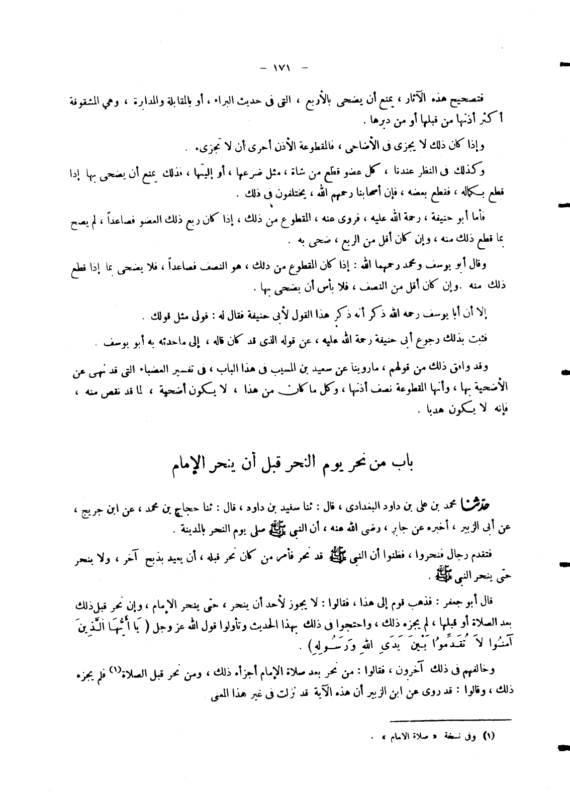 6200 - حَدَّثَنَا مُحَمَّدُ بْنُ عَلِيِّ بْنِ دَاوُدَ الْبَغْدَادِيُّ , قَالَ: ثنا سُنَيْدُ بْنُ دَاوُدَ , قَالَ: ثنا حَجَّاجُ بْنُ مُحَمَّدٍ , عَنِ ابْنِ جُرَيْجٍ , عَنْ أَبِي الزُّبَيْرِ , أَخْبَرَهُ عَنْ جَابِرٍ رَضِيَ اللهُ عَنْهُ , أَنَّ النَّبِيَّ صَلَّى اللَّهُ عَلَيْهِ وَسَلَّمَ صَلَّى يَوْمَ النَّحْرِ بِالْمَدِينَةِ. فَتَقَدَّمَ رِجَالٌ فَنَحَرُوا , فَظَنُّوا أَنَّ النَّبِيَّ صَلَّى اللَّهُ عَلَيْهِ وَسَلَّمَ قَدْ نَحَرَ §فَأَمَرَ مَنْ كَانَ نَحَرَ قَبْلَهُ , أَنْ يُعِيدَ بِذَبْحٍ آخَرَ , وَلَا يَنْحَرُ حَتَّى يَنْحَرَ النَّبِيُّ صَلَّى اللَّهُ عَلَيْهِ وَسَلَّمَ قَالَ أَبُو جَعْفَرٍ: فَذَهَبَ قَوْمٌ إِلَى هَذَا , فَقَالُوا: لَا يَجُوزُ لِأَحَدٍ أَنْ يَنْحَرَ , حَتَّى يَنْحَرَ الْإِمَامُ , وَإِنْ نَحَرَ قَبْلَ ذَلِكَ بَعْدَ الصَّلَاةِ أَوْ قَبْلَهَا , لَمْ يُجْزِهِ ذَلِكَ , وَاحْتَجُّوا فِي ذَلِكَ بِهَذَا الْحَدِيثِ وَتَأَوَّلُوا قَوْلَ اللهِ عَزَّ وَجَلَّ {يَا أَيُّهَا الَّذِينَ آمَنُوا لَا تُقَدِّمُوا بَيْنَ يَدَيِ اللهِ وَرَسُولِهِ} [الحجرات: 1] . وَخَالَفَهُمْ فِي ذَلِكَ آخَرُونَ , فَقَالُوا: مَنْ نَحَرَ بَعْدَ صَلَاةِ الْإِمَامِ أَجْزَأَهُ ذَلِكَ , وَمَنْ نَحَرَ قَبْلَ الصَّلَاةِ فَلَمْ يُجْزِهِ ذَلِكَ , وَقَالُوا: قَدْ رُوِيَ عَنِ ابْنِ الزُّبَيْرِ أَنَّ هَذِهِ الْآيَةَ قَدْ نَزَلَتْ فِي غَيْرِ هَذَا الْمَعْنَى. -[172]- فَذَكَرُوا