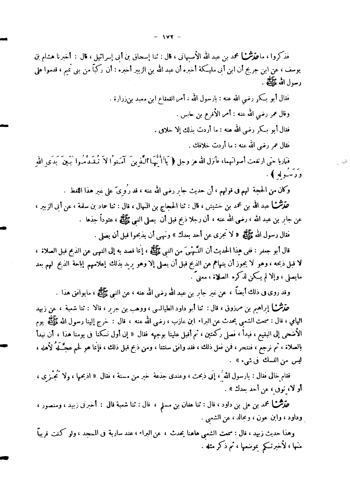 6201 - مَا حَدَّثَنَا مُحَمَّدُ بْنُ عَبْدِ اللهِ الْأَصْبَهَانِيُّ , قَالَ: ثنا إِسْحَاقُ بْنُ أَبِي إِسْرَائِيلَ , قَالَ: أَخْبَرَنَا هِشَامُ بْنُ يُوسُفَ , عَنِ ابْنِ جُرَيْجٍ أَنَّ ابْنَ أَبِي مُلَيْكَةَ أَخْبَرَهُ أَنَّ عَبْدَ اللهِ بْنَ الزُّبَيْرِ أَخْبَرَهُ: أَنَّ رَكْبًا مِنْ بَنِي تَمِيمٍ , قَدِمُوا عَلَى رَسُولِ اللهِ صَلَّى اللَّهُ عَلَيْهِ وَسَلَّمَ. فَقَالَ أَبُو بَكْرٍ رَضِيَ اللهُ عَنْهُ: «يَا رَسُولَ اللهِ أَمِّرِ الْقَعْقَاعَ بْنَ مَعْبَدِ بْنَ زُرَارَةَ» . وَقَالَ عُمَرُ رَضِيَ اللهُ عَنْهُ: «أَمِّرِ الْأَقْرَعَ بْنَ حَابِسٍ» . فَقَالَ أَبُو بَكْرٍ رَضِيَ اللهُ عَنْهُ: «مَا أَرَدْتَ بِذَلِكَ إِلَّا خِلَافِي» . فَقَالَ عُمَرُ رَضِيَ اللهُ عَنْهُ: «مَا أَرَدْتُ خِلَافَكَ» . §فَتَمَارَيَا حَتَّى ارْتَفَعَتْ أَصْوَاتُهُمَا , فَأَنْزَلَ اللهُ عَزَّ وَجَلَّ يَا {أَيُّهَا الَّذِينَ آمَنُوا لَا تُقَدِّمُوا بَيْنَ يَدَيِ اللهِ وَرَسُولِهِ} [الحجرات: 1] وَكَانَ مِنَ الْحُجَّةِ لَهُمْ فِي قَوْلِهِمْ , أَنَّ حَدِيثَ جَابِرٍ رَضِيَ اللهُ عَنْهُ , قَدْ رُوِيَ عَلَى غَيْرِ هَذَا اللَّفْظِ
