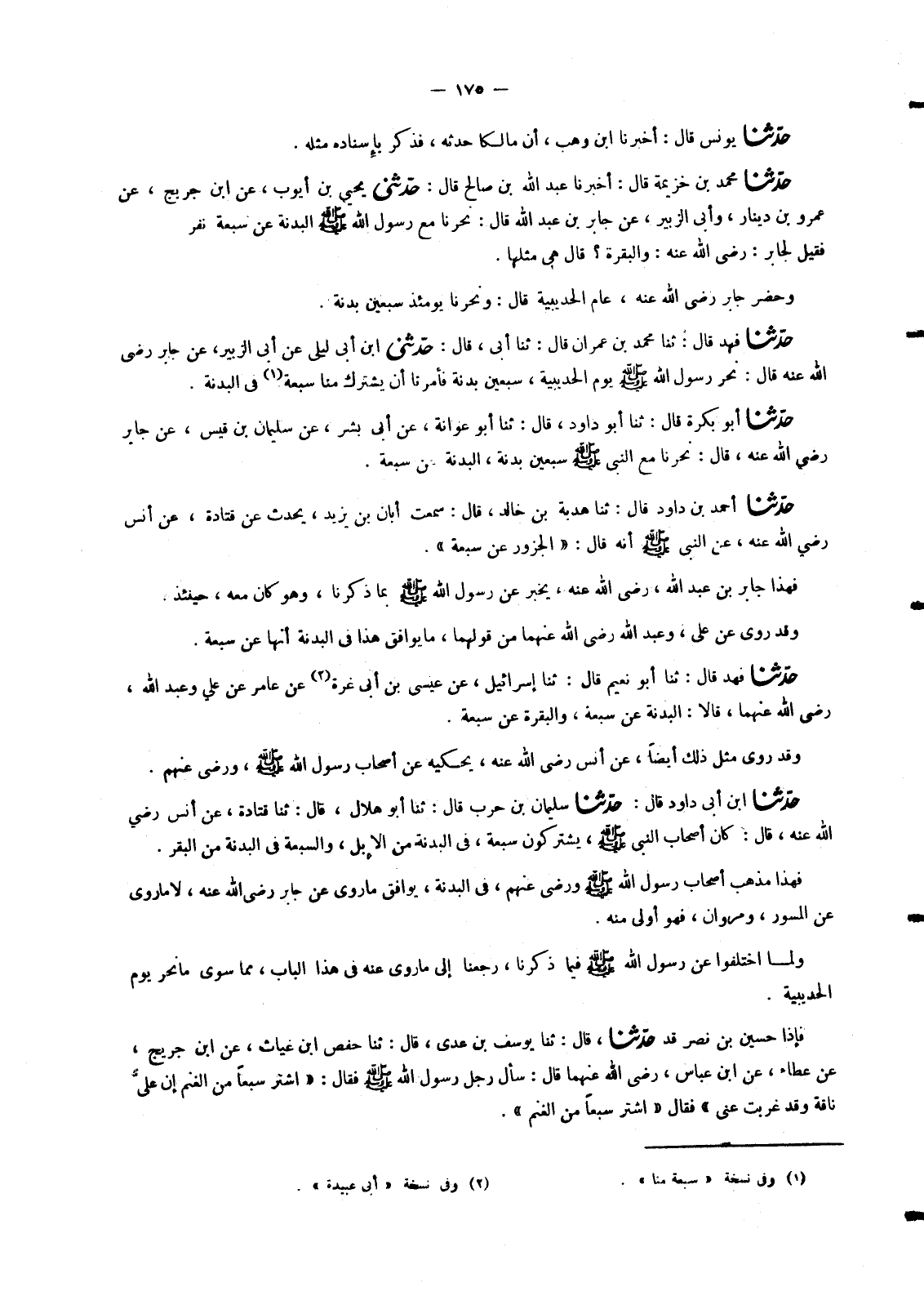 6216 - حَدَّثَنَا فَهْدٌ، قَالَ: ثنا مُحَمَّدُ بْنُ عِمْرَانَ، قَالَ: ثنا أَبِي، قَالَ: حَدَّثَنِي ابْنُ أَبِي لَيْلَى، عَنْ أَبِي الزُّبَيْرِ، عَنْ جَابِرٍ، رَضِيَ اللهُ عَنْهُ قَالَ: «نَحَرَ رَسُولُ اللهِ صَلَّى اللَّهُ عَلَيْهِ وَسَلَّمَ يَوْمَ الْحُدَيْبِيَةِ , سَبْعِينَ بَدَنَةً §فَأَمَرَنَا أَنْ يَشْتَرِكَ مِنَّا سَبْعَةٌ فِي الْبَدَنَةِ»
