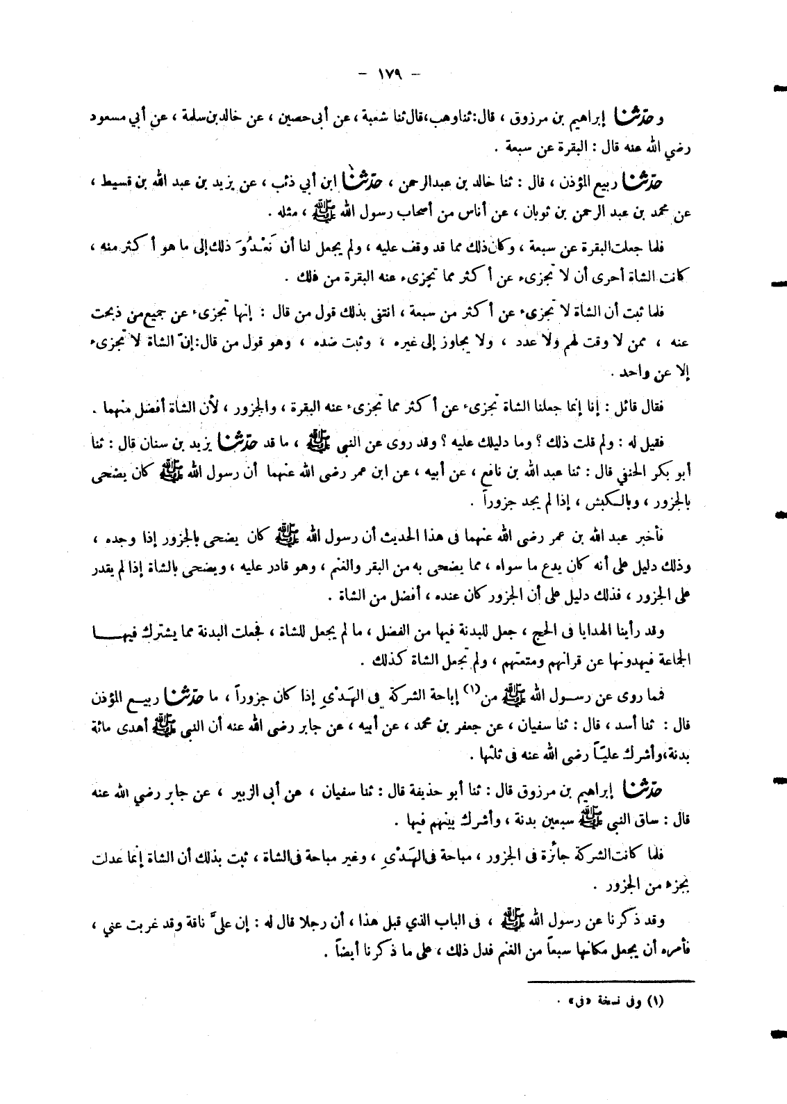 6238 - حَدَّثَنَا إِبْرَاهِيمُ بْنُ مَرْزُوقٍ، قَالَ: ثنا أَبُو حُذَيْفَةَ، قَالَ: ثنا سُفْيَانُ، عَنْ أَبِي الزُّبَيْرِ، عَنْ جَابِرٍ، رَضِيَ اللهُ عَنْهُ قَالَ: «§سَاقَ النَّبِيُّ صَلَّى اللَّهُ عَلَيْهِ وَسَلَّمَ سَبْعِينَ بَدَنَةً , وَأَشْرَكَ بَيْنَهُمْ فِيهَا» فَلَمَّا كَانَتِ الشَّرِكَةُ جَائِزَةً فِي الْجَزُورِ , مُبَاحَةً فِي الْهَدْيِ , وَغَيْرَ مُبَاحَةٍ فِي الشَّاةِ , ثَبَتَ بِذَلِكَ أَنَّ الشَّاةَ إِنَّمَا عَدَلَتْ بِجُزْءٍ مِنَ الْجَزُورِ. وَقَدْ ذَكَرْنَا عَنْ رَسُولِ اللهِ صَلَّى اللَّهُ عَلَيْهِ وَسَلَّمَ فِي الْبَابِ الَّذِي قَبْلَ هَذَا , أَنَّ رَجُلًا قَالَ لَهُ: إِنَّ عَلَيَّ نَاقَةً وَقَدْ غَرَبَتْ عَنِّي , فَأَمَرَهُ أَنْ يَجْعَلَ مَكَانَهَا سَبْعًا مِنَ الْغَنَمِ فَدَلَّ ذَلِكَ عَلَى مَا ذَكَرْنَا أَيْضًا. -[180]- وَقَدْ رُوِيَ عَنِ ابْنِ عَبَّاسٍ رَضِيَ اللهُ عَنْهُمَا أَيْضًا مَا يُوَافِقُ هَذَا الْمَعْنَى