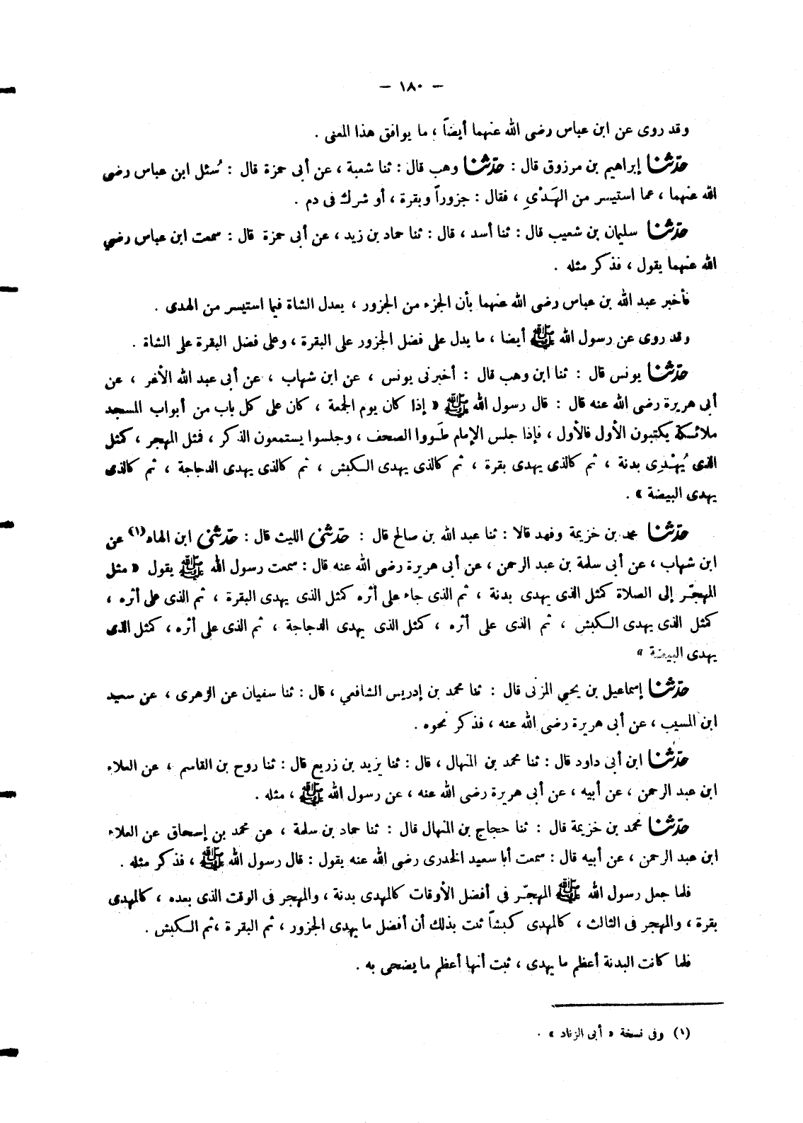 6242 - حَدَّثَنَا مُحَمَّدُ بْنُ خُزَيْمَةَ، وَفَهْدٌ، قَالَا: ثنا عَبْدُ اللهِ بْنُ صَالِحٍ، قَالَ: حَدَّثَنِي اللَّيْثُ، قَالَ: حَدَّثَنِي ابْنُ الْهَادِ، عَنِ ابْنِ شِهَابٍ، عَنْ أَبِي سَلَمَةَ بْنِ عَبْدِ الرَّحْمَنِ، عَنْ أَبِي هُرَيْرَةَ، رَضِيَ اللهُ عَنْهُ قَالَ: سَمِعْتُ رَسُولَ اللهِ صَلَّى اللَّهُ عَلَيْهِ وَسَلَّمَ يَقُولُ: «§مَثَلُ الْمُهَجِّرِ إِلَى الصَّلَاةِ كَمَثَلِ الَّذِي يُهْدِي بَدَنَةً , ثُمَّ الَّذِي جَاءَ عَلَى أَثَرِهِ كَمَثَلِ الَّذِي يُهْدِي الْبَقَرَةَ , ثُمَّ الَّذِي عَلَى أَثَرِهِ , كَمَثَلِ الَّذِي يُهْدِي الْكَبْشَ , ثُمَّ الَّذِي عَلَى أَثَرِهِ , كَمَثَلِ الَّذِي يُهْدِي الدَّجَاجَةَ , ثُمَّ الَّذِي عَلَى أَثَرِهِ , كَمَثَلِ الَّذِي يُهْدِي الْبَيْضَةَ»