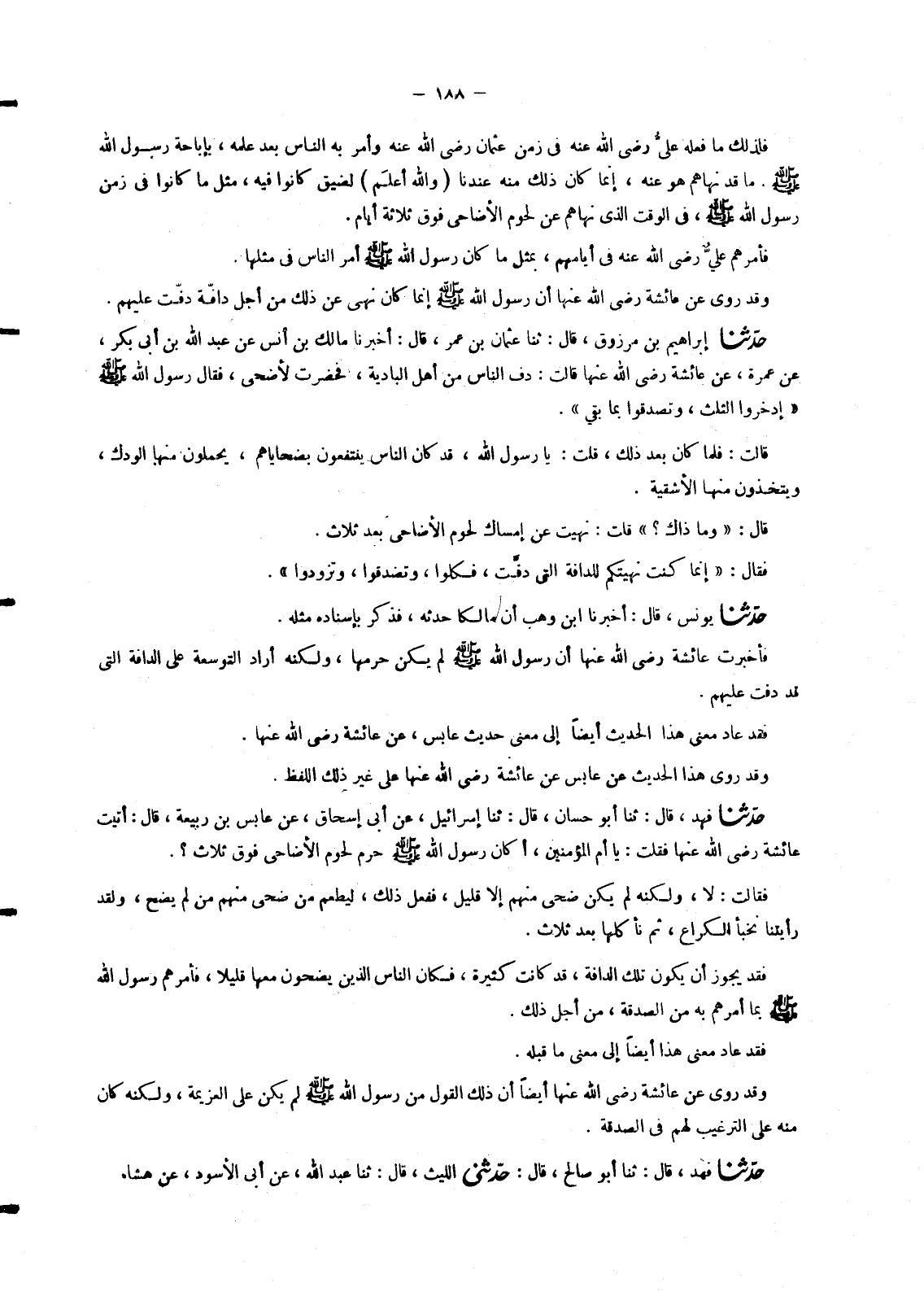 6288 - حَدَّثَنَا فَهْدٌ، قَالَ: ثنا أَبُو صَالِحٍ، قَالَ: حَدَّثَنِي اللَّيْثُ، قَالَ: ثنا عَبْدُ اللهِ، عَنْ أَبِي الْأَسْوَدِ، عَنْ هِشَامِ بْنِ -[189]- عُرْوَةَ، عَنْ يَحْيَى بْنِ سَعِيدٍ، عَنْ عَمْرَةَ، عَنْ عَائِشَةَ، رَضِيَ اللهُ عَنْهَا , أَنَّهَا قَالَتْ فِي لُحُومِ الْأَضَاحِيِّ: «كُنَّا نُمَلِّحُ مِنْهُ , فَتَقَدَّمَ بِهِ النَّاسُ إِلَى الْمَدِينَةِ» فَقَالَ: «§لَا تَأْكُلُوا إِلَّا ثَلَاثَةَ أَيَّامٍ» لَيْسَتْ بِالْعَزِيمَةِ وَلَكِنْ أَرَادَ أَنْ يُطْعِمُوا مِنْهُ فَلَمْ يَخْلُ نَهْيُ رَسُولِ اللهِ صَلَّى اللَّهُ عَلَيْهِ وَسَلَّمَ عَنْ لُحُومِ الْأَضَاحِيِّ فَوْقَ ثَلَاثَةِ أَيَّامٍ , مِنْ أَحَدِ وَجْهَيْنِ: إِمَّا أَنْ يَكُونَ ذَلِكَ عَلَى الْحَضِّ مِنْهُ لَهُمْ , عَلَى الصَّدَقَةِ وَالْخَيْرِ. فَإِنْ كَانَ ذَلِكَ عَلَى الْحَضِّ مِنْهُ لَهُمْ فِي الصَّدَقَةِ , لَا عَلَى التَّحْرِيمِ , فَذَلِكَ دَلِيلٌ عَلَى أَنْ لَا بَأْسَ بِادِّخَارِ لُحُومِ الْأَضَاحِيِّ وَأَكْلِهَا بَعْدَ الثَّلَاثِ. وَإِنْ كَانَ ذَلِكَ مِنْ رَسُولِ اللهِ صَلَّى اللَّهُ عَلَيْهِ وَسَلَّمَ عَلَى التَّحْرِيمِ , فَقَدْ كَانَ مِنْهُ بَعْدَ ذَلِكَ , مَا قَدْ نَسَخَ ذَلِكَ , وَأَوْجَبَ التَّحْلِيلَ. فَثَبَتَ بِمَا ذَكَرْنَا , إِبَاحَةُ ادِّخَارِ لُحُومِ الْأَضَاحِيِّ وَأَكْلِهَا فِي الثَّلَاثَةِ وَبَعْدَهَا , وَهُوَ قَوْلُ أَبِي حَنِيفَةَ , وَأَبِي يُوسُفَ , وَمُحَمَّدٍ رَحْمَةُ اللهِ عَلَيْهِمْ أَجْمَعِينَ