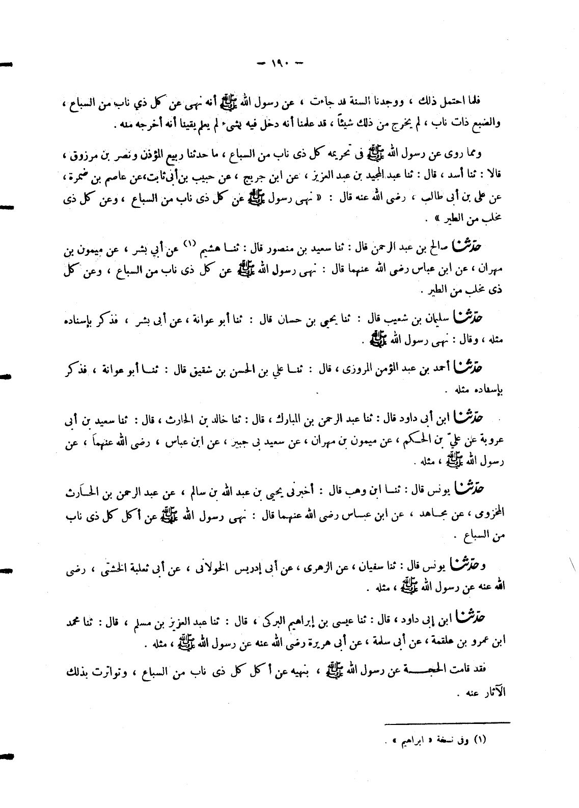 فَلَمَّا احْتَمَلَ ذَلِكَ , وَوَجَدْنَا السُّنَّةَ قَدْ جَاءَتْ عَنْ رَسُولِ اللهِ صَلَّى اللَّهُ عَلَيْهِ وَسَلَّمَ أَنَّهُ نَهَى عَنْ كُلِّ ذِي نَابٍ مِنَ السِّبَاعِ , وَالضَّبُعُ ذَاتُ نَابٍ , لَمْ يَخْرُجْ مِنْ ذَلِكَ شَيْئًا , قَدْ عَلِمْنَا أَنَّهُ دَخَلَ فِيهِ بِشَيْءٍ لَمْ يُعْلَمْ يَقِينًا أَنَّهُ أَخْرَجَهُ مِنْهُ. وَمِمَّا رُوِيَ عَنْ رَسُولِ اللهِ صَلَّى اللَّهُ عَلَيْهِ وَسَلَّمَ فِي تَحْرِيمِهِ كُلَّ ذِي نَابٍ مِنَ السِّبَاعِ