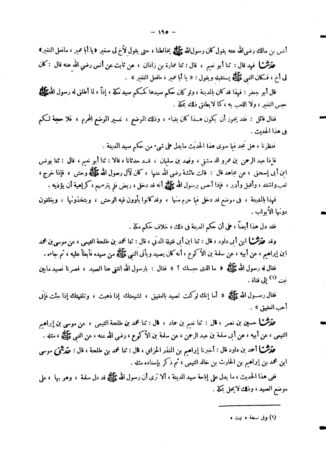 6329 - حَدَّثَنَا فَهْدٌ، قَالَ: ثنا أَبُو نُعَيْمٍ، قَالَ: ثنا عُمَارَةُ بْنُ زَاذَانَ، عَنْ ثَابِتٍ، عَنْ أَنَسٍ، رَضِيَ اللهُ عَنْهُ قَالَ: كَانَ لِي أَخٌ , فَكَانَ النَّبِيُّ صَلَّى اللَّهُ عَلَيْهِ وَسَلَّمَ يَسْتَقْبِلُهُ وَيَقُولُ: «§يَا أَبَا عُمَيْرٍ , مَا فَعَلَ النُّغَيْرُ» قَالَ أَبُو جَعْفَرٍ: فَهَذَا قَدْ كَانَ بِالْمَدِينَةِ , وَلَوْ كَانَ حُكْمُ صَيْدِهَا كَحُكْمِ صَيْدِ مَكَّةَ , إِذًا لَمَا أَطْلَقَ لَهُ رَسُولُ اللهِ صَلَّى اللَّهُ عَلَيْهِ وَسَلَّمَ حَبْسَ النُّغَيْرِ , وَلَا اللَّعِبَ بِهِ , كَمَا لَا يُطْلَقُ ذَلِكَ بِمَكَّةَ. فَقَالَ قَائِلٌ: فَقَدْ يَجُوزُ أَنْ يَكُونَ هَذَا كَانَ بِقُبَاءَ , وَذَلِكَ الْمَوْضِعُ , غَيْرُ الْمَوْضِعِ الْمُحَرَّمِ , فَلَا حُجَّةَ لَكُمْ فِي هَذَا الْحَدِيثِ. فَنَظَرْنَا , هَلْ نَجِدُ فِيمَا سِوَى هَذَا الْحَدِيثِ مَا يَدُلُّ عَلَى شَيْءٍ مِنْ حُكْمِ صَيْدِ الْمَدِينَةِ