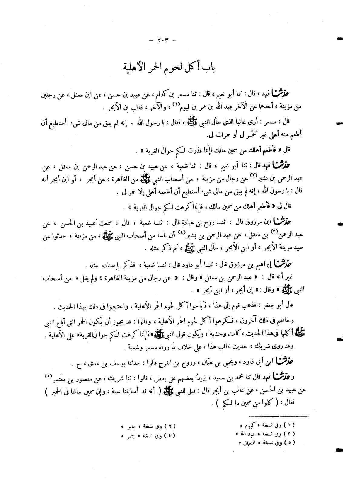 6373 - حَدَّثَنَا إِبْرَاهِيمُ بْنُ مَرْزُوقٍ، قَالَ: ثنا أَبُو دَاوُدَ، قَالَ: ثنا شُعْبَةُ، فَذَكَرَ بِإِسْنَادِهِ مِثْلَهُ. غَيْرَ أَنَّهُ قَالَ: عَبْدُ الرَّحْمَنِ بْنُ مَعْقِلٍ وَقَالَ: عَنْ رِجَالٍ مِنْ مُزَيْنَةَ الظَّاهِرَةِ وَلَمْ يَقُلْ مِنْ أَصْحَابِ النَّبِيِّ صَلَّى اللَّهُ عَلَيْهِ وَسَلَّمَ وَقَالَ: إِنَّ أَبْجَرَ , أَوِ ابْنَ أَبْجَرَ قَالَ أَبُو جَعْفَرٍ: فَذَهَبَ قَوْمٌ إِلَى هَذَا , فَأَبَاحُوا أَكْلَ لُحُومِ الْحُمُرِ الْأَهْلِيَّةِ , وَاحْتَجُّوا فِي ذَلِكَ بِهَذَا الْحَدِيثِ. وَخَالَفَهُمْ فِي ذَلِكَ آخَرُونَ , فَكَرِهُوا أَكْلَ لُحُومِ الْحُمُرِ الْأَهْلِيَّةِ , وَقَالُوا: قَدْ يَجُوزُ أَنْ يَكُونَ الْحُمُرُ الَّتِي أَبَاحَ النَّبِيُّ صَلَّى اللَّهُ عَلَيْهِ وَسَلَّمَ أَكْلَهَا فِي هَذَا الْحَدِيثِ , كَانَتْ وَحْشِيَّةً , وَيَكُونَ قَوْلُ النَّبِيِّ صَلَّى اللَّهُ عَلَيْهِ وَسَلَّمَ فَإِنَّمَا كَرِهْتُ لَكُمْ جَوَّالَ الْقَرْيَةِ عَلَى الْأَهْلِيَّةِ. وَقَدْ رَوَى شَرِيكٌ , حَدِيثَ غَالِبٍ هَذَا , عَلَى خِلَافِ مَا رَوَاهُ مِسْعَرٌ وَشُعْبَةُ