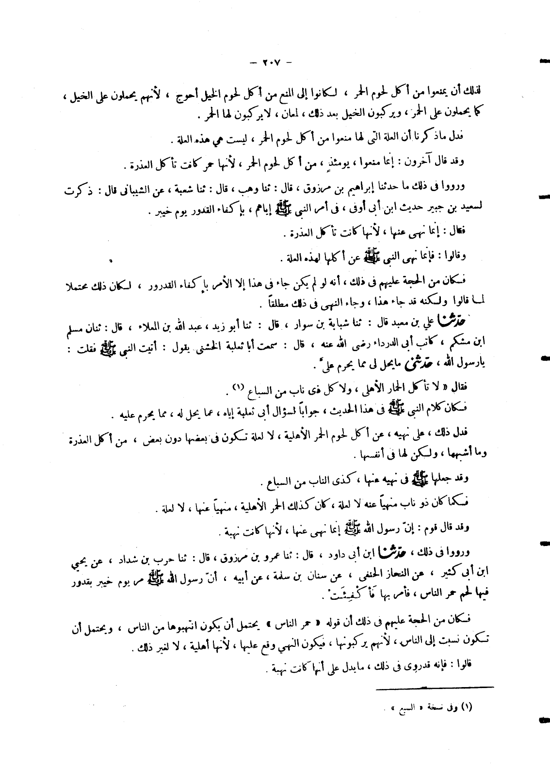 6405 - حَدَّثَنَا عَلِيُّ بْنُ مَعْبَدٍ، قَالَ: ثنا شَبَابَةُ بْنُ سَوَّارٍ، قَالَ: ثنا أَبُو زَبْرٍ عَبْدُ اللهِ بْنُ الْعَلَاءِ , قَالَ: ثنا مُسْلِمُ بْنُ مِشْكَمٍ، كَاتِبُ أَبِي الدَّرْدَاءِ رَضِيَ اللهُ عَنْهُ , قَالَ: سَمِعْتُ أَبَا ثَعْلَبَةَ الْخُشَنِيَّ،. يَقُولُ: أَتَيْتُ النَّبِيَّ صَلَّى اللَّهُ عَلَيْهِ وَسَلَّمَ فَقُلْتُ: يَا رَسُولَ اللهِ , حَدِّثْنِي مَا يَحِلُّ مِمَّا يَحْرُمُ عَلَيَّ؟ فَقَالَ: «§لَا تَأْكُلِ الْحِمَارَ الْأَهْلِيَّ , وَلَا كُلَّ ذِي نَابٍ مِنَ السِّبَاعِ» فَكَانَ كَلَامُ النَّبِيِّ صَلَّى اللَّهُ عَلَيْهِ وَسَلَّمَ فِي هَذَا الْحَدِيثِ , جَوَابًا لِسُؤَالِ أَبِي ثَعْلَبَةَ إِيَّاهُ , عَمَّا يَحِلُّ لَهُ , مِمَّا يَحْرُمُ عَلَيْهِ. فَدَلَّ ذَلِكَ عَلَى نَهْيِهِ عَنْ أَكْلِ لُحُومِ الْحُمُرِ الْأَهْلِيَّةِ , لَا لِعِلَّةٍ تَكُونُ فِي بَعْضِهَا دُونَ بَعْضٍ , مِنْ أَكْلِ الْعَذِرَةِ وَمَا أَشْبَهُمَا , وَلَكِنْ لَهَا فِي أَنْفُسِهَا. وَقَدْ جَعَلَهَا صَلَّى اللَّهُ عَلَيْهِ وَسَلَّمَ فِي نَهْيِهِ عَنْهَا , كَذِي النَّابِ مِنَ السِّبَاعِ. فَكَمَا كَانَ ذُو نَابٍ مَنْهِيًّا عَنْهُ لَا لِعِلَّةٍ , كَانَ كَذَلِكَ الْحُمُرُ الْأَهْلِيَّةُ , مَنْهِيًّا عَنْهَا , لَا لِعِلَّةٍ. وَقَدْ قَالَ قَوْمٌ: إِنَّ رَسُولَ اللهِ صَلَّى اللَّهُ عَلَيْهِ وَسَلَّمَ إِنَّمَا نَهَى عَنْهَا , لِأَنَّهَا كَانَتْ نُهْبَةً. وَرَوَوْا فِي ذَلِكَ