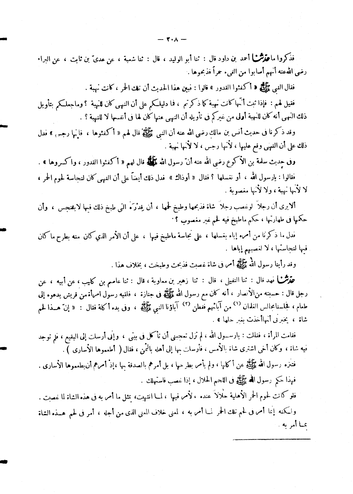 6407 - مَا حَدَّثَنَا أَحْمَدُ بْنُ دَاوُدَ قَالَ: ثنا أَبُو الْوَلِيدِ , قَالَ: ثنا شُعْبَةُ , عَنْ عَدِيِّ بْنِ ثَابِتٍ , عَنِ الْبَرَاءِ رَضِيَ اللهُ عَنْهُ أَنَّهُمْ §أَصَابُوا مِنَ الْفَيْءِ حُمُرًا فَذَبَحُوهَا. فَقَالَ النَّبِيُّ صَلَّى اللَّهُ عَلَيْهِ وَسَلَّمَ: «أَكْفِئُوا الْقُدُورَ» قَالُوا: فَبَيَّنَ هَذَا الْحَدِيثُ أَنَّ تِلْكَ الْحُمُرَ , كَانَتْ نُهْبَةً. فَقِيلَ لَهُمْ: فَإِذَا ثَبَتَ أَنَّهَا كَانَتْ نُهْبَةً كَمَا ذَكَرْتُمْ , فَمَا دَلِيلُكُمْ عَلَى أَنَّ النَّهْيَ كَانَ لِلنُّهْبَةِ؟ وَمَا جَعَلَكُمْ بِتَأْوِيلِ ذَلِكَ النَّهْيِ أَنَّهُ كَانَ لِلنُّهْبَةِ أَوْلَى مِنْ غَيْرِكُمْ فِي تَأْوِيلِهِ أَنَّ النَّهْيَ عَنْهَا كَانَ لَهَا فِي أَنْفُسِهَا لَا لِلنُّهْبَةِ. وَقَدْ ذَكَرْنَا فِي حَدِيثِ أَنَسِ بْنِ مَالِكٍ رَضِيَ اللهُ عَنْهُ أَنَّ النَّبِيَّ صَلَّى اللَّهُ عَلَيْهِ وَسَلَّمَ قَالَ لَهُمْ أَكْفِئُوهَا , فَإِنَّهَا رِجْسٌ فَدَلَّ ذَلِكَ عَلَى أَنَّ النَّهْيَ وَقَعَ عَلَيْهَا , لِأَنَّهَا رِجْسٌ , لَا لِأَنَّهَا نُهْبَةٌ. وَفِي حَدِيثِ سَلَمَةَ بْنِ الْأَكْوَعِ رَضِيَ اللهُ عَنْهُ أَنَّ رَسُولَ اللهِ صَلَّى اللَّهُ عَلَيْهِ وَسَلَّمَ قَالَ لَهُمْ أَكْفِئُوا الْقُدُورَ , وَاكْسِرُوهَا. فَقَالُوا: يَا رَسُولَ اللهِ أَوَ نَغْسِلُهَا؟ فَقَالَ أَوْ ذَاكَ فَدَلَّ ذَلِكَ أَيْضًا عَلَى أَنَّ النَّهْيَ كَانَ لِنَجَاسَةِ لُحُومِ الْحُمُرِ , لَا لِأَنَّهَا نُهْبَةٌ , وَلَا لِأَنَّهَا مَغْصُوبَةٌ. أَلَا يَرَى أَنَّ رَجُلًا لَوْ غَصَبَ شَاةً فَذَبَحَهَا وَطَبَخَ لَحْمَهَا , أَنَّ قِدْرَهُ الَّتِي طَبَخَ ذَلِكَ فِيهَا لَا يَتَنَجَّسُ , وَأَنَّ حُكْمَهَا فِي طَهَارَتِهَا , حُكْمُ مَا طُبِخَ فِيهِ لَحْمٌ غَيْرُ مَغْصُوبٍ؟ فَدَلَّ مَا ذَكَرْنَا مِنْ أَمْرِهِ إِيَّاهُ بِغُسْلِهَا عَلَى نَجَاسَةِ مَا طُبِخَ فِيهَا , عَلَى أَنَّ الْأَمْرَ الَّذِي كَانَ مِنْهُ بِطَرْحِ مَا كَانَ فِيهَا لِنَجَاسَتِهَا , لَا لِغَصْبِهِمْ إِيَّاهَا. وَقَدْ رَأَيْنَا رَسُولَ اللهِ صَلَّى اللَّهُ عَلَيْهِ وَسَلَّمَ أَمَرَ فِي شَاةٍ غُصِبَتْ فَذُبِحَتْ وَطُبِخَتْ , بِخِلَافِ هَذَا