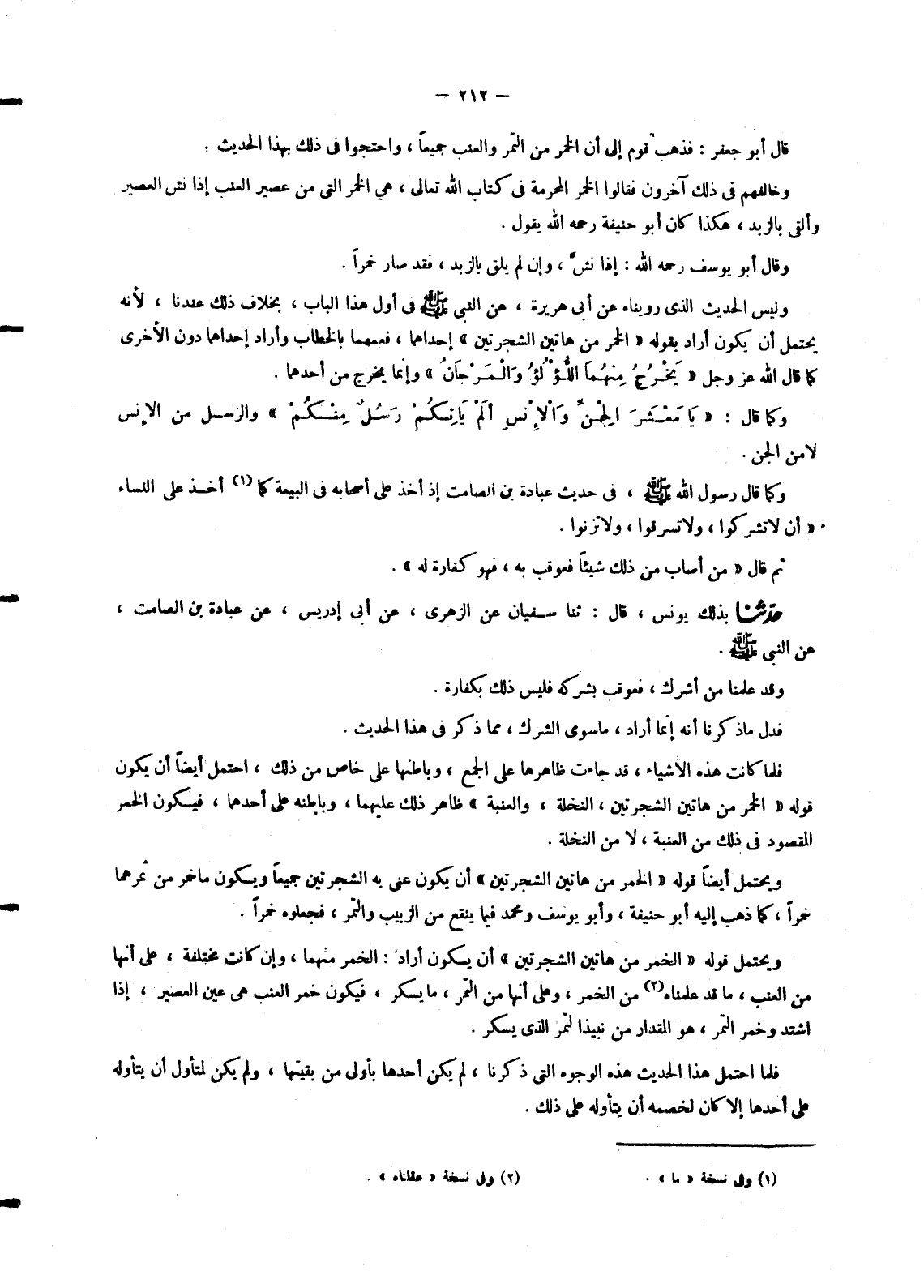 6422 - حَدَّثَنَا بِذَلِكَ يُونُسُ , قَالَ: ثنا سُفْيَانُ، عَنِ الزُّهْرِيِّ، عَنْ أَبِي إِدْرِيسَ، عَنْ عُبَادَةَ بْنِ الصَّامِتِ، عَنِ النَّبِيِّ صَلَّى اللَّهُ عَلَيْهِ وَسَلَّمَ وَقَدْ عَلِمْنَا مَنْ أَشْرَكَ , فَعُوقِبَ بِشِرْكِهِ فَلَيْسَ ذَلِكَ بِكَفَّارَةٍ. فَدَلَّ مَا ذَكَرْنَا أَنَّهُ إِنَّمَا أَرَادَ , مَا سِوَى الشِّرْكِ , مِمَّا ذَكَرَ فِي هَذَا الْحَدِيثِ. فَلَمَّا كَانَتْ هَذِهِ الْأَشْيَاءُ , قَدْ جَاءَتْ ظَاهِرُهَا عَلَى الْجَمْعِ , وَبَاطِنُهَا عَلَى خَاصٍّ مِنْ ذَلِكَ , احْتَمَلَ أَيْضًا أَنْ يَكُونَ قَوْلُهُ الْخَمْرُ مِنْ هَاتَيْنِ الشَّجَرَتَيْنِ , النَّخْلَةِ , وَالْعِنَبَةِ ظَاهِرَ ذَلِكَ عَلَيْهِمَا , وَبَاطِنَهُ عَلَى أَحَدِهِمَا , فَيَكُونُ الْخَمْرُ الْمَقْصُودُ فِي ذَلِكَ مِنَ الْعِنَبَةِ , لَا مِنَ النَّخْلَةِ. وَيَحْتَمِلُ أَيْضًا قَوْلُهُ الْخَمْرُ مِنْ هَاتَيْنِ الشَّجَرَتَيْنِ أَنْ يَكُونَ عَنَى بِهِ الشَّجَرَتَيْنِ جَمِيعًا وَيَكُونُ مَا خَمَرَ مِنْ ثَمَرِهِمَا خَمْرًا , كَمَا ذَهَبَ إِلَيْهِ أَبُو حَنِيفَةَ , وَأَبُو يُوسُفَ وَمُحَمَّدٌ فِيمَا يُنْقَعُ مِنَ الزَّبِيبِ وَالتَّمْرِ , فَجَعَلُوهُ خَمْرًا. وَيَحْتَمِلُ قَوْلُهُ الْخَمْرُ مِنْ هَاتَيْنِ الشَّجَرَتَيْنِ أَنْ يَكُونَ أَرَادَ: الْخَمْرَ مِنْهُمَا , وَإِنْ كَانَتْ مُخْتَلِفَةً , عَلَى أَنَّهَا مِنَ الْعِنَبِ , مَا قَدْ عَلِمْنَاهُ مِنَ الْخَمْرِ , وَعَلَى أَنَّهَا مِنَ التَّمْرِ , مَا يُسْكِرُ , فَيَكُونُ خَمْرُ الْعِنَبِ هِيَ عَيْنُ الْعَصِيرِ , إِذَا اشْتَدَّ وَخَمْرُ التَّمْرِ , هُوَ الْمِقْدَارُ مِنْ نَبِيذِ التَّمْرِ الَّذِي يُسْكِرُ. فَلَمَّا احْتَمَلَ هَذَا الْحَدِيثُ هَذِهِ الْوُجُوهَ الَّتِي ذَكَرْنَا , لَمْ يَكُنْ أَحَدُهَا بِأَوْلَى مِنْ بَقِيَّتِهَا , وَلَمْ يَكُنْ لِمُتَأَوِّلٍ أَنْ يَتَأَوَّلَهُ عَلَى أَحَدِهَا إِلَّا كَانَ لِخَصْمِهِ أَنْ يَتَأَوَّلَهُ عَلَى ذَلِكَ. -[213]- فَإِنْ قَالَ قَائِلٌ: فَمَا مَعْنَى حَدِيثِ عُمَرَ؟ يُرِيدُ