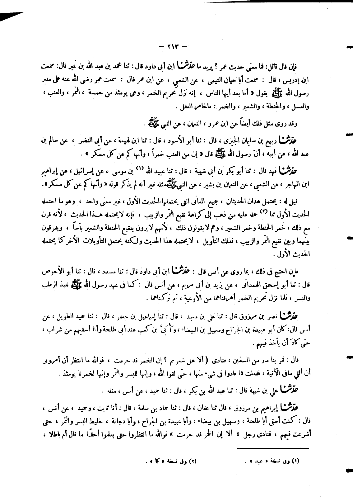 6425 - حَدَّثَنَا فَهْدٌ، قَالَ: ثنا أَبُو بَكْرِ بْنُ أَبِي شَيْبَةَ، قَالَ: ثنا عُبَيْدُ اللهِ بْنُ مُوسَى، عَنْ إِسْرَائِيلَ، عَنْ إِبْرَاهِيمَ بْنِ الْمُهَاجِرِ، عَنِ الشَّعْبِيِّ، عَنِ النُّعْمَانِ بْنِ بَشِيرٍ، عَنِ النَّبِيِّ صَلَّى اللَّهُ عَلَيْهِ وَسَلَّمَ مِثْلَهُ غَيْرَ أَنَّهُ لَمْ يَذْكُرْ قَوْلَهُ وَأَنْهَاكُمْ عَنْ كُلِّ مُسْكِرٍ قِيلَ لَهُ: يَحْتَمِلُ هَذَانِ الْحَدِيثَانِ , جَمِيعَ الْمَعَانِي الَّتِي يَحْتَمِلُهَا الْحَدِيثُ الْأَوَّلُ , غَيْرَ مَعْنًى وَاحِدٍ , وَهُوَ مَا احْتَمَلَهُ الْحَدِيثُ الْأَوَّلُ مِمَّا حَمَلَهُ عَلَيْهِ مَنْ ذَهَبَ إِلَى كَرَاهَةِ نَقِيعِ التَّمْرِ وَالزَّبِيبِ , فَإِنَّهُ لَا يَحْتَمِلُهُ هَذَا الْحَدِيثُ , لِأَنَّهُ قَرَنَ مَعَ ذَلِكَ خَمْرَ الْحِنْطَةِ وَخَمْرَ الشَّعِيرِ , وَهُمْ لَا يَقُولُونَ ذَلِكَ , لِأَنَّهُمْ لَا يَرَوْنَ بِنَقِيعِ الْحِنْطَةِ وَالشَّعِيرِ بَأْسًا , وَيُفَرِّقُونَ بَيْنَهُمَا وَبَيْنَ نَقِيعِ التَّمْرِ وَالزَّبِيبِ , فَذَلِكَ التَّأْوِيلُ , لَا يَحْتَمِلُهُ هَذَا الْحَدِيثُ وَلَكِنَّهُ يَحْتَمِلُ التَّأْوِيلَاتِ الْأُخَرَ كَمَا يَحْتَمِلُهُ الْحَدِيثُ الْأَوَّلُ. فَإِنِ احْتَجَّ فِي ذَلِكَ بِمَا رُوِيَ عَنْ أَنَسٍ