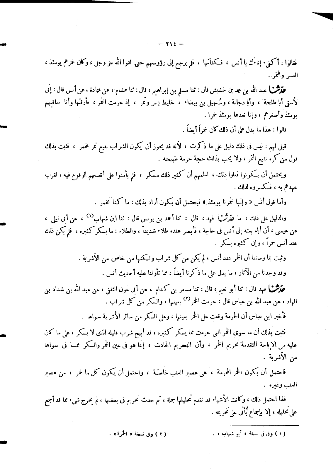 6430 - حَدَّثَنَا عَبْدُ اللهِ بْنُ مُحَمَّدِ بْنِ خُشَيْشٍ، قَالَ: ثنا مُسْلِمُ بْنُ إِبْرَاهِيمَ، قَالَ: ثنا هِشَامٌ، عَنْ قَتَادَةَ، عَنْ أَنَسٍ، قَالَ: «إِنِّي لَأَسْقِي أَبَا طَلْحَةَ , وَأَبَا دُجَانَةَ , وَسُهَيْلَ بْنَ بَيْضَاءَ , خَلِيطَ بُسْرٍ وَتَمْرٍ , إِذْ §حُرِّمَتِ الْخَمْرُ , فَأَرَقْتُهَا وَأَنَا سَاقِيهِمْ يَوْمَئِذٍ وَأَصْغَرُهُمْ , وَإِنَّا نَعُدُّهَا يَوْمَئِذٍ خَمْرًا» قَالُوا: هَذَا مَا يَدُلُّ عَلَى أَنَّ ذَلِكَ كَانَ خَمْرًا أَيْضًا. قِيلَ لَهُمْ: لَيْسَ فِي ذَلِكَ دَلِيلٌ عَلَى مَا ذَكَرْتُ , لِأَنَّهُ قَدْ يَجُوزُ أَنْ يَكُونَ الشَّرَابُ نَقِيعَ تَمْرٍ مُخَمَّرٍ , فَثَبَتَ بِذَلِكَ قَوْلُ مَنْ كَرِهَ نَقِيعَ التَّمْرِ , وَلَا يَجِبُ بِذَلِكَ حُجَّةُ حُرْمَةِ طَبِيخِهِ. وَيَحْتَمِلُ أَنْ يَكُونُوا فَعَلُوا ذَلِكَ , لِعِلْمِهِمْ أَنَّ كَثِيرَ ذَلِكَ مُسْكِرٌ , فَلَمْ يَأْمَنُوا عَلَى أَنْفُسِهِمِ الْوُقُوعَ فِيهِ , لِقُرْبِ عَهْدِهِمْ بِهِ , فَكَسَّرُوهُ لِذَلِكَ. وَأَمَّا قَوْلُ أَنَسٍ وَإِنَّهَا لَخَمْرُنَا يَوْمَئِذٍ فَيَحْتَمِلُ أَنْ يَكُونَ أَرَادَ بِذَلِكَ: مَا كُنَّا نُخَمِّرُ. وَالدَّلِيلُ عَلَى ذَلِكَ