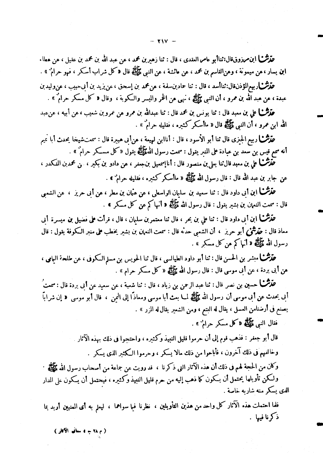 6458 - حَدَّثَنَا حُسَيْنُ بْنُ نَصْرٍ، قَالَ: ثنا عَبْدُ الرَّحْمَنِ بْنُ زِيَادٍ، قَالَ: ثنا شُعْبَةُ، عَنْ سَعِيدِ بْنِ أَبِي بُرْدَةَ، قَالَ: سَمِعْتُ أَبِي، يُحَدِّثُ عَنْ أَبِي مُوسَى، أَنَّ رَسُولَ اللهِ صَلَّى اللَّهُ عَلَيْهِ وَسَلَّمَ لَمَّا بَعَثَ أَبَا مُوسَى وَمُعَاذًا إِلَى الْيَمَنِ , قَالَ أَبُو مُوسَى: إِنَّ شَرَابًا يُصْنَعُ فِي أَرْضِنَا مِنَ الْعَسَلِ , يُقَالُ لَهُ الْبِتْعُ , وَمِنَ الشَّعِيرِ يُقَالُ لَهُ الْمِزْرُ. فَقَالَ النَّبِيُّ صَلَّى اللَّهُ عَلَيْهِ وَسَلَّمَ: «§كُلُّ مُسْكِرٍ حَرَامٌ» قَالَ أَبُو جَعْفَرٍ: فَذَهَبَ قَوْمٌ إِلَى أَنْ حَرَّمُوا قَلِيلَ النَّبِيذِ وَكَثِيرَهُ , وَاحْتَجُّوا فِي ذَلِكَ بِهَذِهِ الْآثَارِ. وَخَالَفَهُمْ فِي ذَلِكَ آخَرُونَ , فَأَبَاحُوا مِنْ ذَلِكَ مَا لَا يُسْكِرُ , وَحَرَّمُوا الْكَثِيرَ الَّذِي يُسْكِرُ. وَكَانَ مِنَ الْحُجَّةِ لَهُمْ فِي ذَلِكَ أَنَّ هَذِهِ الْآثَارَ الَّتِي ذَكَرْنَا , قَدْ رُوِيَتْ عَنْ جَمَاعَةٍ مِنْ أَصْحَابِ رَسُولِ اللهِ صَلَّى اللَّهُ عَلَيْهِ وَسَلَّمَ. وَلَكِنَّ تَأْوِيلَهَا يَحْتَمِلُ أَنْ يَكُونَ كَمَا ذَهَبَ إِلَيْهِ مَنْ حَرَّمَ قَلِيلَ النَّبِيذِ وَكَثِيرَهُ , وَيَحْتَمِلُ أَنْ يَكُونَ عَلَى الْمَدَارِ الَّذِي يَسْكَرُ مِنْهُ شَارِبُهُ خَاصَّةً. فَلَمَّا احْتَمَلَتْ هَذِهِ الْآثَارُ كُلَّ وَاحِدٍ مِنْ هَذَيْنِ التَّأْوِيلَيْنِ , نَظَرْنَا فِيمَا سِوَاهُمَا , لِيُعْلَمَ بِهِ أَيُّ الْمَعْنَيَيْنِ أُرِيدَ بِمَا ذَكَرْنَا فِيهَا. -[218]- فَوَجَدْنَا عُمَرَ بْنَ الْخَطَّابِ , وَهُوَ أَحَدُ النَّفَرِ الَّذِينَ رَوَيْنَا عَنْهُمْ عَنْ رَسُولِ اللهِ صَلَّى اللَّهُ عَلَيْهِ وَسَلَّمَ أَنَّهُ قَالَ كُلُّ: «مُسْكِرٍ حَرَامٌ» . قَدْ رُوِيَ عَنْهُ فِي إِبَاحَةِ الْقَلِيلِ مِنَ النَّبِيذِ الشَّدِيدِ