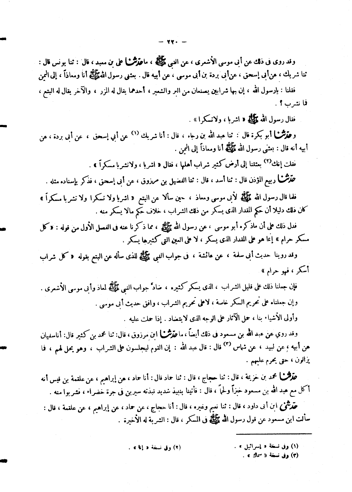 6474 - حَدَّثَنَا رَبِيعٌ الْمُؤَذِّنُ، قَالَ: ثنا أَسَدٌ، قَالَ: ثنا الْفُضَيْلُ بْنُ مَرْزُوقٍ، عَنْ أَبِي إِسْحَاقَ، فَذَكَرَ بِإِسْنَادِهِ مِثْلَهُ فَلَمَّا قَالَ رَسُولُ اللهِ صَلَّى اللَّهُ عَلَيْهِ وَسَلَّمَ لِأَبِي مُوسَى وَمُعَاذٍ , حِينَ سَأَلَا عَنِ الْبِتْعِ اشْرَبَا وَلَا تَسْكَرَا وَلَا تَشْرَبَا مُسْكِرًا كَانَ ذَلِكَ دَلِيلًا أَنَّ حُكْمَ الْمِقْدَارِ الَّذِي يُسْكِرُ مِنْ ذَلِكَ الشَّرَابِ , خِلَافُ حُكْمِ مَا لَا يُسْكِرُ مِنْهُ. فَدَلَّ ذَلِكَ عَلَى أَنَّ مَا ذَكَرَهُ أَبُو مُوسَى عَنْ رَسُولِ اللهِ صَلَّى اللَّهُ عَلَيْهِ وَسَلَّمَ مِمَّا ذَكَرْنَا عَنْهُ فِي الْفَصْلِ الْأَوَّلِ مِنْ قَوْلِهِ: كُلُّ مُسْكِرٍ حَرَامٌ إِنَّمَا هُوَ عَلَى الْمِقْدَارِ الَّذِي يُسْكِرُ , لَا عَلَى الْعَيْنِ الَّتِي كَثِيرُهَا يُسْكِرُ. وَقَدْ رَوَيْنَا حَدِيثَ أَبِي سَلَمَةَ , عَنْ عَائِشَةَ , فِي جَوَابِ النَّبِيِّ صَلَّى اللَّهُ عَلَيْهِ وَسَلَّمَ لِلَّذِي سَأَلَهُ عَنِ الْبِتْعِ بِقَوْلِهِ كُلُّ شَرَابٍ أَسْكَرَ , فَهُوَ حَرَامٌ فَإِنْ جَعَلْنَا ذَلِكَ عَلَى قَلِيلِ الشَّرَابِ , الَّذِي يُسْكِرُ كَثِيرُهُ , ضَادَّ جَوَابَ النَّبِيِّ صَلَّى اللَّهُ عَلَيْهِ وَسَلَّمَ لِمُعَاذٍ وَأَبِي مُوسَى الْأَشْعَرِيِّ. وَإِنْ جَعَلْنَاهُ عَلَى تَحْرِيمِ السُّكْرِ خَاصَّةً , لَا عَلَى تَحْرِيمِ الشَّرَابِ , وَافَقَ حَدِيثَ أَبِي مُوسَى. وَأَوْلَى الْأَشْيَاءِ بِنَا حَمْلُ الْآثَارِ عَلَى الْوَجْهِ الَّذِي لَا يَتَضَادُّ إِذَا حُمِلَتْ عَلَيْهِ. وَقَدْ رُوِيَ عَنْ عَبْدِ اللهِ بْنِ مَسْعُودٍ فِي ذَلِكَ أَيْضًا