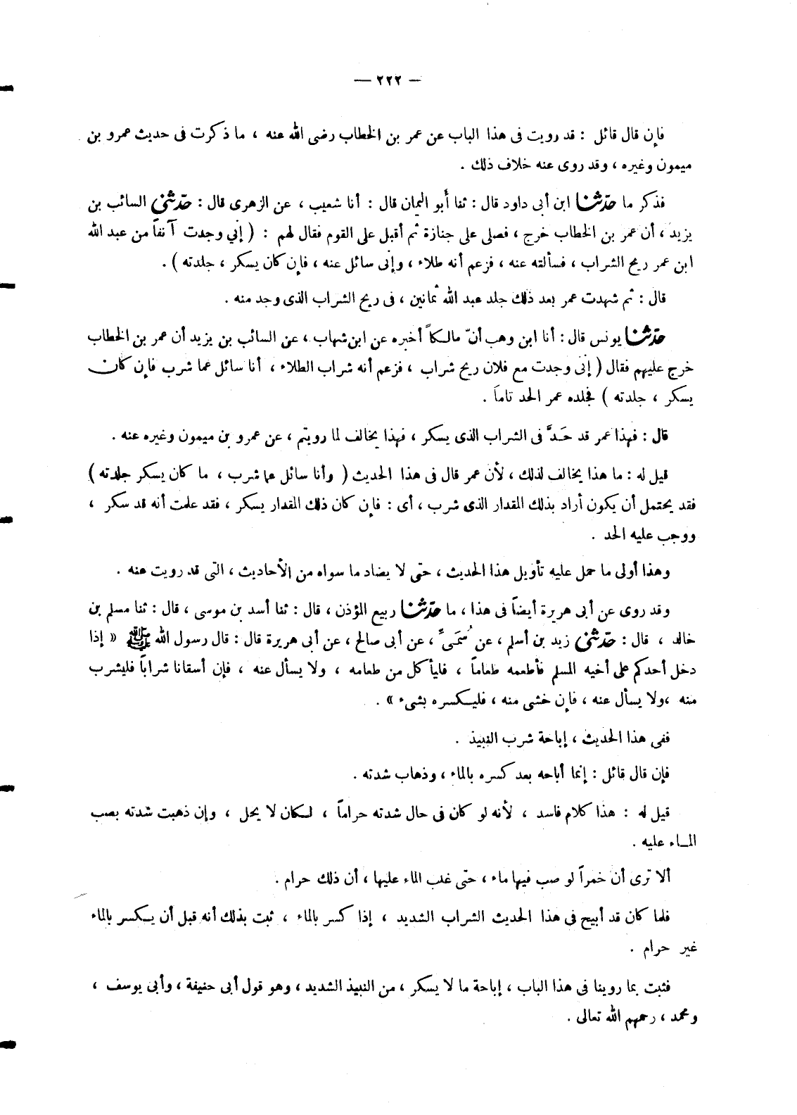 6482 - قَالَ: فَهَذَا عُمَرُ قَدْ حَدَّ فِي الشَّرَابِ الَّذِي يُسْكِرُ , فَهَذَا يُخَالِفُ لِمَا رَوَيْتُمْ عَنْ عَمْرِو بْنِ مَيْمُونٍ وَغَيْرِهِ عَنْهُ. قِيلَ لَهُ: مَا هَذَا يُخَالِفُ لِذَلِكَ , لِأَنَّ عُمَرَ قَالَ فِي هَذَا الْحَدِيثِ: وَأَنَا سَائِلٌ عَمَّا شَرِبَ , فَإِنْ كَانَ يُسْكِرُ جَلَدْتُهُ. فَقَدْ يَحْتَمِلُ أَنْ يَكُونَ أَرَادَ بِذَلِكَ: الْمِقْدَارَ الَّذِي شَرِبَ , أَيْ: فَإِنْ كَانَ ذَلِكَ الْمِقْدَارُ يُسْكِرُ , فَقَدْ عَلِمْتُ أَنَّهُ قَدْ سَكِرَ , وَوَجَبَ عَلَيْهِ الْحَدُّ. وَهَذَا أَوْلَى مَا حُمِلَ عَلَيْهِ تَأْوِيلُ هَذَا الْحَدِيثِ , حَتَّى لَا يُضَادَّ مَا سِوَاهُ مِنَ الْأَحَادِيثِ الَّتِي قَدْ رُوِيَتْ عَنْهُ. وَقَدْ رُوِيَ عَنْ أَبِي هُرَيْرَةَ أَيْضًا فِي هَذَا