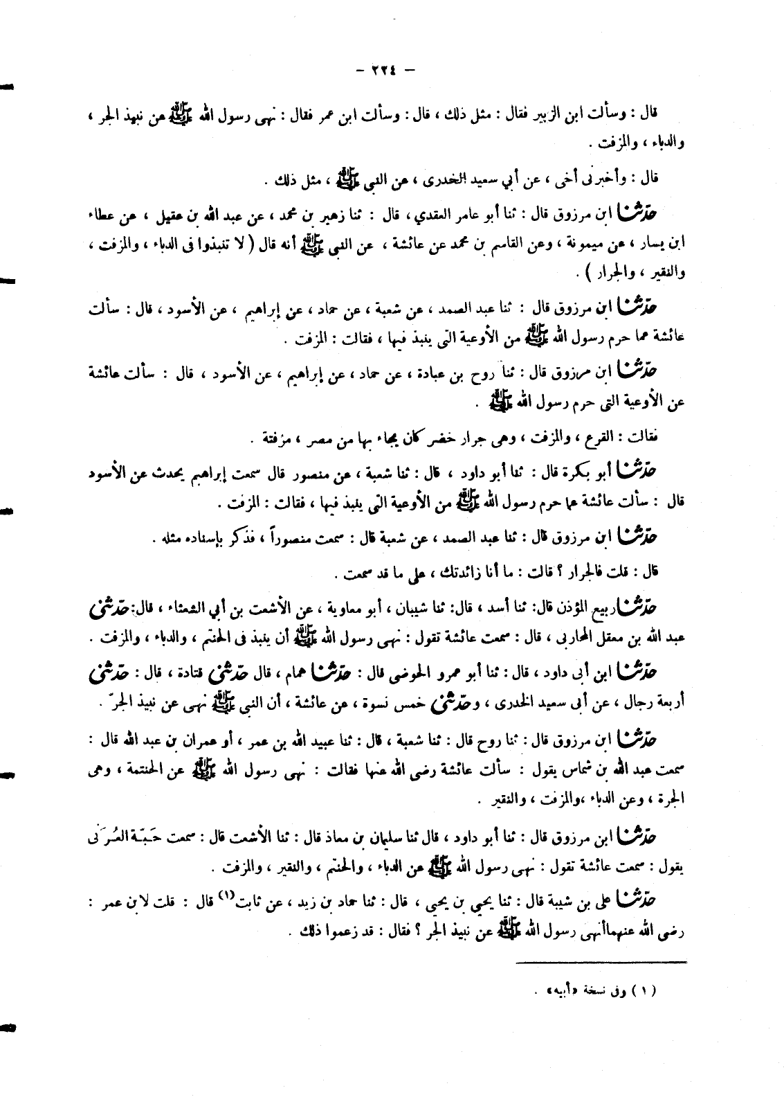 6499 - حَدَّثَنَا ابْنُ أَبِي دَاوُدَ، قَالَ: ثنا أَبُو عُمَرَ الْحَوْضِيُّ، قَالَ: حَدَّثَنَا هَمَّامٌ، قَالَ: حَدَّثَنِي قَتَادَةُ، قَالَ: حَدَّثَنِي أَرْبَعَةُ رِجَالٍ، عَنْ أَبِي سَعِيدٍ الْخُدْرِيِّ، وَحَدَّثَنِي خَمْسُ نِسْوَةٍ، عَنْ عَائِشَةَ، أَنَّ النَّبِيَّ صَلَّى اللَّهُ عَلَيْهِ وَسَلَّمَ §نَهَى عَنْ نَبِيذِ الْجَرِّ "