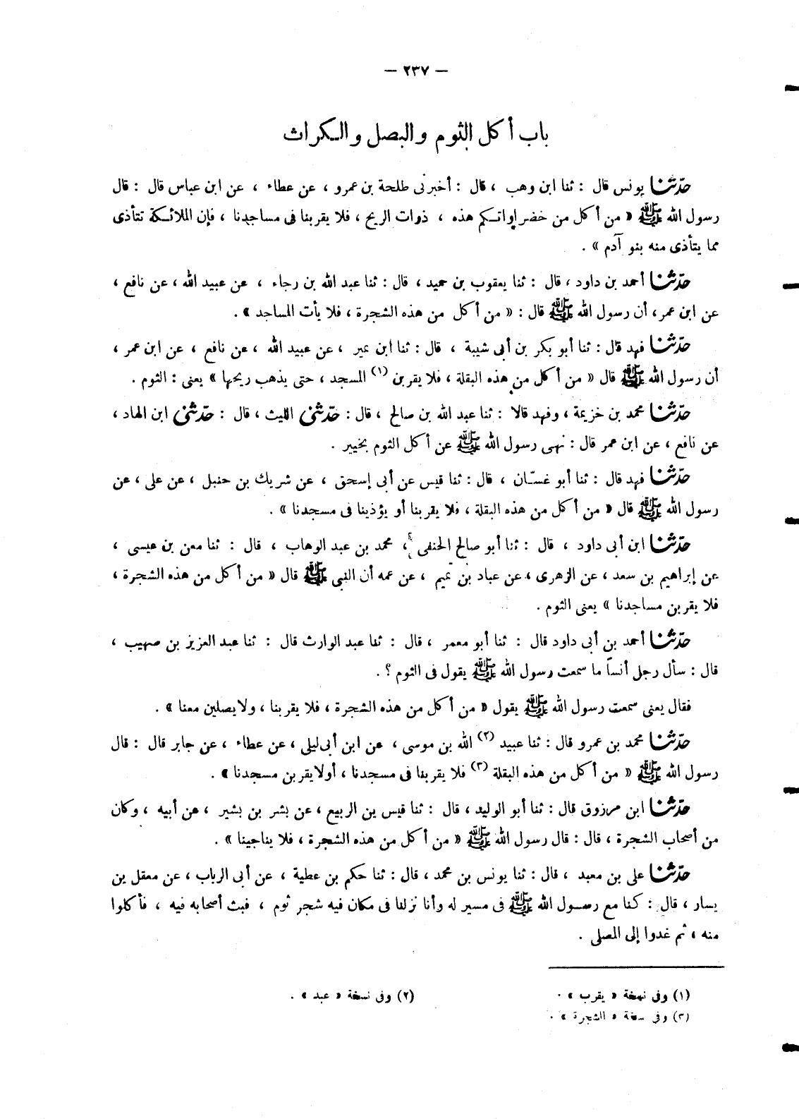 6606 - حَدَّثَنَا فَهْدٌ، قَالَ: ثنا أَبُو غَسَّانَ، قَالَ: ثنا قَيْسٌ، عَنْ أَبِي إِسْحَاقَ، عَنْ شَرِيكِ بْنِ حَنْبَلٍ، عَنْ عَلِيٍّ، عَنْ رَسُولِ اللهِ صَلَّى اللَّهُ عَلَيْهِ وَسَلَّمَ قَالَ «§مَنْ أَكَلَ مِنْ هَذِهِ الْبَقْلَةِ , فَلَا يَقْرَبَنَّا أَوْ يُؤْذِيَنَّا فِي مَسْجِدِنَا»
