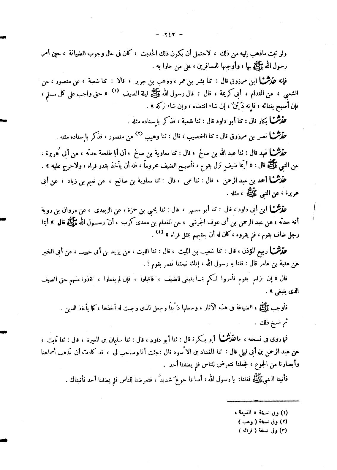 جَبَ صَلَّى اللَّهُ عَلَيْهِ وَسَلَّمَ الضِّيَافَةَ فِي هَذِهِ الْآثَارِ , وَجَعَلَهَا دَيْنًا وَجَعَلَ لِلَّذِي وَجَبَتْ لَهُ أَخْذَهَا , كَمَا يَأْخُذُ الدَّيْنَ. ثُمَّ نَسَخَ ذَلِكَ. فَمِمَّا رُوِيَ فِي نَسْخِهِ