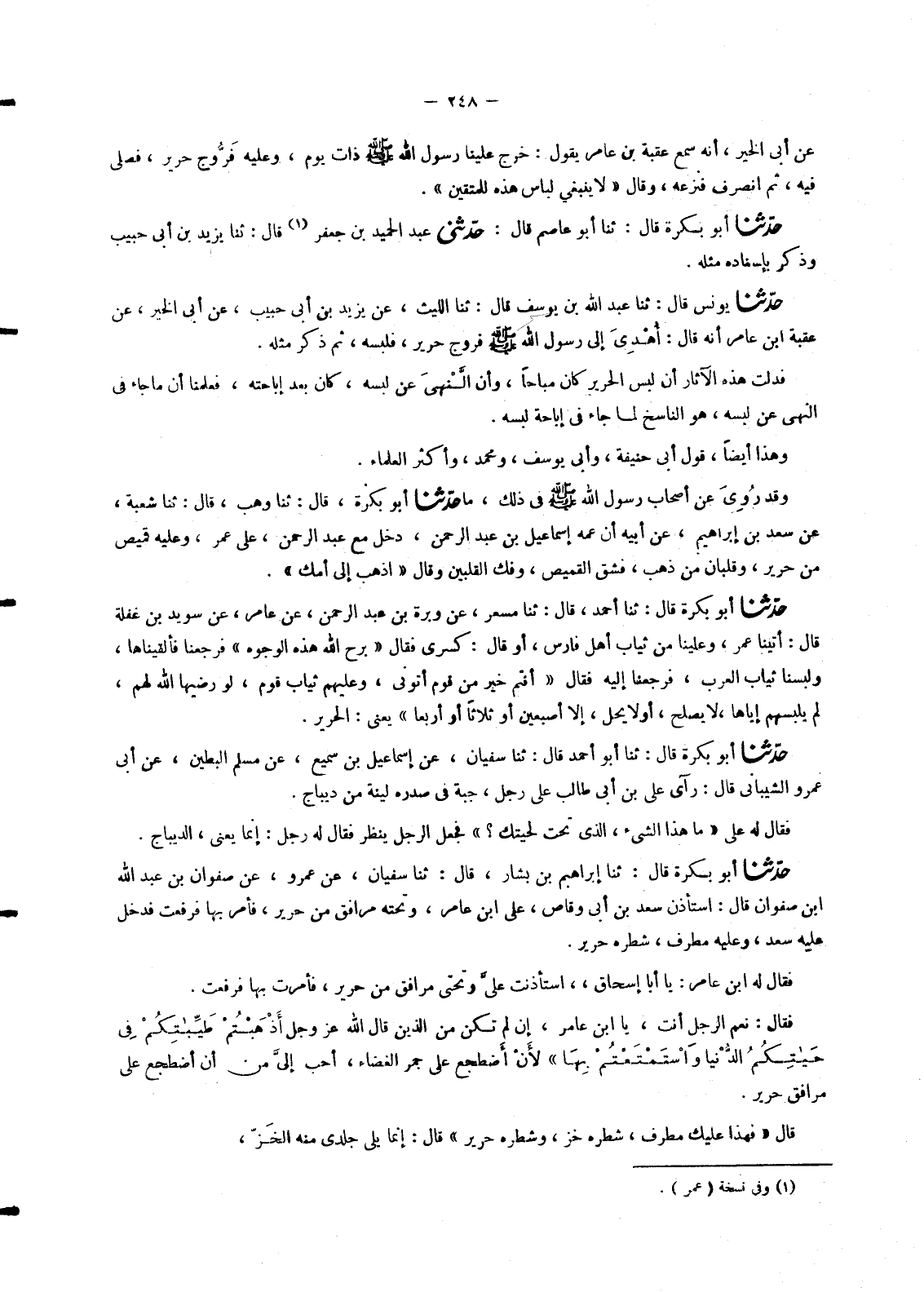 6684 - حَدَّثَنَا أَبُو بَكْرَةَ، قَالَ: ثنا أَبُو أَحْمَدَ، قَالَ: ثنا مِسْعَرٌ، عَنْ وَبَرَةَ بْنِ عَبْدِ الرَّحْمَنِ، عَنْ عَامِرٍ، عَنْ سُوَيْدِ بْنِ غَفَلَةَ، قَالَ: أَتَيْنَا عُمَرَ , وَعَلَيْنَا مِنْ ثِيَابِ أَهْلِ فَارِسٍ , أَوْ قَالَ: كِسْرَى فَقَالَ: «بَرَّحَ اللهُ هَذِهِ الْوُجُوهَ» ، فَرَجَعْنَا فَأَلْقَيْنَاهَا , وَلَبِسْنَا ثِيَابَ الْعَرَبِ , فَرَجَعْنَا إِلَيْهِ فَقَالَ: " أَنْتُمْ خَيْرٌ مِنْ قَوْمٍ أَتَوْنِي , وَعَلَيْهِمْ ثِيَابُ قَوْمٍ , §لَوْ رَضِيَهَا اللهُ لَهُمْ , لَمْ يُلْبِسْهُمْ إِيَّاهَا , لَا يَصْلُحُ , أَوْ لَا يَحِلُّ , إِلَّا أُصْبُعَيْنِ أَوْ ثَلَاثًا أَوْ أَرْبَعًا يَعْنِي: الْحَرِيرَ "
