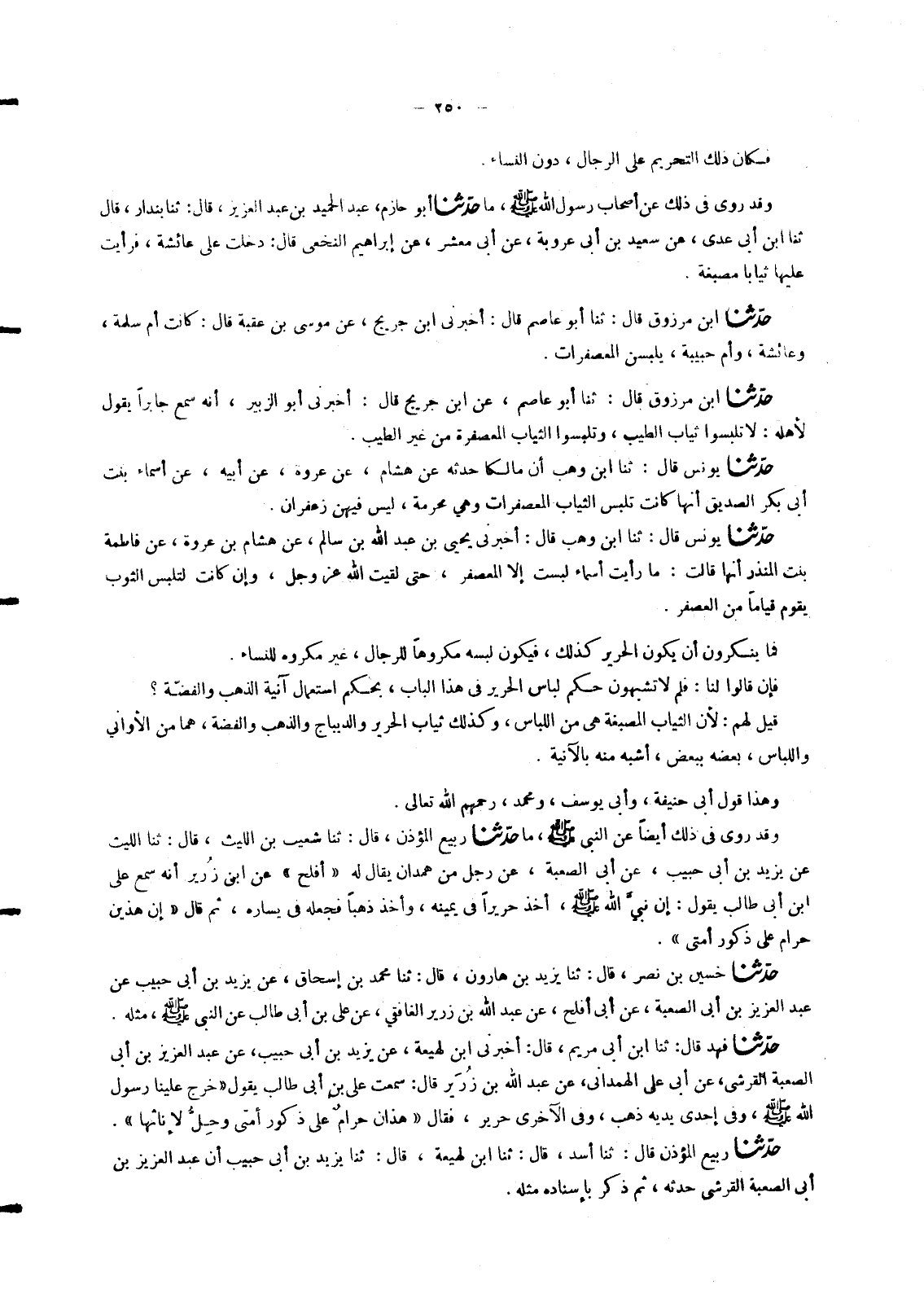 6693 - حَدَّثَنَا ابْنُ مَرْزُوقٍ، قَالَ: ثنا أَبُو عَاصِمٍ، قَالَ: أَخْبَرَنِي ابْنُ جُرَيْجٍ، عَنْ مُوسَى بْنِ عُقْبَةَ، قَالَ: كَانَتْ أُمُّ سَلَمَةَ , وَعَائِشَةُ , وَأُمُّ حَبِيبَةَ , §يَلْبَسْنَ الْمُعَصْفَرَاتِ "