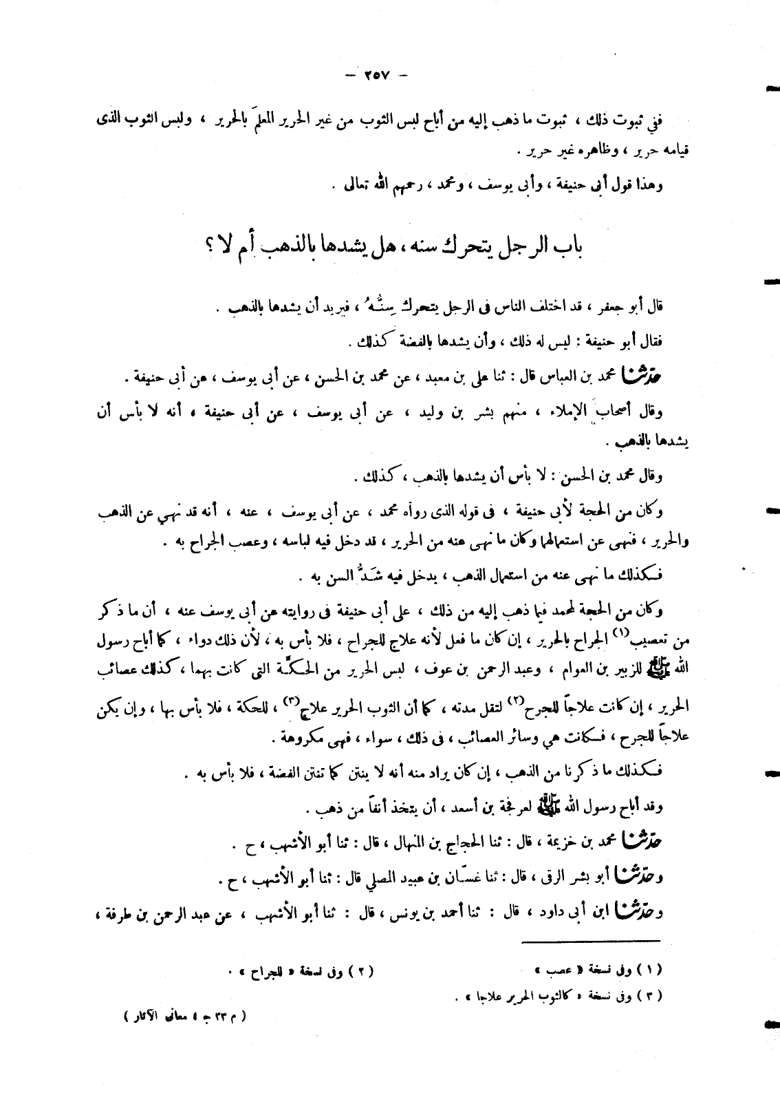 6742 - حَدَّثَنَا مُحَمَّدُ بْنُ الْعَبَّاسِ، قَالَ: ثنا عَلِيُّ بْنُ مَعْبَدٍ، عَنْ مُحَمَّدِ بْنِ الْحَسَنِ، عَنْ أَبِي يُوسُفَ، عَنْ أَبِي حَنِيفَةَ،. وَقَالَ أَصْحَابُ الْإِمْلَاءِ , مِنْهُمْ بِشْرُ بْنُ وَلِيدٍ , عَنْ أَبِي يُوسُفَ، عَنْ أَبِي حَنِيفَةَ: «أَنَّهُ §لَا بَأْسَ أَنْ يَشُدَّهَا، بِالذَّهَبِ» وَقَالَ مُحَمَّدُ بْنُ الْحَسَنِ: لَا بَأْسَ أَنْ يَشُدَّهَا بِالذَّهَبِ , كَذَلِكَ. وَكَانَ مِنَ الْحُجَّةِ لِأَبِي حَنِيفَةَ , فِي قَوْلِهِ الَّذِي رَوَاهُ مُحَمَّدٌ , عَنْ أَبِي يُوسُفَ , عَنْهُ , أَنَّهُ قَدْ نُهِيَ عَنِ الذَّهَبِ وَالْحَرِيرِ , فَنُهِيَ عَنِ اسْتِعْمَالِهِمَا وَكَانَ مَا نُهِيَ عَنْهُ مِنَ الْحَرِيرِ , قَدْ دَخَلَ فِيهِ لِبَاسُهُ , وَعَصَبُ الْجِرَاحِ بِهِ. فَكَذَلِكَ مَا نُهِيَ عَنْهُ مِنَ اسْتِعْمَالِ الذَّهَبِ , يَدْخُلُ فِيهِ شَدُّ السِّنِّ بِهِ. وَكَانَ مِنَ الْحُجَّةِ لِمُحَمَّدٍ فِيمَا ذَهَبَ إِلَيْهِ مِنْ ذَلِكَ , عَلَى أَبِي حَنِيفَةَ فِي رِوَايَتِهِ عَنْ أَبِي يُوسُفَ عَنْهُ , أَنَّ مَا ذُكِرَ مِنْ تَعْصِيبِ الْجِرَاحِ بِالْحَرِيرِ , إِنْ كَانَ مَا فَعَلَ ; لِأَنَّهُ عِلَاجٌ لِلْجِرَاحِ , فَلَا بَأْسَ بِهِ , ; لِأَنَّ ذَلِكَ دَوَاءٌ , كَمَا أَبَاحَ رَسُولُ اللهِ صَلَّى اللَّهُ عَلَيْهِ وَسَلَّمَ لِلزُّبَيْرِ بْنِ الْعَوَّامِ , وَعَبْدِ الرَّحْمَنِ بْنِ عَوْفٍ , لُبْسَ الْحَرِيرِ مِنَ الْحَكَّةِ الَّتِي كَانَتْ بِهِمَا , كَذَلِكَ عَصَائِبُ الْحَرِيرِ , إِنْ كَانَتْ عِلَاجًا لِلْجُرْحِ لِتَقِلَّ مِدَّتُهُ , كَمَا أَنَّ الثَّوْبَ الْحَرِيرَ عِلَاجٌ , لِلْحَكَّةِ , فَلَا بَأْسَ بِهَا , وَإِنْ يَكُنْ عِلَاجًا لِلْجُرْحِ , فَكَانَتْ هِيَ وَسَائِرُ الْعَصَائِبِ فِي ذَلِكَ سَوَاءً , فَهِيَ مَكْرُوهَةٌ. فَكَذَلِكَ مَا ذَكَرْنَا مِنَ الذَّهَبِ , إِنْ كَانَ يُرَادُ مِنْهُ أَنَّهُ لَا يُنْتِنُ كَمَا تُنْتِنُ الْفِضَّةُ , فَلَا بَأْسَ بِهِ , وَقَدْ أَبَاحَ رَسُولُ اللهِ صَلَّى اللَّهُ عَلَيْهِ وَسَلَّمَ لِعَرْفَجَةَ بْنِ أَسْعَدَ , أَنْ يَتَّخِذَ أَنْفًا مِنْ ذَهَبٍ
