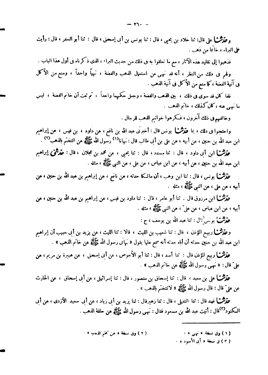 6758 - بِمَا حَدَّثَنَا يُونُسُ قَالَ: أَخْبَرَنِي عَبْدُ اللهِ بْنُ نَافِعٍ , عَنْ دَاوُدَ بْنِ قَيْسٍ , عَنْ إِبْرَاهِيمَ بْنِ عَبْدِ اللهِ بْنِ حُنَيْنٍ , عَنْ أَبِيهِ , عَنْ عَلِيِّ بْنِ أَبِي طَالِبٍ قَالَ: «§نَهَانَا رَسُولُ اللهِ صَلَّى اللَّهُ عَلَيْهِ وَسَلَّمَ عَنِ التَّخَتُّمِ بِالذَّهَبِ»