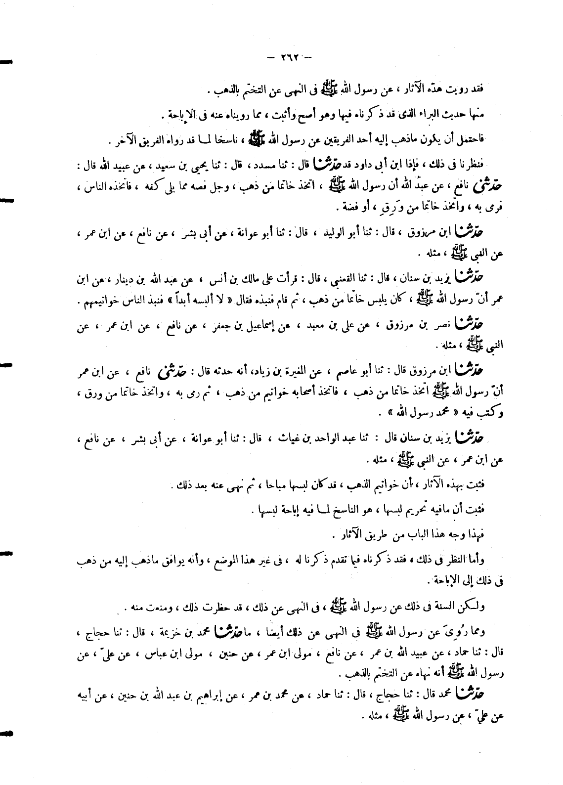 6781 - حَدَّثَنَا يَزِيدُ بْنُ سِنَانٍ، قَالَ: ثنا عَبْدُ الْوَاحِدِ بْنُ غِيَاثٍ، قَالَ: ثنا أَبُو عَوَانَةَ، عَنْ أَبِي بِشْرٍ، عَنْ نَافِعٍ، عَنِ ابْنِ عُمَرَ، عَنِ النَّبِيِّ صَلَّى اللَّهُ عَلَيْهِ وَسَلَّمَ مِثْلَهُ فَثَبَتَ بِهَذِهِ الْآثَارِ , أَنَّ خَوَاتِيمَ الذَّهَبِ , قَدْ كَانَ لُبْسُهَا مُبَاحًا , ثُمَّ نَهَى عَنْهُ بَعْدَ ذَلِكَ. فَثَبَتَ أَنَّ مَا فِيهِ تَحْرِيمُ لُبْسِهَا , هُوَ النَّاسِخُ لِمَا فِيهِ إِبَاحَةُ لُبْسِهَا. فَهَذَا وَجْهُ هَذَا الْبَابِ مِنْ طَرِيقِ الْآثَارِ. وَأَمَّا النَّظَرُ فِي ذَلِكَ , فَقَدْ ذَكَرْنَاهُ فِيمَا تَقَدَّمَ ذِكْرُنَا لَهُ , فِي غَيْرِ هَذَا الْمَوْضِعِ , وَأَنَّهُ يُوَافِقُ مَا ذَهَبَ إِلَيْهِ مَنْ ذَهَبَ فِي ذَلِكَ إِلَى الْإِبَاحَةِ. وَلَكِنَّ السُّنَّةَ فِي ذَلِكَ عَنْ رَسُولِ اللهِ صَلَّى اللَّهُ عَلَيْهِ وَسَلَّمَ فِي النَّهْيِ عَنْ ذَلِكَ , قَدْ حَظَرَتْ ذَلِكَ , وَمَنَعَتْ مِنْهُ. وَمِمَّا رُوِيَ عَنْ رَسُولِ اللهِ صَلَّى اللَّهُ عَلَيْهِ وَسَلَّمَ فِي النَّهْيِ عَنْ ذَلِكَ أَيْضًا