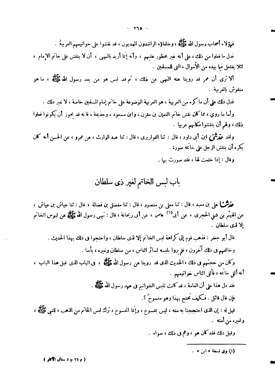 6798 - حَدَّثَنَا عَلِيُّ بْنُ مَعْبَدٍ , قَالَ: ثنا مُعَلَّى بْنُ مَنْصُورٍ , قَالَ: ثنا مُفَضَّلُ بْنُ فَضَالَةَ , قَالَ: ثنا عَيَّاشُ بْنُ عَيَّاشٍ , عَنِ الْهَيْثَمِ بْنِ شُفَيٍّ الْحَجَرِيِّ , عَنْ أَبِي عَامِرٍ , عَنْ أَبِي رَيْحَانَةَ , قَالَ: «§نَهَى رَسُولُ اللهِ صَلَّى اللَّهُ عَلَيْهِ وَسَلَّمَ عَنْ لُبُوسِ الْخَاتَمِ إِلَّا لِذِي سُلْطَانٍ» قَالَ أَبُو جَعْفَرٍ: فَذَهَبَ قَوْمٌ إِلَى كَرَاهَةِ لُبْسِ الْخَاتَمِ إِلَّا لِذِي سُلْطَانٍ , وَاحْتَجُّوا فِي ذَلِكَ بِهَذَا الْحَدِيثِ. وَخَالَفَهُمْ فِي ذَلِكَ آخَرُونَ , فَلَمْ يَرَوْا بِلُبْسِهِ لِسَائِرِ النَّاسِ , مِنْ سُلْطَانٍ وَغَيْرِهِ , بَأْسًا. وَكَانَ مِنْ حُجَّتِهِمْ فِي ذَلِكَ , الْحَدِيثُ الَّذِي قَدْ رَوَيْنَا عَنْ رَسُولِ اللهِ صَلَّى اللَّهُ عَلَيْهِ وَسَلَّمَ فِي الْبَابِ الَّذِي قَبْلَ هَذَا الْبَابِ , أَنَّهُ أَلْقَى خَاتَمَهُ , فَأَلْقَى النَّاسُ خَوَاتِيمَهُمْ. فَقَدْ دَلَّ هَذَا عَلَى أَنَّ الْعَامَّةَ , قَدْ كَانَتْ تَلْبَسُ الْخَوَاتِيمَ فِي عَهْدِ رَسُولِ اللهِ صَلَّى اللَّهُ عَلَيْهِ وَسَلَّمَ. فَإِنْ قَالَ قَائِلٌ. فَكَيْفَ تَحْتَجُّ بِهَذَا وَهُوَ مَنْسُوخٌ؟ . قِيلَ لَهُ: إِنَّ الَّذِي احْتَجَجْنَا بِهِ مِنْهُ , لَيْسَ بِمَنْسُوخٍ , وَإِنَّمَا الْمَنْسُوخُ , تَرْكُ لُبْسِ الْخَاتَمِ مِنَ الذَّهَبِ , لِلنَّبِيِّ صَلَّى اللَّهُ عَلَيْهِ وَسَلَّمَ وَلِغَيْرِهِ مِنْ أُمَّتِهِ. وَقَبْلَ ذَلِكَ فَقَدْ كَانَ هُوَ , وَهُمْ فِي ذَلِكَ سَوَاءً. -[266]- فَلَمَّا نُسِخَ لُبْسُ خَوَاتِيمِ الذَّهَبِ , كَانَ الْحَكَمُ مُتَقَدِّمًا فِي لُبْسِهِ وَلُبْسِهِمِ الْخَوَاتِيمَ , سَوَاءً , وَكَأَنَّ النَّسْخَ لَمْ يَمْنَعْهُ , هُوَ صَلَّى اللَّهُ عَلَيْهِ وَسَلَّمَ مِنْ لُبْسِ خَاتَمِ الْفِضَّةِ , فَكَذَلِكَ أَيْضًا لَا يَمْنَعُهُمْ مِنْ لُبْسِ الْخَوَاتِيمِ مِنْ فِضَّةٍ. فَهَذَا الَّذِي أَرَدْنَا مِنْ هَذَا الْحَدِيثِ. وَقَدْ رُوِيَ عَنْ جَمَاعَةٍ مِمَّنْ لَمْ يَكُنْ لَهُمْ سُلْطَانٌ , أَنَّهُمْ كَانُوا يَلْبَسُونَ الْخَوَاتِيمَ. فَمِمَّا رُوِيَ فِي ذَلِكَ
