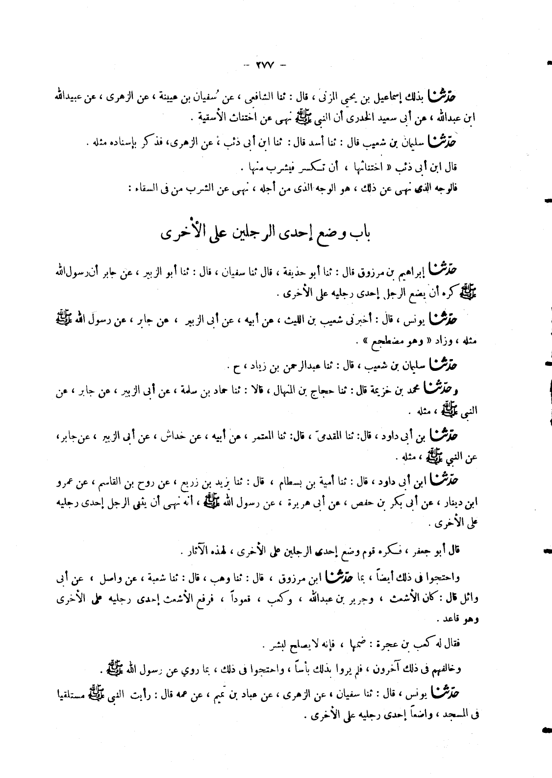 6882 - حَدَّثَنَا يُونُسُ، قَالَ: ثنا سُفْيَانُ، عَنِ الزُّهْرِيِّ، عَنْ عَبَّادِ بْنِ تَمِيمٍ، عَنْ عَمِّهِ، قَالَ: «رَأَيْتُ النَّبِيَّ صَلَّى اللَّهُ عَلَيْهِ وَسَلَّمَ §مُسْتَلْقِيًا فِي الْمَسْجِدِ , وَاضِعًا إِحْدَى رِجْلَيْهِ عَلَى الْأُخْرَى» -[278]-