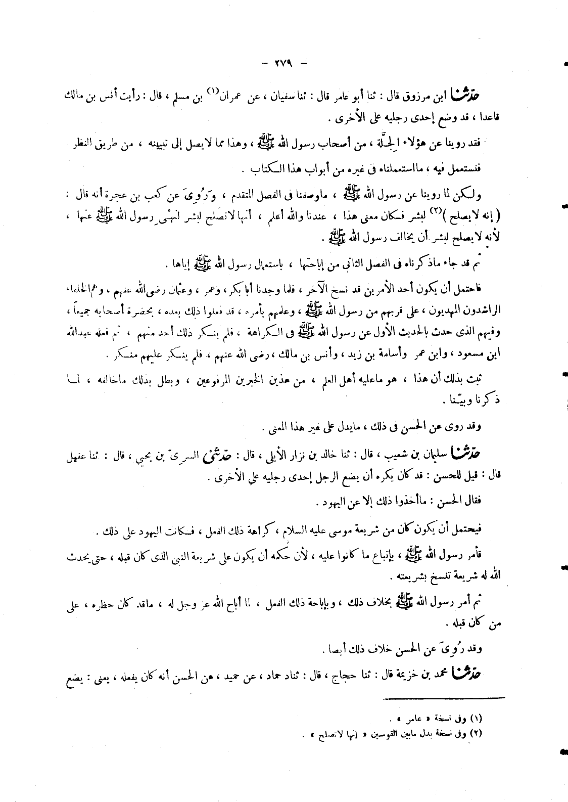 6895 - حَدَّثَنَا ابْنُ مَرْزُوقٍ قَالَ: ثنا أَبُو عَامِرٍ قَالَ: ثنا سُفْيَانُ , عَنْ عِمْرَانَ بْنِ مُسْلِمٍ , قَالَ: رَأَيْتُ أَنَسَ بْنَ مَالِكٍ §قَاعِدًا , قَدْ وَضَعَ إِحْدَى رِجْلَيْهِ عَلَى الْأُخْرَى " فَقَدْ رَوَيْنَا عَنْ هَؤُلَاءِ الْجِلَّةِ , مِنْ أَصْحَابِ رَسُولِ اللهِ صَلَّى اللَّهُ عَلَيْهِ وَسَلَّمَ وَهَذَا مِمَّا لَا يَصِلُ إِلَى تَبْيِينِهِ , مِنْ طَرِيقِ النَّظَرِ فَنَسْتَعْمِلَ فِيهِ , مَا اسْتَعْمَلْنَاهُ فِي غَيْرِهِ مِنْ أَبْوَابِ هَذَا الْكِتَابِ. وَلَكِنْ لِمَا رَوَيْنَا عَنْ رَسُولِ اللهِ صَلَّى اللَّهُ عَلَيْهِ وَسَلَّمَ مَا وَصَفْنَا فِي الْفَصْلِ الْمُتَقَدِّمِ , وَرُوِيَ عَنْ كَعْبِ بْنِ عُجْرَةَ أَنَّهُ قَالَ: إِنَّهُ لَا يَصْلُحُ لِبَشَرٍ، فَكَانَ مَعْنَى هَذَا , عِنْدَنَا وَاللهُ أَعْلَمُ , أَنَّهَا لَا تَصْلُحُ لِبَشَرٍ لِنَهْيِ رَسُولِ اللهِ صَلَّى اللَّهُ عَلَيْهِ وَسَلَّمَ عَنْهَا , ; لِأَنَّهُ لَا يَصْلُحُ لِبَشَرٍ أَنْ يُخَالِفَ رَسُولَ اللهِ صَلَّى اللَّهُ عَلَيْهِ وَسَلَّمَ. ثُمَّ قَدْ جَاءَ مَا ذَكَرْنَاهُ فِي الْفَصْلِ الثَّانِي مِنْ إِبَاحَتِهَا , بِاسْتِعْمَالِ رَسُولِ اللهِ صَلَّى اللَّهُ عَلَيْهِ وَسَلَّمَ إِيَّاهَا. فَاحْتَمَلَ أَنْ يَكُونَ أَحَدُ الْأَمْرَيْنِ قَدْ نَسَخَ الْآخَرَ , فَلَمَّا وَجَدْنَا أَبَا بَكْرٍ , وَعُمَرَ , وَعُثْمَانَ رَضِيَ اللهُ عَنْهُمْ , وَهُمُ الْخُلَفَاءُ الرَّاشِدُونَ الْمَهْدِيُّونَ , عَلَى قُرْبِهِمْ مِنْ رَسُولِ اللهِ صَلَّى اللَّهُ عَلَيْهِ وَسَلَّمَ وَعِلْمِهِمْ بِأَمْرِهِ , قَدْ فَعَلُوا ذَلِكَ بَعْدَهُ , بِحَضْرَةِ أَصْحَابِهِ جَمِيعًا , وَفِيهِمِ الَّذِي حَدَّثَ بِالْحَدِيثِ الْأَوَّلِ عَنْ رَسُولِ اللهِ صَلَّى اللَّهُ عَلَيْهِ وَسَلَّمَ فِي الْكَرَاهَةِ , فَلَمْ يُنْكِرْ ذَلِكَ أَحَدٌ مِنْهُمْ , ثُمَّ فَعَلَهُ عَبْدُ اللهِ بْنُ مَسْعُودٍ , وَابْنُ عُمَرَ وَأُسَامَةُ بْنُ زَيْدٍ , وَأَنَسُ بْنُ مَالِكٍ رَضِيَ اللهُ عَنْهُمْ , فَلَمْ يُنْكِرْ عَلَيْهِمْ مُنْكِرٌ. ثَبَتَ بِذَلِكَ أَنَّ هَذَا , هُوَ مَا عَلَيْهِ أَهْلُ الْعِلْمِ , مِنْ هَذَيْنِ الْخَبَرَيْنِ الْمَرْفُوعَيْنِ , وَبَطَلَ بِذَلِكَ مَا خَالَفَهُ ; لِمَا ذَكَرْنَا وَبَيَّنَّا. وَقَدْ رُوِيَ عَنِ الْحَسَنِ فِي ذَلِكَ , مَا يَدُلُّ عَلَى غَيْرِ هَذَا الْمَعْنَى