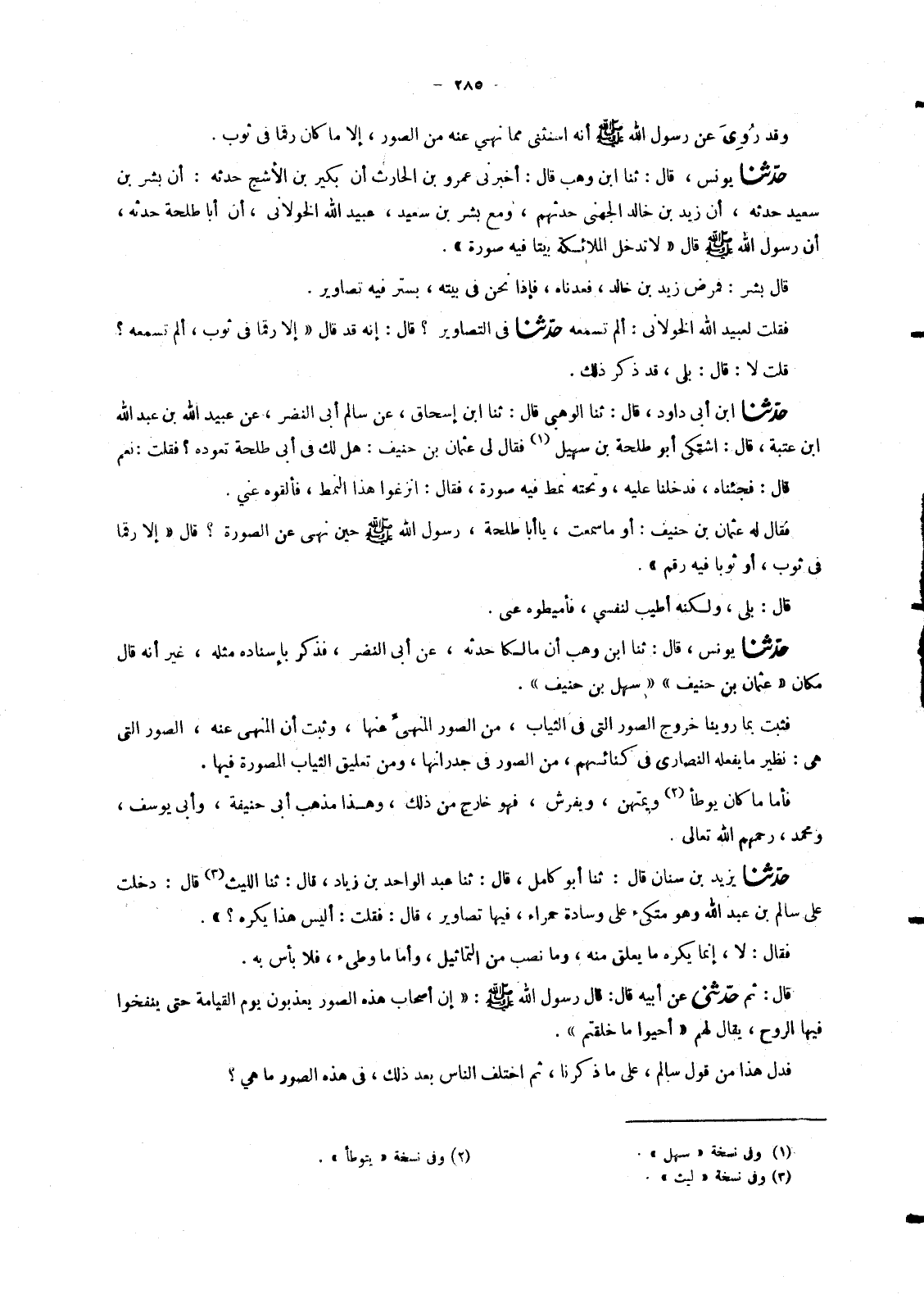 6934 - حَدَّثَنَا يُونُسُ، قَالَ: ثنا ابْنُ وَهْبٍ، أَنَّ مَالِكًا، حَدَّثَهُ , عَنْ أَبِي النَّضْرِ، فَذَكَرَ بِإِسْنَادِهِ مِثْلَهُ , غَيْرَ أَنَّهُ قَالَ مَكَانَ عُثْمَانَ بْنِ حُنَيْفٍ سَهْلُ بْنُ حُنَيْفٍ فَثَبَتَ بِمَا رَوَيْنَا خُرُوجُ الصُّوَرِ الَّتِي فِي الثِّيَابِ , مِنَ الصُّوَرِ الْمَنْهِيِّ عَنْهَا , وَثَبَتَ أَنَّ الْمَنْهِيَّ عَنْهُ , الصُّوَرُ الَّتِي هِيَ: نَظِيرُ مَا يَفْعَلُهُ النَّصَارَى فِي كَنَائِسِهِمْ , مِنَ الصُّوَرِ فِي جُدْرَانِهَا , وَمِنْ تَعْلِيقِ الثِّيَابِ الْمُصَوَّرَةِ فِيهَا. فَأَمَّا مَا كَانَ يُوطَأُ وَيُمْتَهَنُ , وَيُفْرَشُ , فَهُوَ خَارِجٌ مِنْ ذَلِكَ , وَهَذَا مَذْهَبُ أَبِي حَنِيفَةَ , وَأَبِي يُوسُفَ , وَمُحَمَّدٍ , رَحِمَهُمُ اللهُ تَعَالَى
