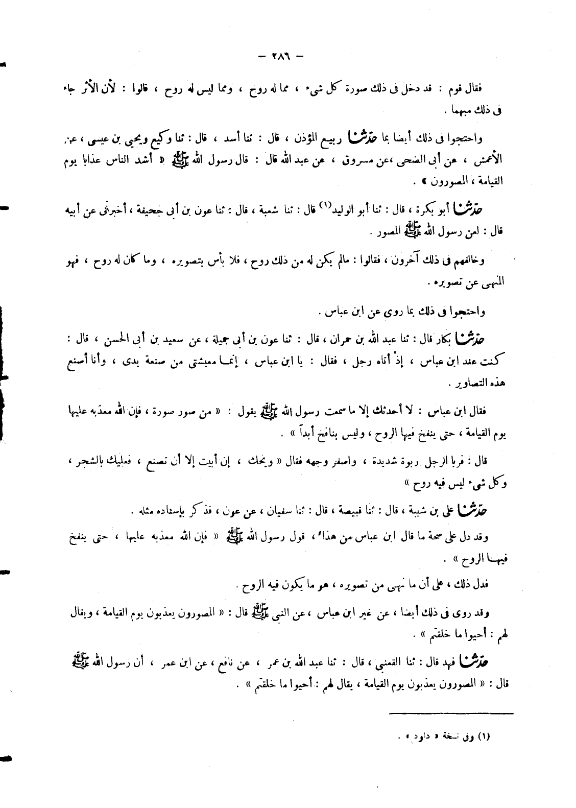 6940 - حَدَّثَنَا عَلِيُّ بْنُ شَيْبَةَ، قَالَ: ثنا قَبِيصَةُ، قَالَ: ثنا سُفْيَانُ، عَنْ عَوْنٍ، فَذَكَرَ بِإِسْنَادِهِ مِثْلَهُ وَقَدْ دَلَّ عَلَى صِحَّةِ مَا قَالَ ابْنُ عَبَّاسٍ مِنْ هَذَا , قَوْلُ رَسُولِ اللهِ صَلَّى اللَّهُ عَلَيْهِ وَسَلَّمَ فَإِنَّ اللهَ مُعَذِّبُهُ عَلَيْهَا , حَتَّى يَنْفُخَ فِيهَا الرُّوحَ. فَدَلَّ ذَلِكَ , عَلَى أَنَّ مَا نُهِيَ مِنْ تَصْوِيرِهِ , هُوَ مَا يَكُونُ فِيهِ الرُّوحُ. وَقَدْ رُوِيَ فِي ذَلِكَ أَيْضًا , عَنْ غَيْرِ ابْنِ عَبَّاسٍ , عَنِ النَّبِيِّ صَلَّى اللَّهُ عَلَيْهِ وَسَلَّمَ قَالَ: " الْمُصَوِّرُونَ يُعَذَّبُونَ يَوْمَ الْقِيَامَةِ , وَيُقَالُ لَهُمْ: أَحْيُوا مَا خَلَقْتُمْ