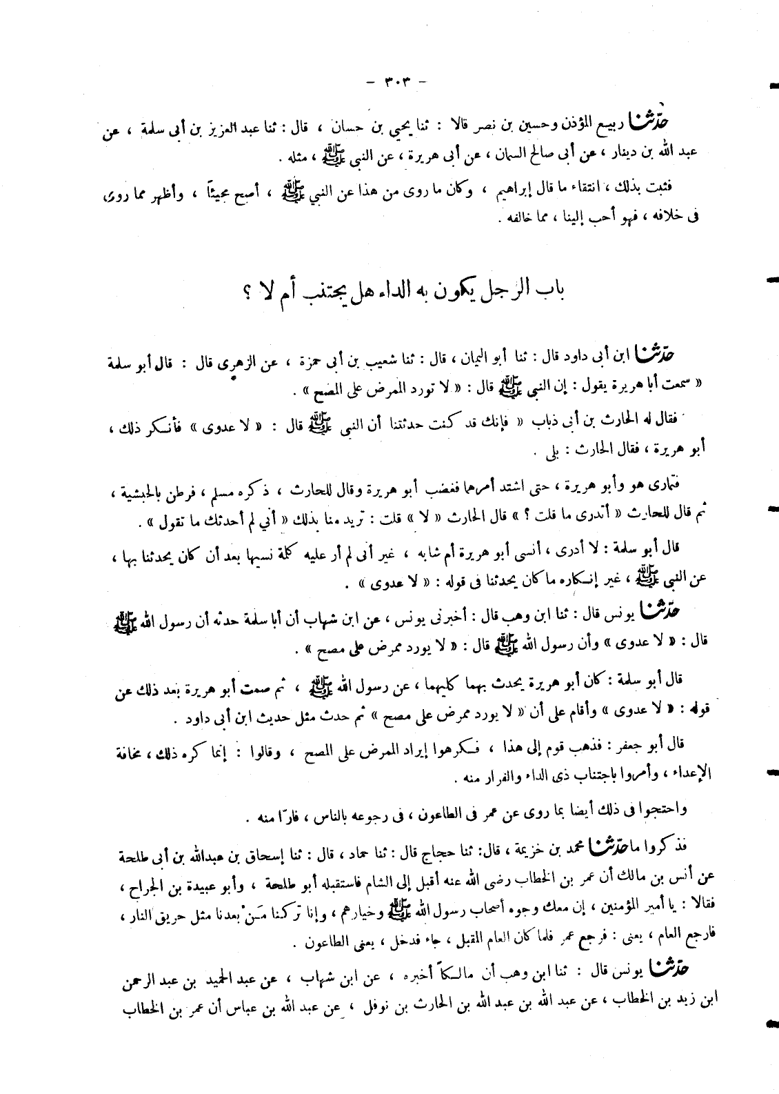 7033 - حَدَّثَنَا يُونُسُ، قَالَ: ثنا ابْنُ وَهْبٍ، قَالَ: أَخْبَرَنِي يُونُسُ، عَنِ ابْنِ شِهَابٍ، أَنَّ أَبَا سَلَمَةَ، حَدَّثَهُ أَنَّ رَسُولَ اللهِ صَلَّى اللَّهُ عَلَيْهِ وَسَلَّمَ قَالَ: «لَا عَدْوَى» وَأَنَّ رَسُولَ اللهِ صَلَّى اللَّهُ عَلَيْهِ وَسَلَّمَ قَالَ: «لَا يُورِدُ مُمْرِضٌ عَلَى مُصِحٍّ» . قَالَ أَبُو سَلَمَةَ: كَانَ أَبُو هُرَيْرَةَ يُحَدِّثُ بِهِمَا كِلَيْهِمَا , عَنْ رَسُولِ اللهِ صَلَّى اللَّهُ عَلَيْهِ وَسَلَّمَ. ثُمَّ. صَمَتَ أَبُو هُرَيْرَةَ بَعْدَ ذَلِكَ عَنْ قَوْلِهِ: لَا عَدْوَى وَأَقَامَ عَلَى أَنَّ لَا يُورِدُ مُمْرِضٌ عَلَى مُصِحٍّ ثُمَّ حَدَثَ مِثْلُ حَدِيثِ ابْنِ أَبِي دَاوُدَ قَالَ أَبُو جَعْفَرٍ: فَذَهَبَ قَوْمٌ إِلَى هَذَا , فَكَرِهُوا إِيرَادَ الْمُمْرِضُ عَلَى الْمُصِحِّ , وَقَالُوا: إِنَّمَا كُرِهَ ذَلِكَ , مَخَافَةَ الْإِعْدَاءِ , وَأُمِرُوا بِاجْتِنَابِ ذِي الدَّاءِ وَالْفِرَارِ مِنْهُ. وَاحْتَجُّوا فِي ذَلِكَ أَيْضًا بِمَا رُوِيَ عَنْ عُمَرَ فِي الطَّاعُونِ , فِي رُجُوعِهِ بِالنَّاسِ , فَارًّا مِنْهُ