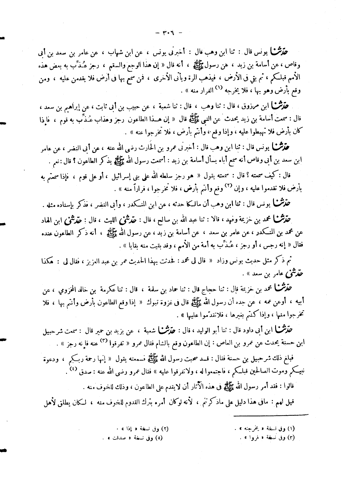 7042 - حَدَّثَنَا يُونُسُ، قَالَ: ثنا ابْنُ وَهْبٍ، قَالَ: أَخْبَرَنِي يُونُسُ، عَنِ ابْنِ شِهَابٍ، عَنْ عَامِرِ بْنِ سَعْدِ بْنِ أَبِي وَقَّاصٍ، عَنْ أُسَامَةَ بْنِ زَيْدٍ، عَنْ رَسُولِ اللهِ صَلَّى اللَّهُ عَلَيْهِ وَسَلَّمَ أَنَّهُ قَالَ: «إِنَّ §هَذَا الْوَجَعَ وَالسَّقَمَ رِجْزٌ وَعَذَابٌ عُذِّبَ بِهِ بَعْضُ هَذِهِ الْأُمَمِ قَبْلَكُمْ , ثُمَّ بَقِيَ فِي الْأَرْضِ , فَيَذْهَبُ الْمَرَّةَ وَيَأْتِي الْأُخْرَى فَمَنْ سَمِعَ بِهَا فِي أَرْضٍ فَلَا يَقْدَمَنَّ عَلَيْهِ , وَمَنْ وَقَعَ بِأَرْضٍ وَهُوَ بِهَا , فَلَا يُخْرِجُهُ الْفِرَارُ مِنْهُ»