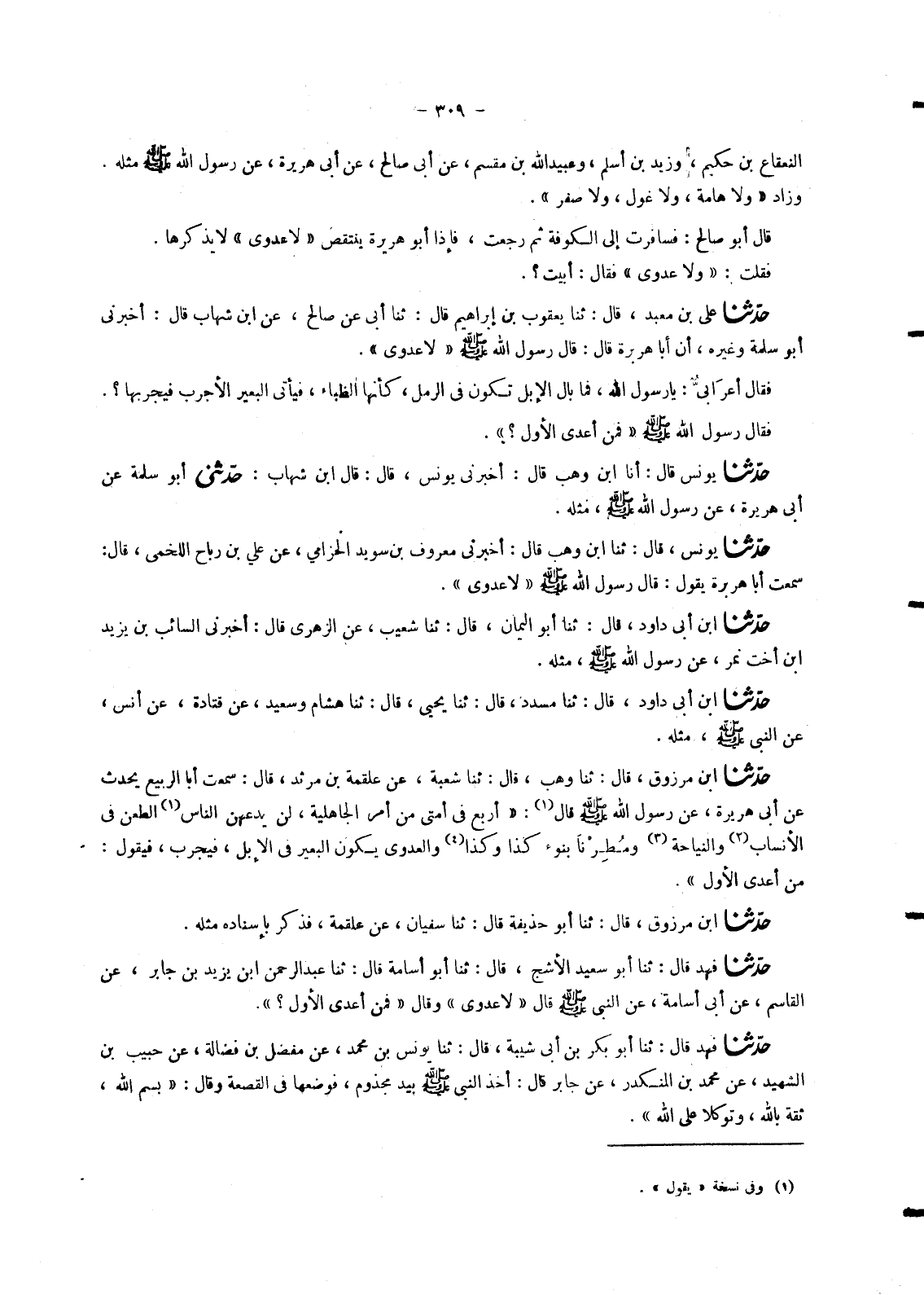 7065 - حَدَّثَنَا عَلِيُّ بْنُ مَعْبَدٍ، قَالَ: ثنا يَعْقُوبُ بْنُ إِبْرَاهِيمَ، قَالَ: ثنا أَبِي، عَنْ صَالِحٍ، عَنِ ابْنِ شِهَابٍ، قَالَ: أَخْبَرَنِي أَبُو سَلَمَةَ، وَغَيْرُهُ، أَنَّ أَبَا هُرَيْرَةَ، قَالَ: قَالَ رَسُولُ اللهِ صَلَّى اللَّهُ عَلَيْهِ وَسَلَّمَ: «§لَا عَدْوَى» . فَقَالَ أَعْرَابِيٌّ: يَا رَسُولَ اللهِ , فَمَا بَالُ الْإِبِلِ تَكُونُ فِي الرَّمْلِ , كَأَنَّهَا الظِّبَاءُ , فَيَأْتِي الْبَعِيرُ الْأَجْرَبُ فَيُجَرِّبُهَا؟ . فَقَالَ رَسُولُ اللهِ صَلَّى اللَّهُ عَلَيْهِ وَسَلَّمَ: «فَمَنْ أَعْدَى الْأَوَّلَ؟»