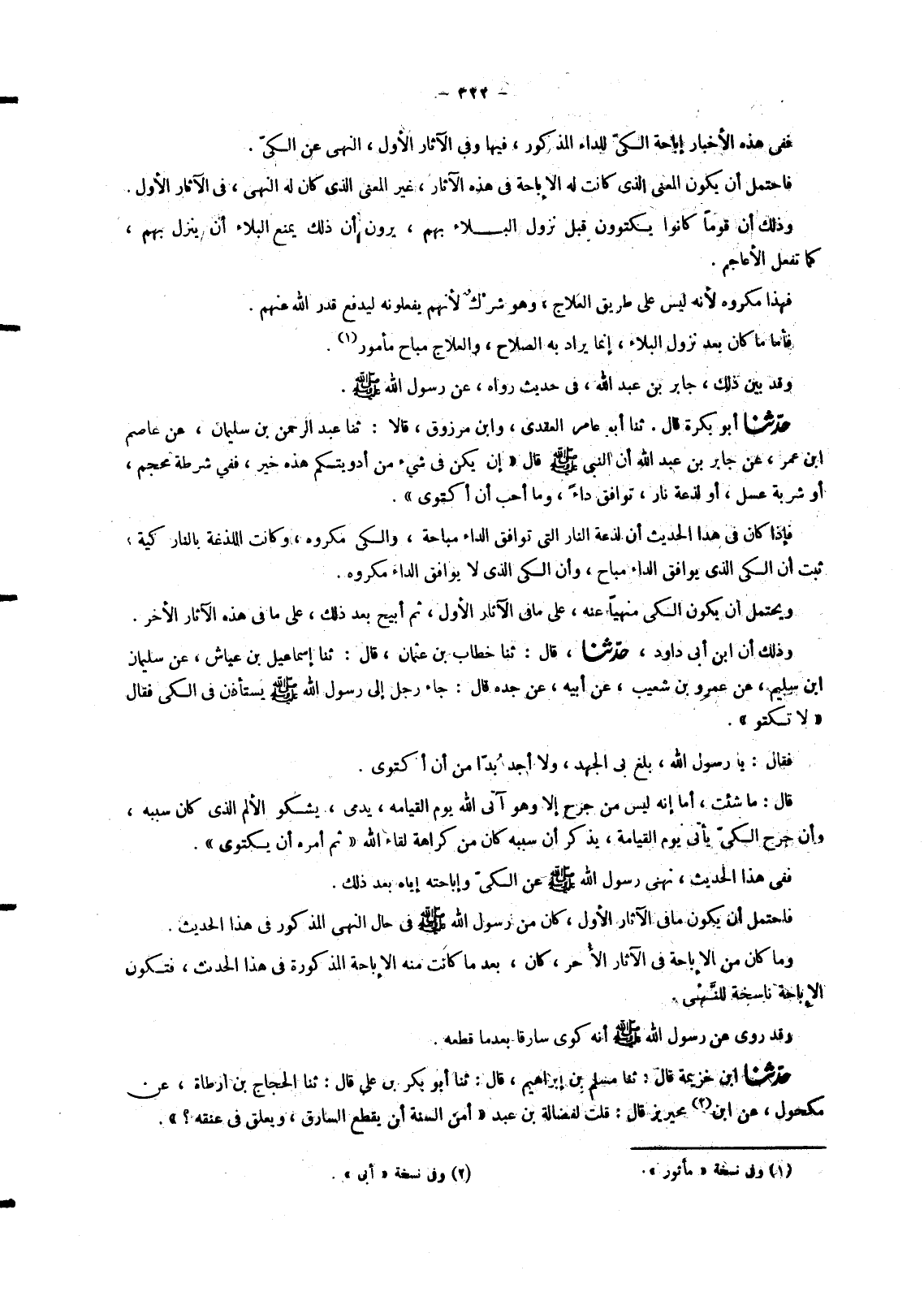 7154 - حَدَّثَنَا أَبُو بَكْرَةَ، قَالَ: ثنا أَبُو عَامِرٍ الْعَقَدِيُّ، وَابْنُ مَرْزُوقٍ، قَالَا: ثنا عَبْدُ الرَّحْمَنِ بْنُ سُلَيْمَانَ، عَنْ عَاصِمِ بْنِ عُمَرَ، عَنْ جَابِرِ بْنِ عَبْدِ اللهِ، أَنَّ النَّبِيَّ صَلَّى اللَّهُ عَلَيْهِ وَسَلَّمَ قَالَ «§إِنْ يَكُنْ فِي شَيْءٍ مِنْ أَدْوِيَتِكُمْ هَذِهِ خَيْرٌ , فَفِي شَرْطَةِ مِحْجَمٍ , أَوْ شَرْبَةِ عَسَلٍ , أَوْ لَذْعَةِ نَارٍ , تُوَافِقُ دَاءً , وَمَا أُحِبُّ أَنْ أَكْتَوِيَ» فَإِذَا كَانَ فِي هَذَا الْحَدِيثِ أَنَّ لَذْعَةَ النَّارِ الَّتِي تُوَافِقُ الدَّاءَ مُبَاحَةٌ , وَالْكَيَّ مَكْرُوهٌ , وَكَانَتِ اللَّذْعَةُ بِالنَّارِ كَيَّةً , ثَبَتَ أَنَّ الْكَيَّ الَّذِي يُوَافِقُ الدَّاءَ مُبَاحٌ , وَأَنَّ الْكَيَّ الَّذِي لَا يُوَافِقُ الدَّاءَ مَكْرُوهٌ. وَيُحْتَمَلُ أَنْ يَكُونَ الْكَيُّ مَنْهِيًّا عَنْهُ عَلَى مَا فِي الْآثَارِ الْأُوَلِ , ثُمَّ أُبِيحَ بَعْدَ ذَلِكَ عَلَى مَا فِي هَذِهِ الْآثَارِ الْأُخَرِ
