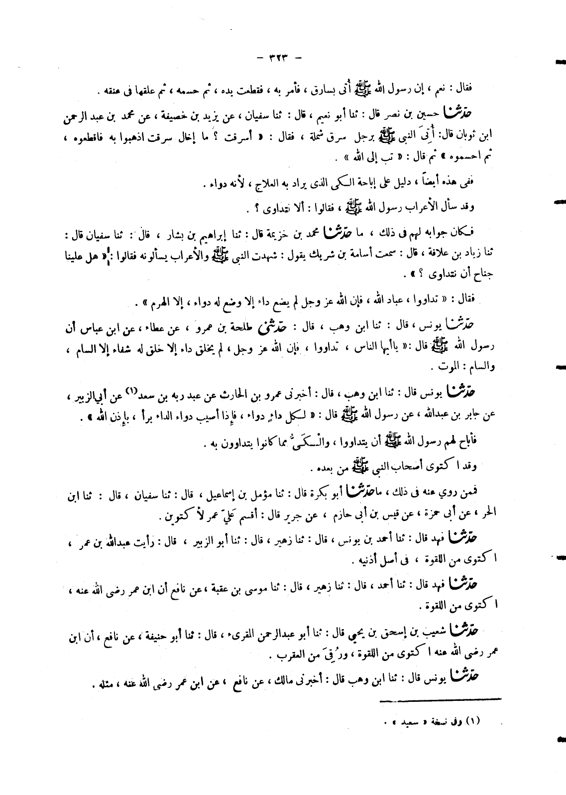 7157 - حَدَّثَنَا حُسَيْنُ بْنُ نَصْرٍ، قَالَ: ثنا أَبُو نُعَيْمٍ، قَالَ: ثنا سُفْيَانُ، عَنْ يَزِيدَ بْنِ خُصَيْفَةَ، عَنْ مُحَمَّدِ بْنِ عَبْدِ الرَّحْمَنِ بْنِ ثَوْبَانَ، قَالَ: أُتِيَ النَّبِيَّ صَلَّى اللَّهُ عَلَيْهِ وَسَلَّمَ بِرَجُلٍ سَرَقَ شَمْلَةً , فَقَالَ: «§أَسَرَقْتَ؟ مَا إِخَالُ سَرَقْتَ اذْهَبُوا بِهِ فَاقْطَعُوهُ , ثُمَّ احْسِمُوهُ» ، ثُمَّ قَالَ: «تُبْ إِلَى اللهِ» فَفِي هَذِهِ أَيْضًا , دَلِيلٌ عَلَى إِبَاحَةِ الْكَيِّ الَّذِي يُرَادُ بِهِ الْعِلَاجُ , لِأَنَّهُ دَوَاءٌ وَقَدْ سَأَلَ الْأَعْرَابُ رَسُولَ اللهِ صَلَّى اللَّهُ عَلَيْهِ وَسَلَّمَ فَقَالُوا: أَلَا نَتَدَاوَى؟ . فَكَانَ جَوَابُهُ لَهُمْ فِي ذَلِكَ
