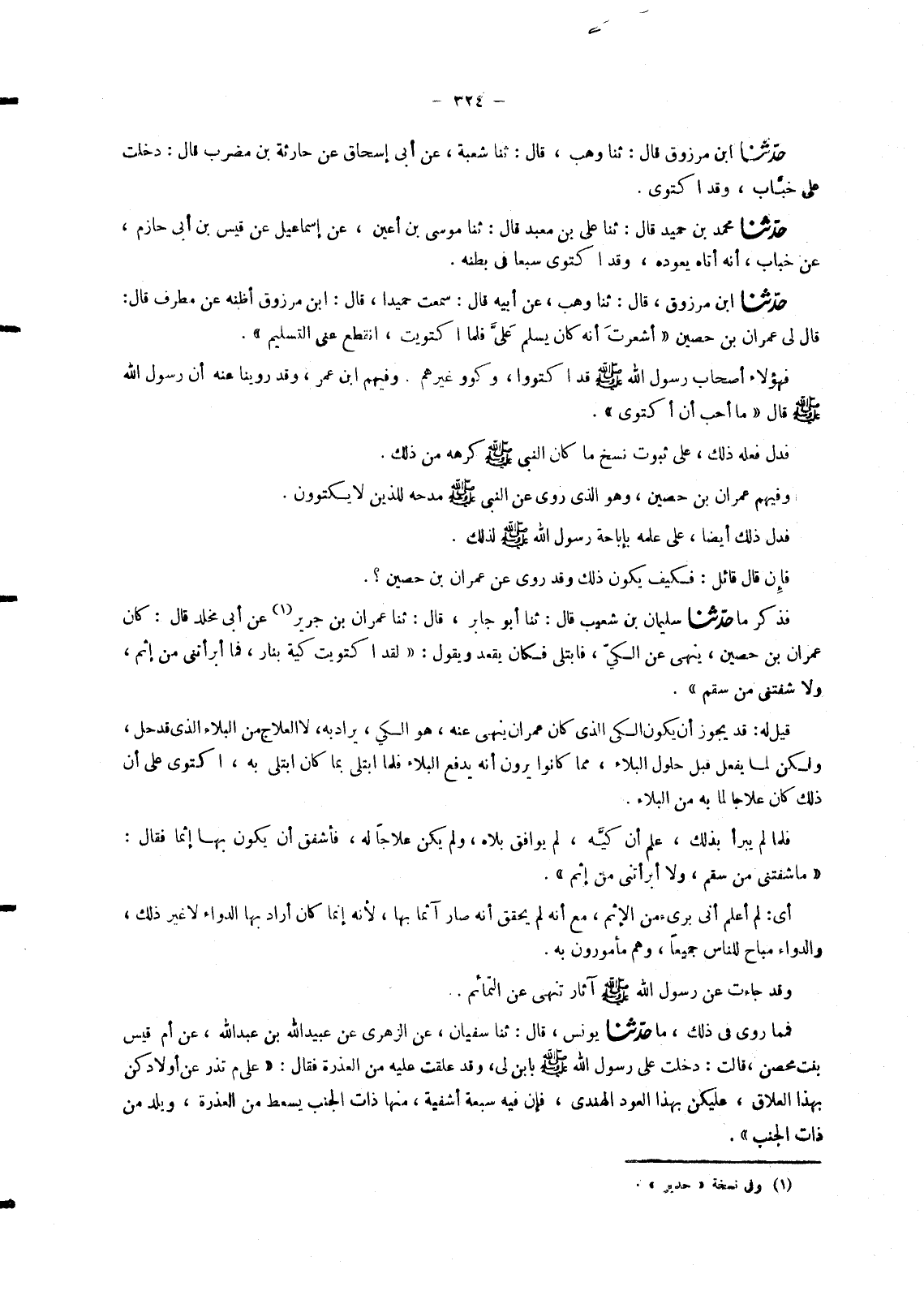 7168 - حَدَّثَنَا ابْنُ مَرْزُوقٍ، قَالَ: ثنا وَهْبٌ، عَنْ أَبِيهِ، قَالَ: سَمِعْتُ حُمَيْدًا، قَالَ: ابْنُ مَرْزُوقٍ أَظُنُّهُ عَنْ مُطَرِّفٍ، قَالَ: قَالَ لِي عِمْرَانُ بْنُ حُصَيْنٍ: «أَشَعَرَتْ أَنَّهُ كَانَ §يُسَلِّمُ عَلَيَّ فَلَمَّا اكْتَوَيْتُ , انْقَطَعَ عَنِّي التَّسْلِيمُ» فَهَؤُلَاءِ أَصْحَابُ رَسُولِ اللهِ صَلَّى اللَّهُ عَلَيْهِ وَسَلَّمَ قَدِ اكْتَوَوْا , وَكَوَوْا غَيْرَهُمْ. وَفِيهِمُ ابْنُ عُمَرَ , وَقَدْ رَوَيْنَا عَنْهُ أَنَّ رَسُولَ اللهِ صَلَّى اللَّهُ عَلَيْهِ وَسَلَّمَ قَالَ " مَا أُحِبُّ أَنْ أَكْتَوِيَ. فَدَلَّ فِعْلُهُ ذَلِكَ عَلَى ثُبُوتِ نَسْخِ مَا كَانَ النَّبِيُّ صَلَّى اللَّهُ عَلَيْهِ وَسَلَّمَ كَرِهَهُ مِنْ ذَلِكَ. وَفِيهِمْ عِمْرَانُ بْنُ حُصَيْنٍ وَهُوَ الَّذِي رُوِيَ عَنِ النَّبِيِّ صَلَّى اللَّهُ عَلَيْهِ وَسَلَّمَ مَدْحُهُ لِلَّذِينَ لَا يَكْتَوُونَ. فَدَلَّ ذَلِكَ أَيْضًا عَلَى عِلْمِهِ بِإِبَاحَةِ رَسُولِ اللهِ صَلَّى اللَّهُ عَلَيْهِ وَسَلَّمَ لِذَلِكَ. فَإِنْ قَالَ قَائِلٌ: فَكَيْفَ يَكُونُ ذَلِكَ وَقَدْ رُوِيَ عَنْ عِمْرَانَ بْنِ حُصَيْنٍ؟