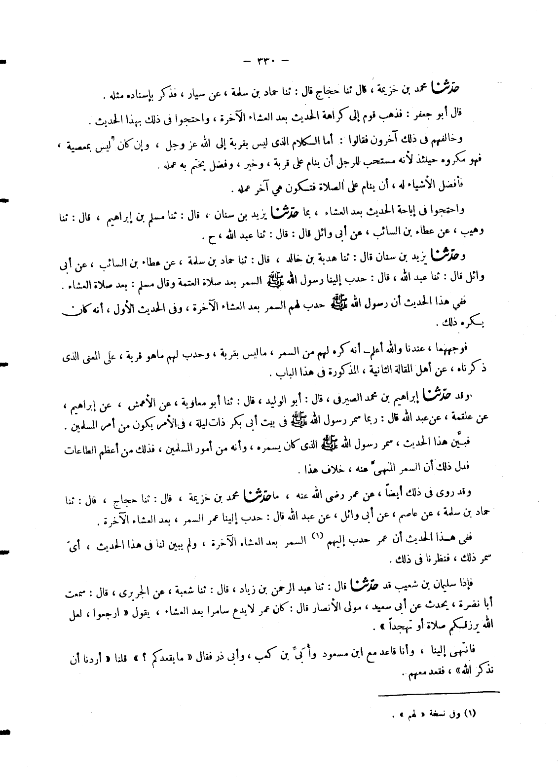 7204 - مَا حَدَّثَنَا مُحَمَّدُ بْنُ خُزَيْمَةَ قَالَ: ثنا حَجَّاجٌ قَالَ: ثنا حَمَّادُ بْنُ سَلَمَةَ عَنْ عَاصِمٍ عَنْ أَبِي وَائِلٍ عَنْ عَبْدِ اللهِ قَالَ: «§حَبَّبَ إِلَيْنَا عُمَرُ السَّمَرَ بَعْدَ الْعِشَاءِ الْآخِرَةِ» فَفِي هَذَا الْحَدِيثِ أَنَّ عُمَرَ حَبَّبَ إِلَيْهِمُ السَّمَرَ بَعْدَ الْعِشَاءِ الْآخِرَةِ , وَلَمْ يُبَيِّنْ لَنَا فِي هَذَا الْحَدِيثِ , أَيَّ سَمَرٍ ذَلِكَ فَنَظَرْنَا فِي ذَلِكَ