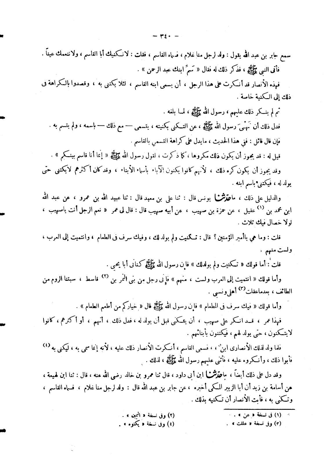 7249 -حَدَّثَنَا ابْنُ أَبِي دَاوُدَ قَالَ ثنا عَمْرُو بْنُ خَالِدٍ رَضِيَ اللهُ عَنْهُ قَالَ: ثنا ابْنُ لَهِيعَةَ عَنْ أُسَامَةَ بْنِ زَيْدٍ أَنَّ أَبَا الزُّبَيْرِ الْمَكِّيَّ أَخْبَرَهُ، عَنْ جَابِرِ بْنِ عَبْدِ اللهِ قَالَ: وُلِدَ لِرَجُلٍ مِنَّا غُلَامٌ , فَسَمَّاهُ الْقَاسِمَ وَتَكَنَّى بِهِ , فَأَبَتِ الْأَنْصَارُ أَنْ تُكَنِّيَهُ بِذَلِكَ. -[341]- فَبَلَغَ ذَلِكَ رَسُولَ اللهِ صَلَّى اللَّهُ عَلَيْهِ وَسَلَّمَ فَقَالَ: «أَحْسَنَتِ الْأَنْصَارُ , §تَسَمَّوْا بِاسْمِي , وَلَا تَكَنَّوْا بِكُنْيَتِي. فَفِي هَذَا الْحَدِيثِ مَا قَدْ دَلَّ عَلَى أَنَّ رَسُولَ اللهِ صَلَّى اللَّهُ عَلَيْهِ وَسَلَّمَ إِنَّمَا حَوَّلَ اسْمَ ذَلِكَ الصَّبِيِّ , لِأَنَّ أَبَاهُ تَكَنَّى بِهِ , فَحَوَّلَهُ إِلَى اسْمٍ يَجُوزُ لِأَبِيهِ التَّكَنِّي بِهِ. وَفِيهِ مَا يَدُلُّ عَلَى أَنَّ النَّهْيَ , إِنَّمَا قُصِدَ بِهِ إِلَى الْكُنْيَةِ خَاصَّةً , لَا إِلَى الْجَمْعِ بَيْنَهَا وَبَيْنَ الِاسْمِ , وَاللهُ تَعَالَى أَعْلَمُ»