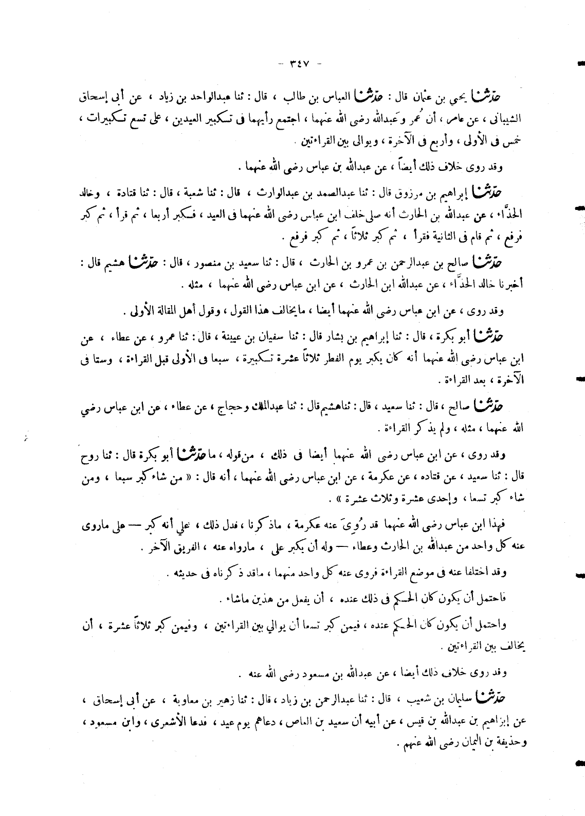 7278 - حَدَّثَنَا يَحْيَى بْنُ عُثْمَانَ قَالَ: حَدَّثَنَا الْعَبَّاسُ بْنُ طَالِبٍ قَالَ: ثنا عَبْدُ الْوَاحِدِ بْنُ زِيَادٍ عَنْ أَبِي إِسْحَاقَ الشَّيْبَانِيِّ عَنْ عَامِرٍ «أَنَّ عُمَرَ وَعَبْدَ اللهِ رَضِيَ اللهُ عَنْهُمَا , اجْتَمَعَ رَأْيُهُمَا فِي §تَكْبِيرِ الْعِيدَيْنِ عَلَى تِسْعِ تَكْبِيرَاتٍ , خَمْسٌ فِي الْأُولَى , وَأَرْبَعٌ فِي الْآخِرَةِ , وَيُوَالِي بَيْنَ الْقِرَاءَتَيْنِ.» وَقَدْ رُوِيَ خِلَافُ ذَلِكَ أَيْضًا عَنْ عَبْدِ اللهِ بْنِ عَبَّاسٍ رَضِيَ اللهُ عَنْهُمَا