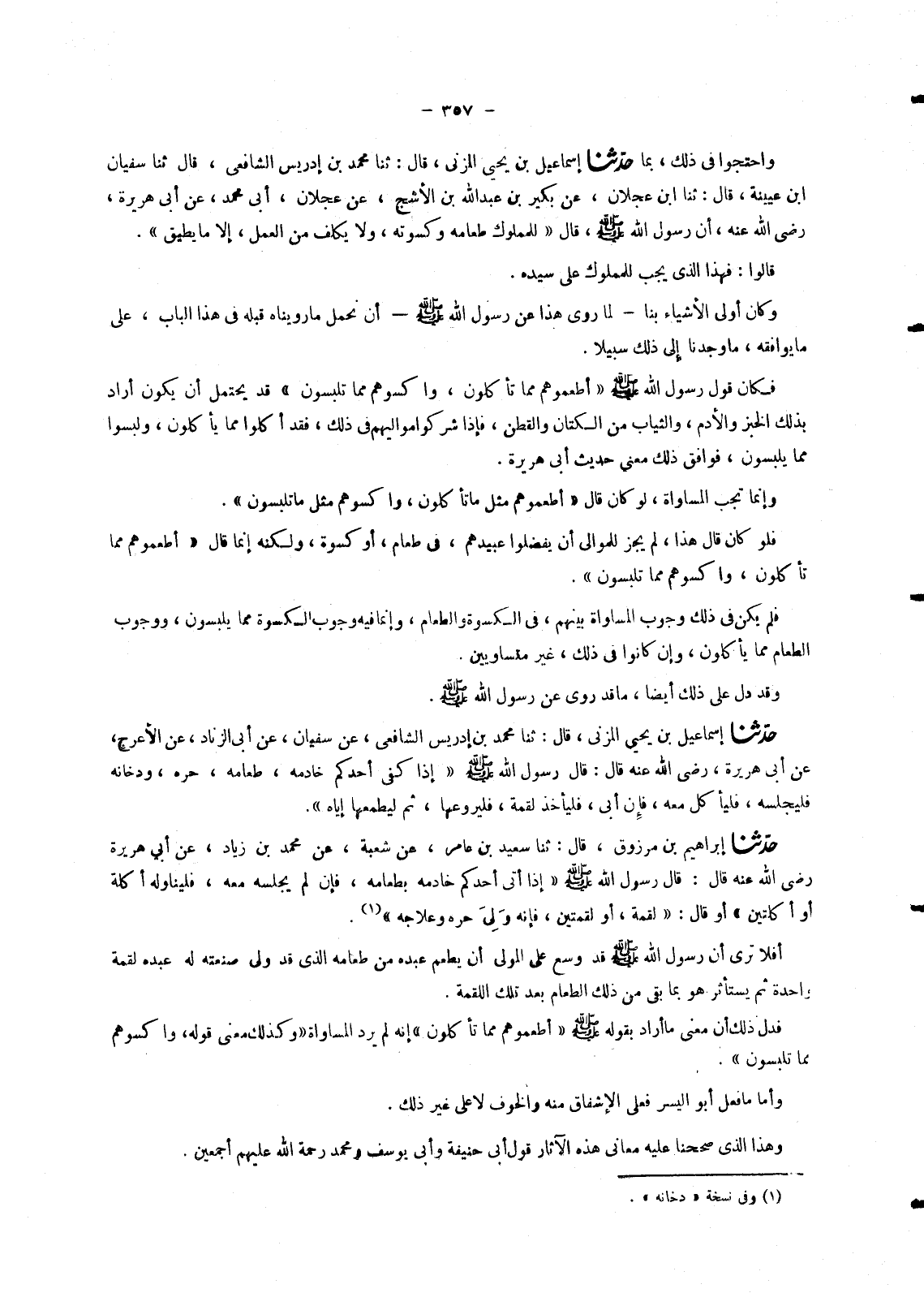 7314 - بِمَا حَدَّثَنَا إِسْمَاعِيلُ بْنُ يَحْيَى الْمُزَنِيُّ قَالَ: ثنا مُحَمَّدُ بْنُ إِدْرِيسَ الشَّافِعِيُّ قَالَ ثنا سُفْيَانُ بْنُ عُيَيْنَةَ , قَالَ: ثنا ابْنُ عَجْلَانَ عَنْ بُكَيْرِ بْنِ عَبْدِ اللهِ بْنِ الْأَشَجِّ عَنْ عَجْلَانَ أَبِي مُحَمَّدٍ عَنْ أَبِي هُرَيْرَةَ رَضِيَ اللهُ عَنْهُ أَنَّ رَسُولَ اللهِ صَلَّى اللَّهُ عَلَيْهِ وَسَلَّمَ قَالَ: «§لِلْمَمْلُوكِ طَعَامُهُ وَكِسْوَتُهُ , وَلَا يُكَلَّفُ مِنَ الْعَمَلِ إِلَّا مَا يُطِيقُ» قَالُوا: فَهَذَا الَّذِي يَجِبُ لِلْمَمْلُوكِ عَلَى سَيِّدِهِ. وَكَانَ أَوْلَى الْأَشْيَاءِ بِنَا لِمَا رُوِيَ هَذَا عَنْ رَسُولِ اللهِ صَلَّى اللَّهُ عَلَيْهِ وَسَلَّمَ أَنْ نَحْمِلَ مَا رَوَيْنَاهُ قَبْلَهُ فِي هَذَا الْبَابِ عَلَى مَا يُوَافِقُهُ , مَا وَجَدْنَا إِلَى ذَلِكَ سَبِيلًا. فَكَانَ قَوْلُ رَسُولِ اللهِ صَلَّى اللَّهُ عَلَيْهِ وَسَلَّمَ أَطْعِمُوهُمْ مِمَّا تَأْكُلُونَ , وَاكْسُوهُمْ مِمَّا تَلْبَسُونَ قَدْ يُحْتَمَلُ أَنْ يَكُونَ أَرَادَ بِذَلِكَ الْخُبْزَ وَالْأُدْمَ , وَالثِّيَابَ مِنَ الْكَتَّانِ وَالْقُطْنِ , فَإِذَا شَرِكُوا مَوَالِيَهُمْ فِي ذَلِكَ فَقَدْ أَكَلُوا مِمَّا يَأْكُلُونَ , وَلَبِسُوا مِمَّا يَلْبَسُونَ , فَوَافَقَ ذَلِكَ مَعْنَى حَدِيثِ أَبِي هُرَيْرَةَ. وَإِنَّمَا تَجِبُ الْمُسَاوَاةُ , لَوْ كَانَ قَالَ أَطْعِمُوهُمْ مِثْلَ مَا تَأْكُلُونَ , وَاكْسُوهُمْ مِثْلَ مَا تَلْبَسُونَ. فَلَوْ كَانَ قَالَ هَذَا لَمْ يَجُزْ لِلْمَوَالِي أَنْ يُفَضِّلُوا عَبِيدَهُمْ فِي طَعَامٍ , أَوْ كِسْوَةٍ , وَلَكِنَّهُ إِنَّمَا قَالَ أَطْعِمُوهُمْ مِمَّا تَأْكُلُونَ , وَاكْسُوهُمْ مِمَّا تَلْبَسُونَ. فَلَمْ يَكُنْ فِي ذَلِكَ وُجُوبُ الْمُسَاوَاةِ بَيْنَهُمْ , فِي الْكِسْوَةِ وَالطَّعَامِ , وَإِنَّمَا فِيهِ وُجُوبُ الْكِسْوَةِ مِمَّا يَلْبَسُونَ , وَوُجُوبُ الطَّعَامِ مِمَّا يَأْكُلُونَ , وَإِنْ كَانُوا فِي ذَلِكَ غَيْرَ مُتَسَاوِيَيْنِ. وَقَدْ دَلَّ عَلَى ذَلِكَ أَيْضًا مَا قَدْ رُوِيَ عَنْ رَسُولِ اللهِ صَلَّى اللَّهُ عَلَيْهِ وَسَلَّمَ
