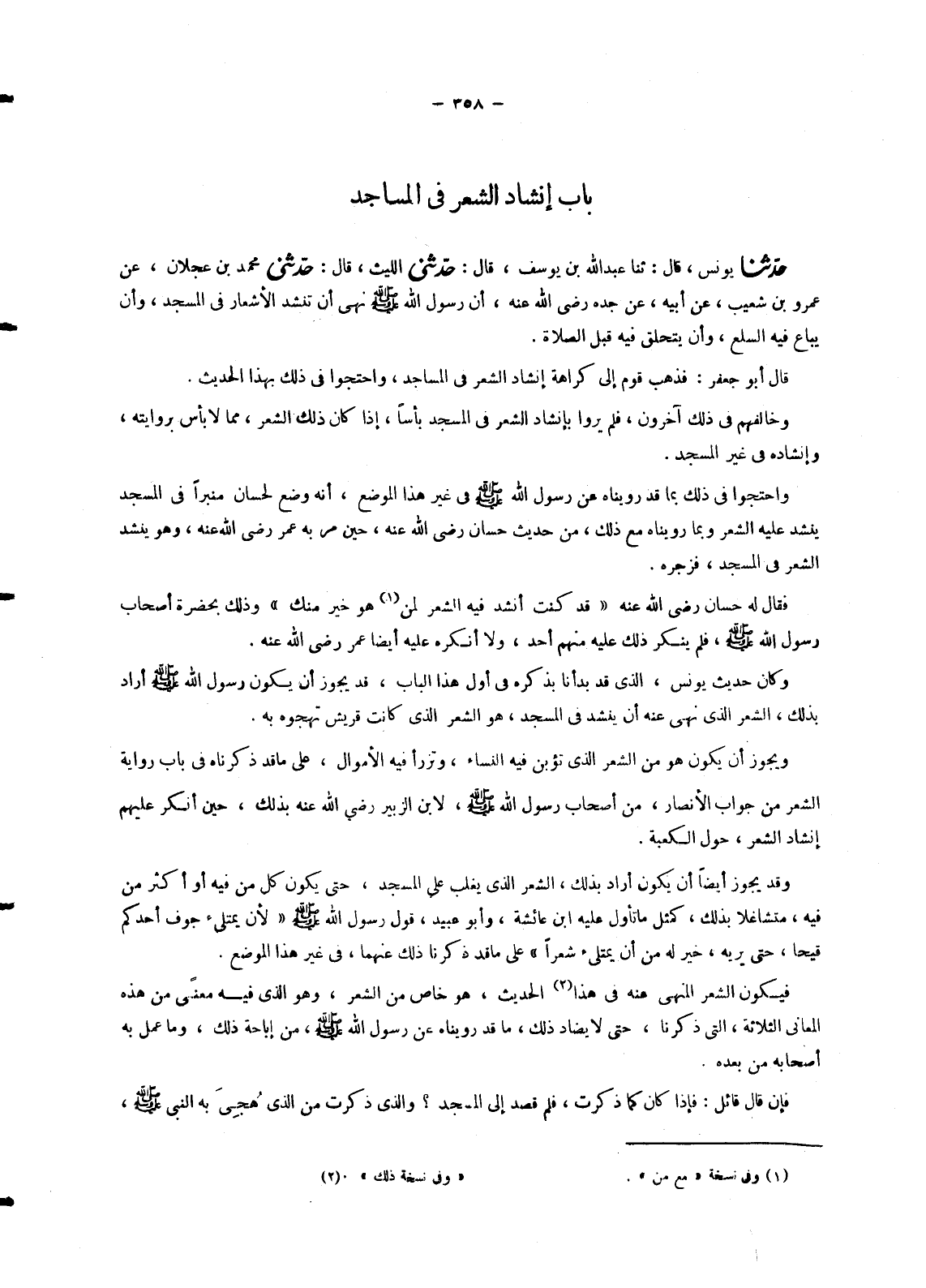 7317 - حَدَّثَنَا يُونُسُ قَالَ: ثنا عَبْدُ اللهِ بْنُ يُوسُفَ قَالَ: حَدَّثَنِي اللَّيْثُ قَالَ: حَدَّثَنِي مُحَمَّدُ بْنُ عَجْلَانَ عَنْ عَمْرِو بْنِ شُعَيْبٍ عَنْ أَبِيهِ عَنْ جَدِّهِ رَضِيَ اللهُ عَنْهُ , «أَنَّ رَسُولَ اللهِ صَلَّى اللَّهُ عَلَيْهِ وَسَلَّمَ §نَهَى أَنْ تُنْشَدَ الْأَشْعَارُ فِي الْمَسْجِدِ , وَأَنْ يُبَاعَ فِيهِ السِّلَعُ وَأَنْ يَتَحَلَّقَ فِيهِ قَبْلَ الصَّلَاةِ» قَالَ أَبُو جَعْفَرٍ: فَذَهَبَ قَوْمٌ إِلَى كَرَاهَةِ إِنْشَادِ الشِّعْرِ فِي الْمَسَاجِدِ , وَاحْتَجُّوا فِي ذَلِكَ بِهَذَا الْحَدِيثِ. وَخَالَفَهُمْ فِي ذَلِكَ آخَرُونَ , فَلَمْ يَرَوْا بِإِنْشَادِ الشِّعْرِ فِي الْمَسْجِدِ بَأْسًا إِذَا كَانَ ذَلِكَ الشِّعْرُ مِمَّا لَا بَأْسَ بِرِوَايَتِهِ وَإِنْشَادِهِ فِي غَيْرِ الْمَسْجِدِ. وَاحْتَجُّوا فِي ذَلِكَ بِمَا قَدْ رَوَيْنَاهُ عَنْ رَسُولِ اللهِ صَلَّى اللَّهُ عَلَيْهِ وَسَلَّمَ فِي غَيْرِ هَذَا الْمَوْضِعِ , أَنَّهُ وَضَعَ لِحَسَّانٍ مِنْبَرًا فِي الْمَسْجِدِ يَنْشُدُ عَلَيْهِ الشِّعْرَ وَبِمَا رَوَيْنَاهُ مَعَ ذَلِكَ مِنْ حَدِيثِ حَسَّانٍ رَضِيَ اللهُ عَنْهُ , حِينَ مَرَّ بِهِ عُمَرُ رَضِيَ اللهُ عَنْهُ وَهُوَ يَنْشُدُ الشِّعْرَ فِي الْمَسْجِدِ , فَزَجَرَهُ. فَقَالَ لَهُ حَسَّانٌ رَضِيَ اللهُ عَنْهُ قَدْ كُنْتُ أَنْشُدُ فِيهِ الشِّعْرَ لِمَنْ هُوَ خَيْرٌ مِنْكَ وَذَلِكَ بِحَضْرَةِ أَصْحَابِ رَسُولِ اللهِ صَلَّى اللَّهُ عَلَيْهِ وَسَلَّمَ فَلَمْ يُنْكِرْ ذَلِكَ عَلَيْهِ مِنْهُمْ أَحَدٌ , وَلَا أَنْكَرَهُ عَلَيْهِ أَيْضًا عُمَرُ رَضِيَ اللهُ عَنْهُ. وَكَانَ حَدِيثُ يُونُسَ الَّذِي قَدْ بَدَأْنَا بِذِكْرِهِ فِي أَوَّلِ هَذَا الْبَابِ قَدْ يَجُوزُ أَنْ يَكُونَ رَسُولُ اللهِ صَلَّى اللَّهُ عَلَيْهِ وَسَلَّمَ أَرَادَ بِذَلِكَ الشِّعْرَ الَّذِي نَهَى عَنْهُ أَنْ يُنْشَدَ فِي الْمَسْجِدِ , هُوَ الشِّعْرُ الَّذِي كَانَتْ قُرَيْشٌ تَهْجُوهُ بِهِ. وَيَجُوزُ أَنْ يَكُونَ هُوَ مِنَ الشِّعْرِ الَّذِي تُؤَبَّنُ فِيهِ النِّسَاءُ , وَتُزْرَأُ فِيهِ الْأَمْوَالُ , عَلَى مَا قَدْ ذَكَرْنَاهُ فِي بَابِ رِوَايَةِ الشِّعْرِ مِنْ جَوَابِ الْأَنْصَارِ , مِنْ أَصْحَابِ رَسُولِ اللهِ صَلَّى اللَّهُ عَلَيْهِ وَسَلَّمَ لِابْنِ الزُّبَيْرِ رَضِيَ اللهُ عَنْهُ بِذَلِكَ حِينَ أَنْكَرَ عَلَيْهِمْ إِنْشَادَ الشِّعْرِ , حَوْلَ الْكَعْبَةِ. وَقَدْ يَجُوزُ أَيْضًا أَنْ يَكُونَ أَرَادَ بِذَلِكَ الشِّعْرَ الَّذِي يَغْلِبُ عَلَى الْمَسْجِدِ , حَتَّى يَكُونَ كُلُّ مَنْ فِيهِ أَوْ أَكْثَرُ مَنْ فِيهِ , مُتَشَاغِلًا بِذَلِكَ كَمَثَلِ مَا تَأَوَّلَ عَلَيْهِ ابْنُ عَائِشَةَ وَأَبُو عُبَيْدٍ قَوْلَ رَسُولِ اللهِ صَلَّى اللَّهُ عَلَيْهِ وَسَلَّمَ لَأَنْ يَمْتَلِئَ جَوْفُ أَحَدِكُمْ قَيْحًا , حَتَّى يُرِيَهُ , خَيْرٌ لَهُ مِنْ أَنْ يَمْتَلِئَ شِعْرًا عَلَى مَا قَدْ ذَكَرْنَا ذَلِكَ عَنْهُمَا فِي غَيْرِ هَذَا الْمَوْضِعِ. فَيَكُونُ الشِّعْرُ الْمَنْهِيُّ عَنْهُ فِي هَذَا الْحَدِيثِ , هُوَ خَاصٌّ مِنَ الشِّعْرِ وَهُوَ الَّذِي فِيهِ مَعْنًى مِنْ هَذِهِ الْمَعَانِي الثَّلَاثَةِ , الَّتِي ذَكَرْنَا , حَتَّى لَا يُضَادَّ ذَلِكَ مَا قَدْ رَوَيْنَاهُ عَنْ رَسُولِ اللهِ صَلَّى اللَّهُ عَلَيْهِ وَسَلَّمَ مِنْ إِبَاحَةِ ذَلِكَ وَمَا عَمِلَ بِهِ أَصْحَابُهُ مِنْ بَعْدِهِ. فَإِنْ قَالَ قَائِلٌ: فَإِذَا كَانَ كَمَا ذَكَرْتَ , فَلِمَ قَصَدَ إِلَى الْمَسْجِدِ؟ وَالَّذِي ذَكَرْتَ مِنَ الَّذِي هُجِيَ بِهِ النَّبِيُّ صَلَّى اللَّهُ عَلَيْهِ وَسَلَّمَ -[359]- وَالَّذِي أُبِّنَتْ فِيهِ النِّسَاءُ , وَرُزِئَتْ فِيهِ الْأَمْوَالُ , مَكْرُوهٌ فِي غَيْرِ الْمَسْجِدِ , وَلَوْ كَانَ كَمَا ذَكَرْتَ لَمْ يَكُنْ لِذِكْرِ