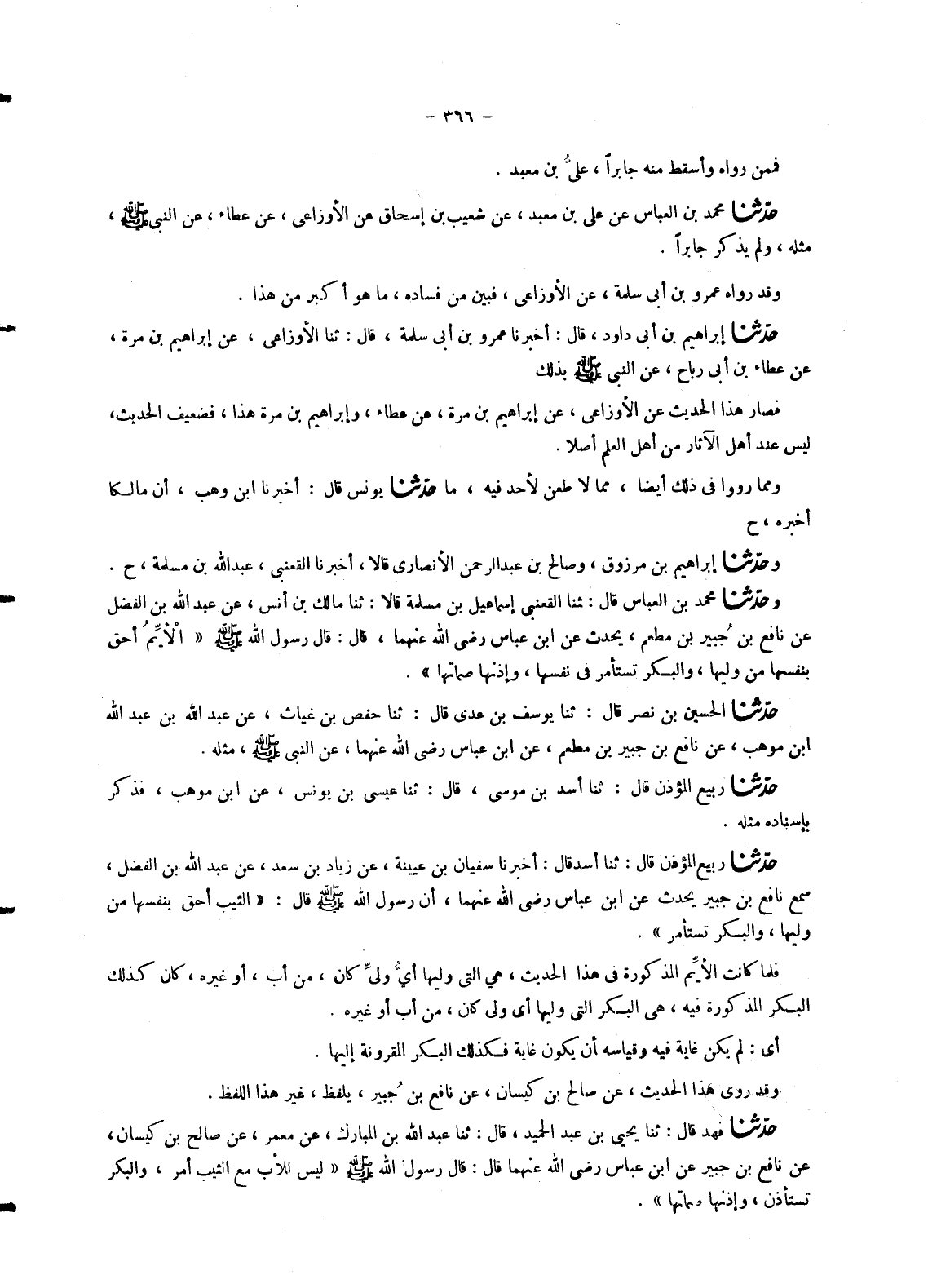 7339 - وَحَدَّثَنَا مُحَمَّدُ بْنُ الْعَبَّاسِ قَالَ: ثنا الْقَعْنَبِيُّ إِسْمَاعِيلُ بْنُ مَسْلَمَةَ قَالَا: ثنا مَالِكُ بْنُ أَنَسٍ عَنْ عَبْدِ اللهِ بْنِ الْفَضْلِ عَنْ نَافِعِ بْنِ جُبَيْرِ بْنِ مُطْعِمٍ يُحَدِّثُ عَنِ ابْنِ عَبَّاسٍ رَضِيَ اللهُ عَنْهُمَا , قَالَ: قَالَ رَسُولُ اللهِ صَلَّى اللَّهُ عَلَيْهِ وَسَلَّمَ: «§الْأَيِّمُ أَحَقُّ بِنَفْسِهَا مِنْ وَلِيِّهَا , وَالْبِكْرُ تُسْتَأْمَرُ فِي نَفْسِهَا , وَإِذْنُهَا صُمَاتُهَا»